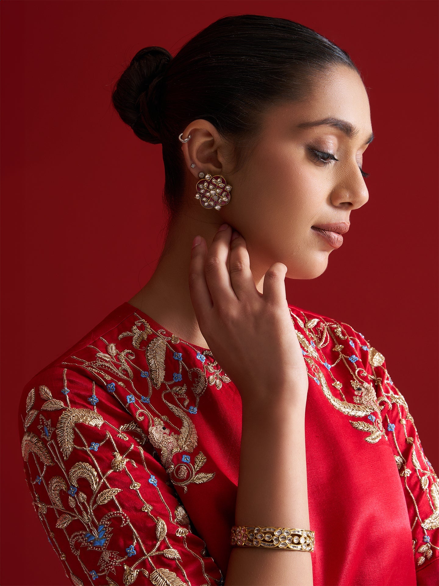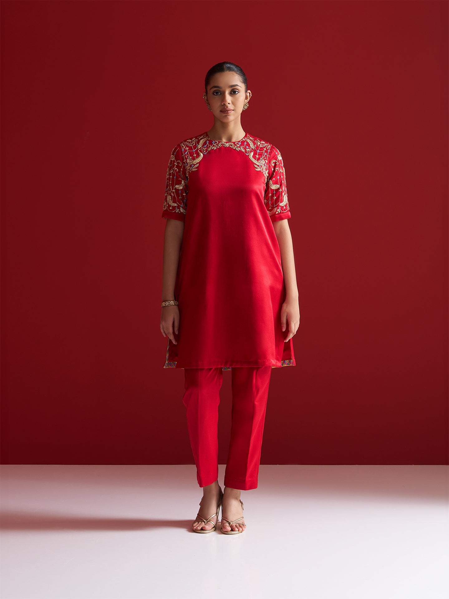 Fierce yet graceful, this vibrant red kurta set is a celebration of heritage and power. The kurta is adorned with intricate hand embroidery featuring majestic Yali tigers-mythical creatures symbolising strength and protection. Detailed with traditional dabka, naqshi, beads, and contrasting blue resham thread, the embroidery brings the motifs to life with stunning dimension. It is paired with matching straight pants.