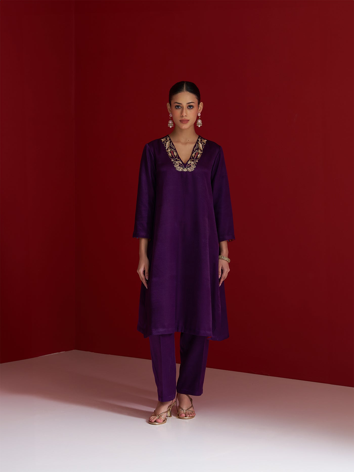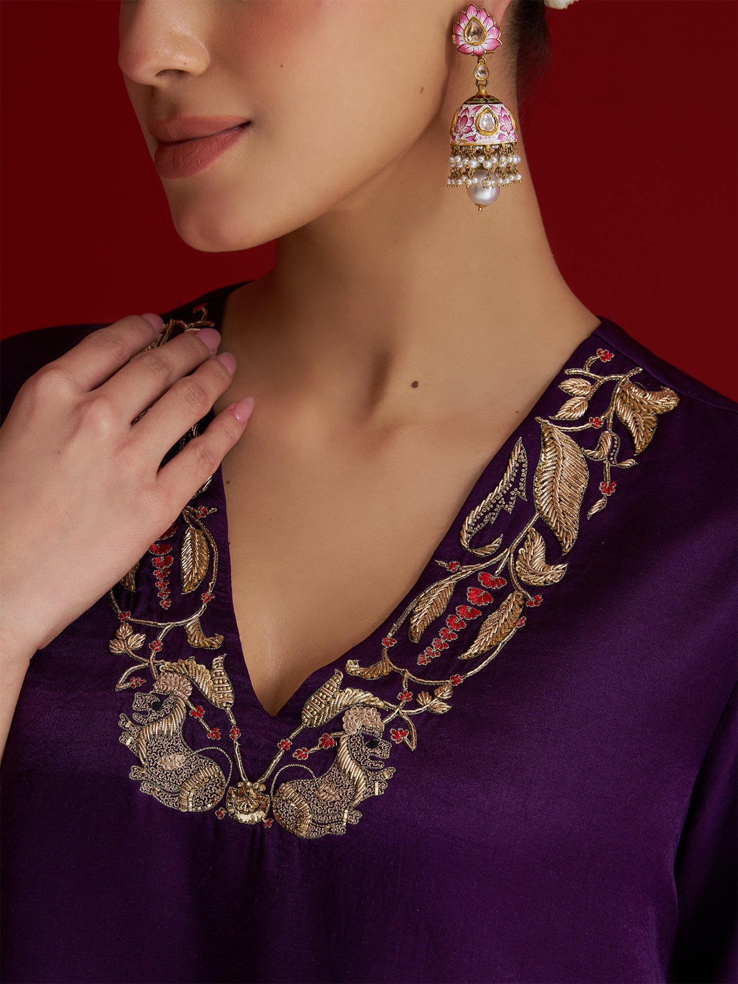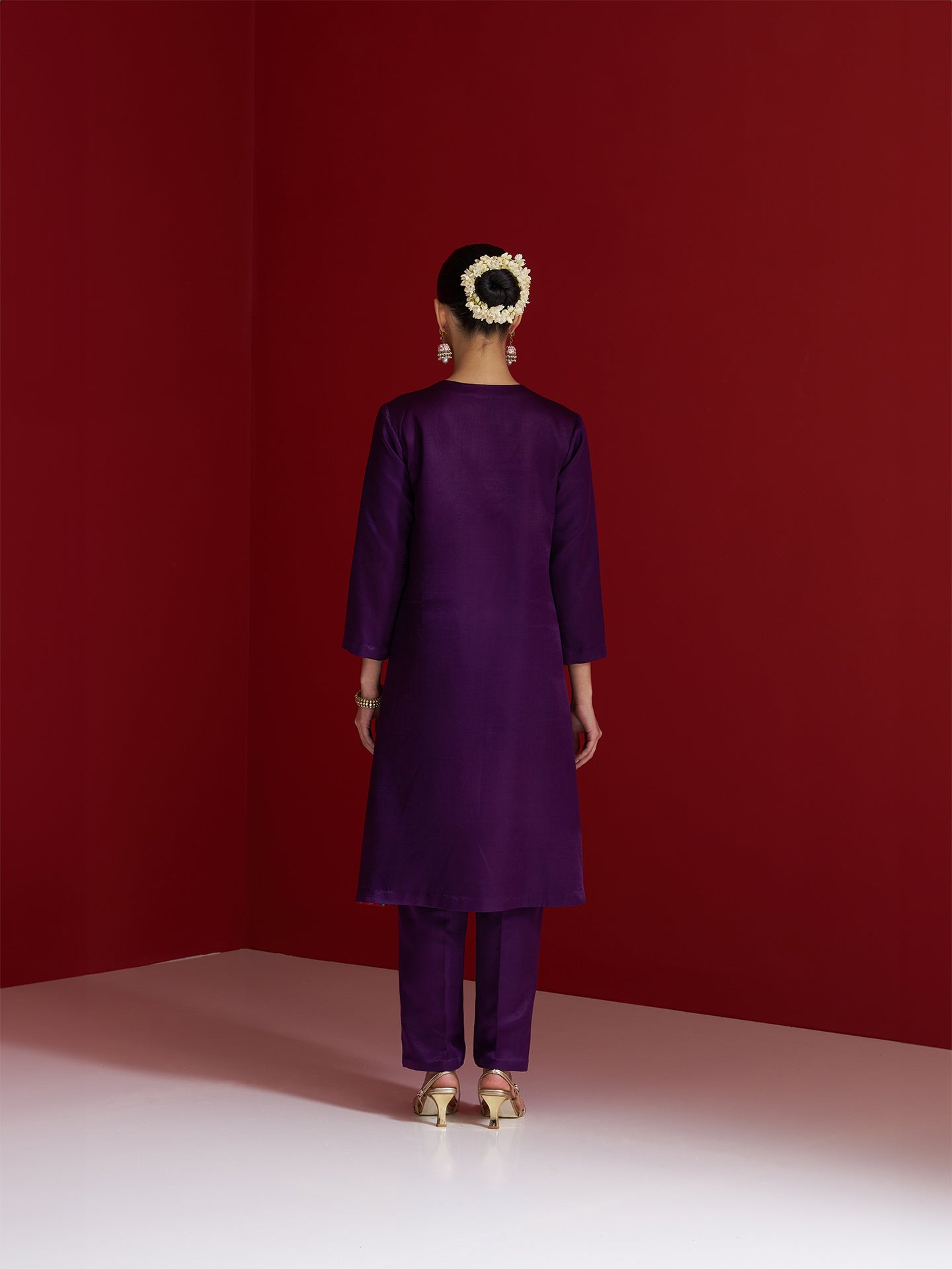 Crafted in lustrous Gajji silk, this ivory kurta set exudes understated elegance with a touch of intricate artistry. The kurta features unique chaand-shaped pockets, delicately embellished with zari and hand-embroidered using dabka, naqshi, and sequins in fine floral motifs. The subtle V-neckline and clean silhouette are paired with straight pants in a matching hue.