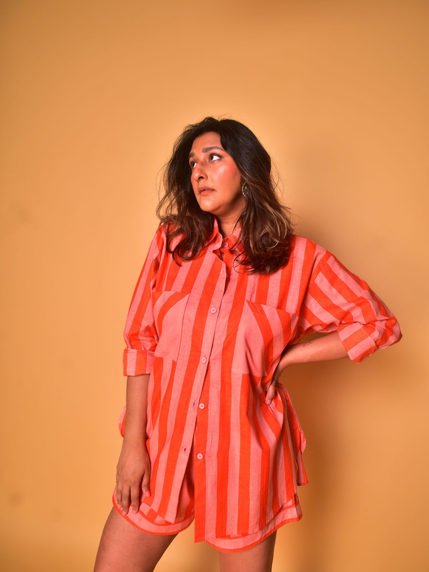 Lounge for days in this effortlessly-chic co-ord set! Cut in our exclusive orange and peach striped cotton, this oversized statement shirt has self-printed pockets with peach highlights. Paired with eclectic shorts made for comfort, with an elasticated waist and pockets on both sides. Throw in our May Bralette cut in the same print for the a head-turning summer look.