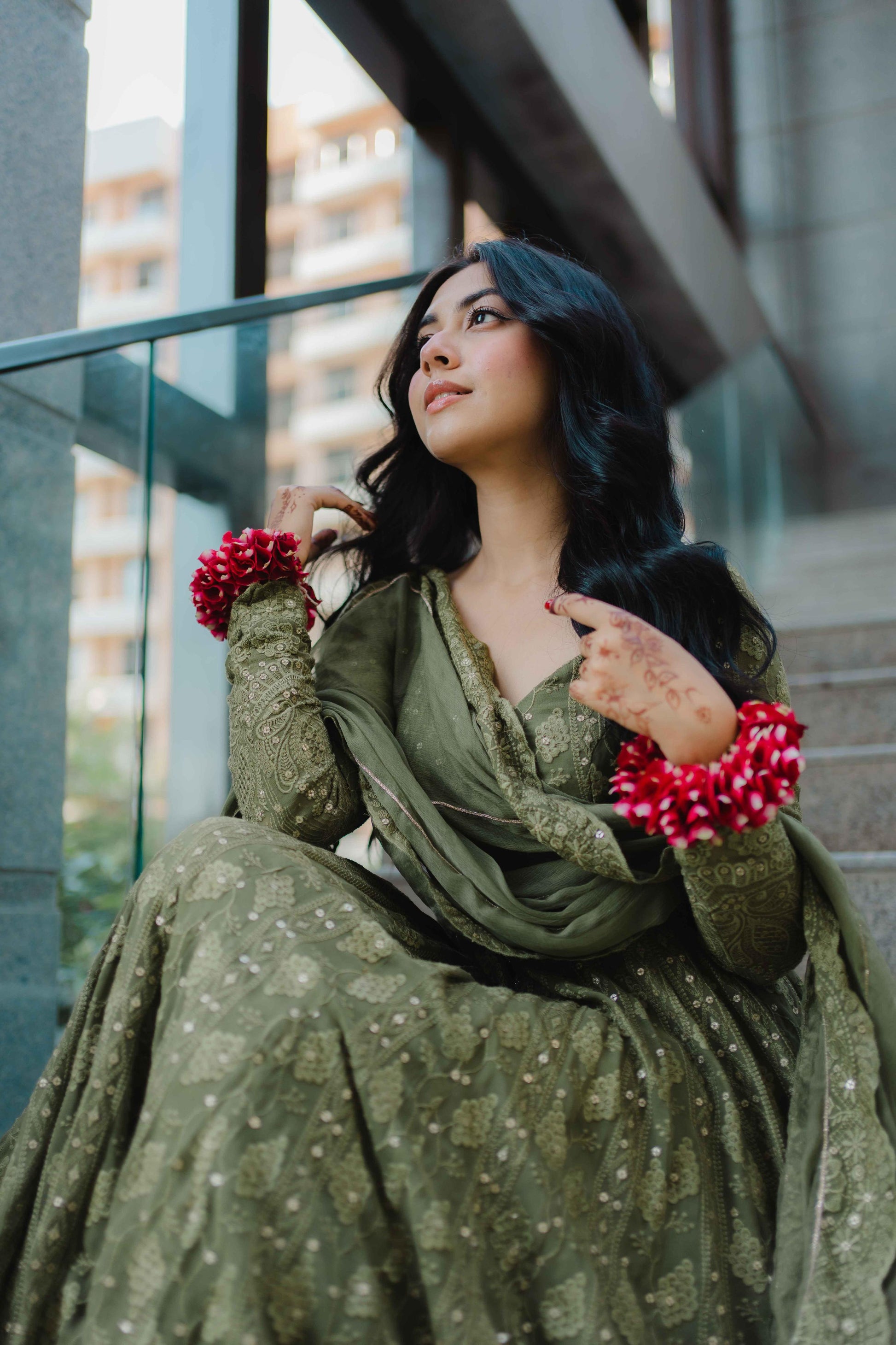 Mehndi Green Chikankari Anarkali Suit Set (SET OF 3)