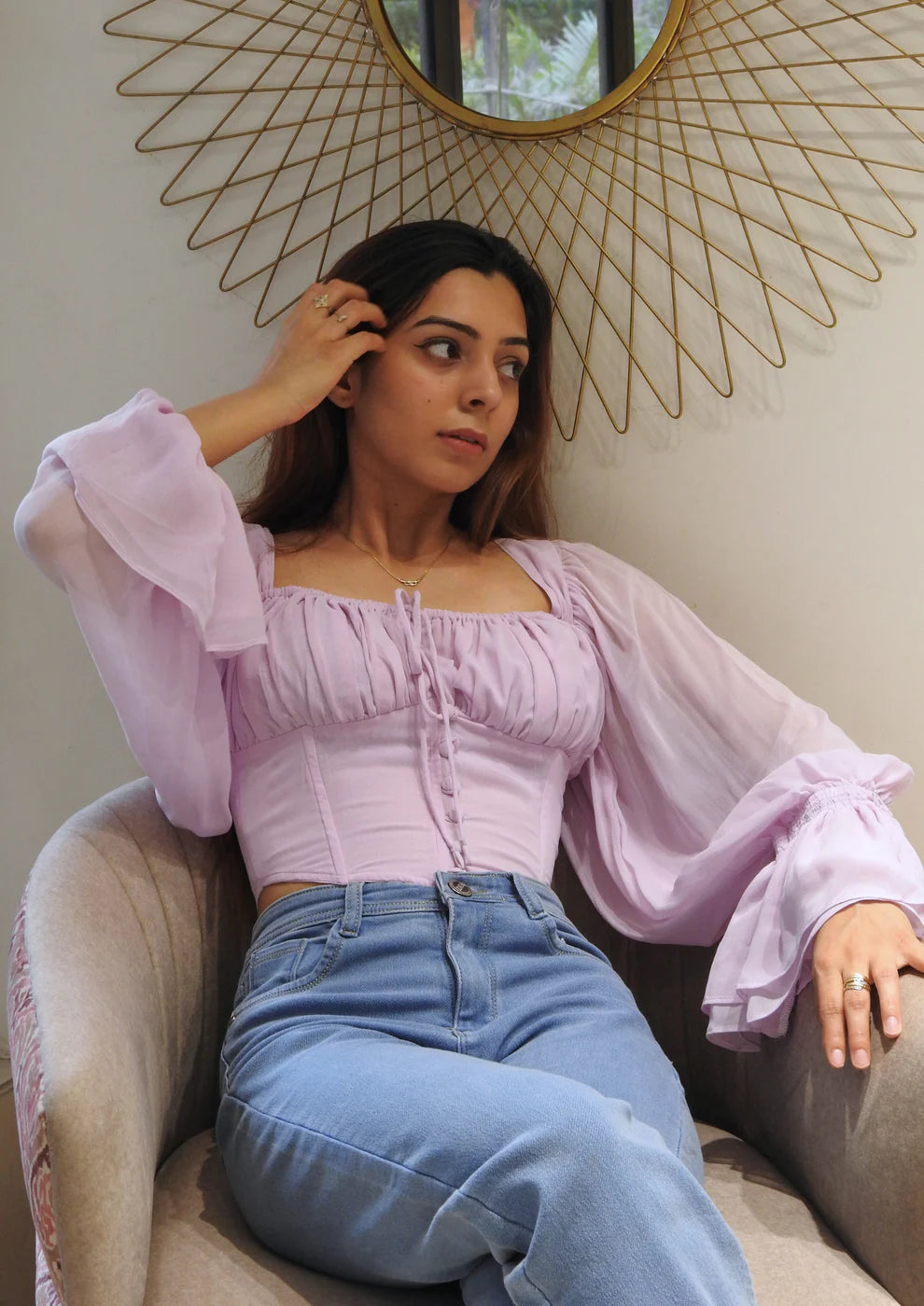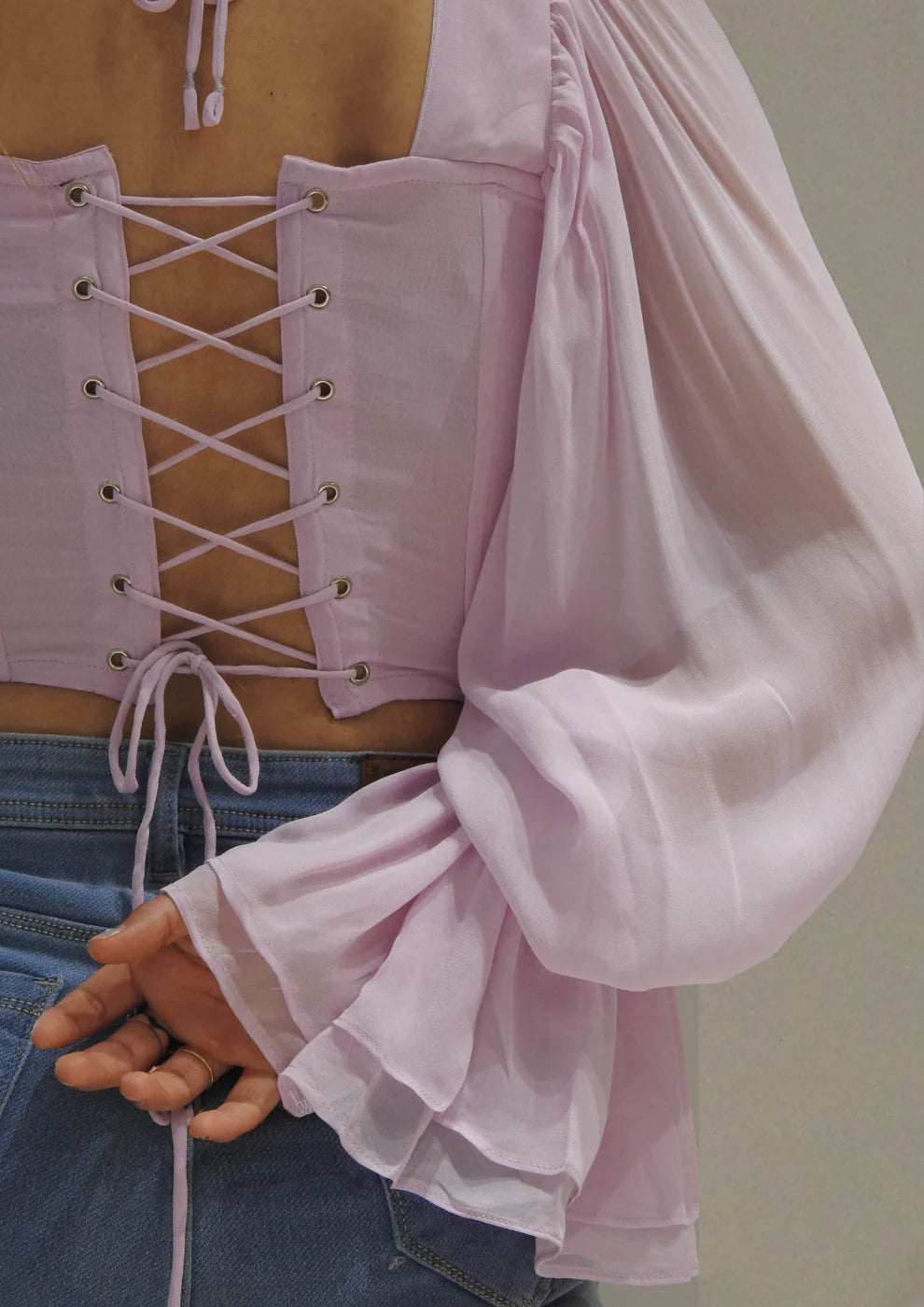A whisper of romance — this top features frilled full sleeves, a gathered bustier, and a criss-cross back for elegant whimsy.