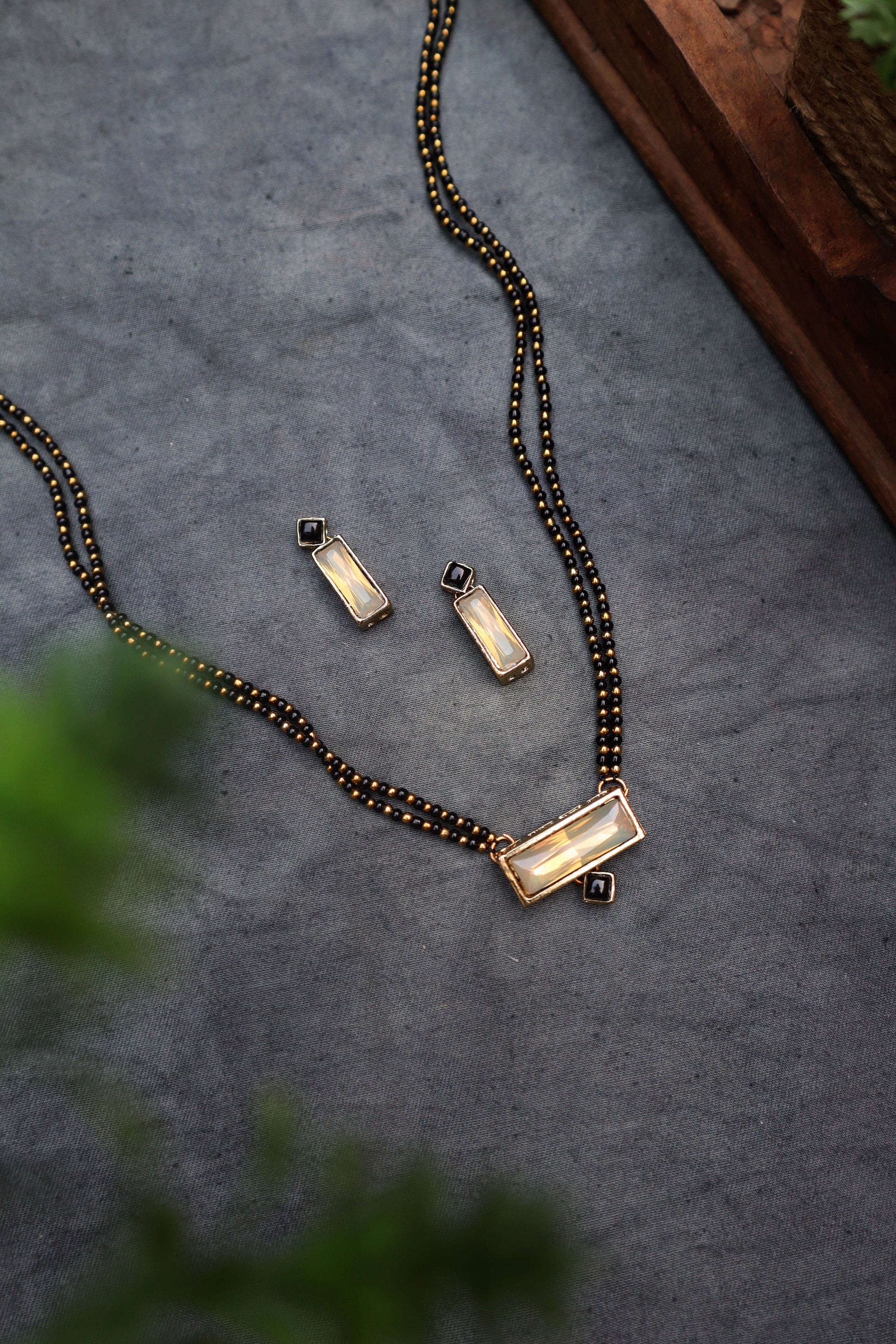 Celebrate this Karva Chauth with our newly launched mangalsutra collection. Go a little experimental with our Minimalist Golden Baguette Mangalsutra Necklace Set! With the classic dual gold and black beads string and the golden baguette crystal as pendant, this necklace balances the traditional and modern perfectly. It comes with a pair of matching earrings that completes the look.
