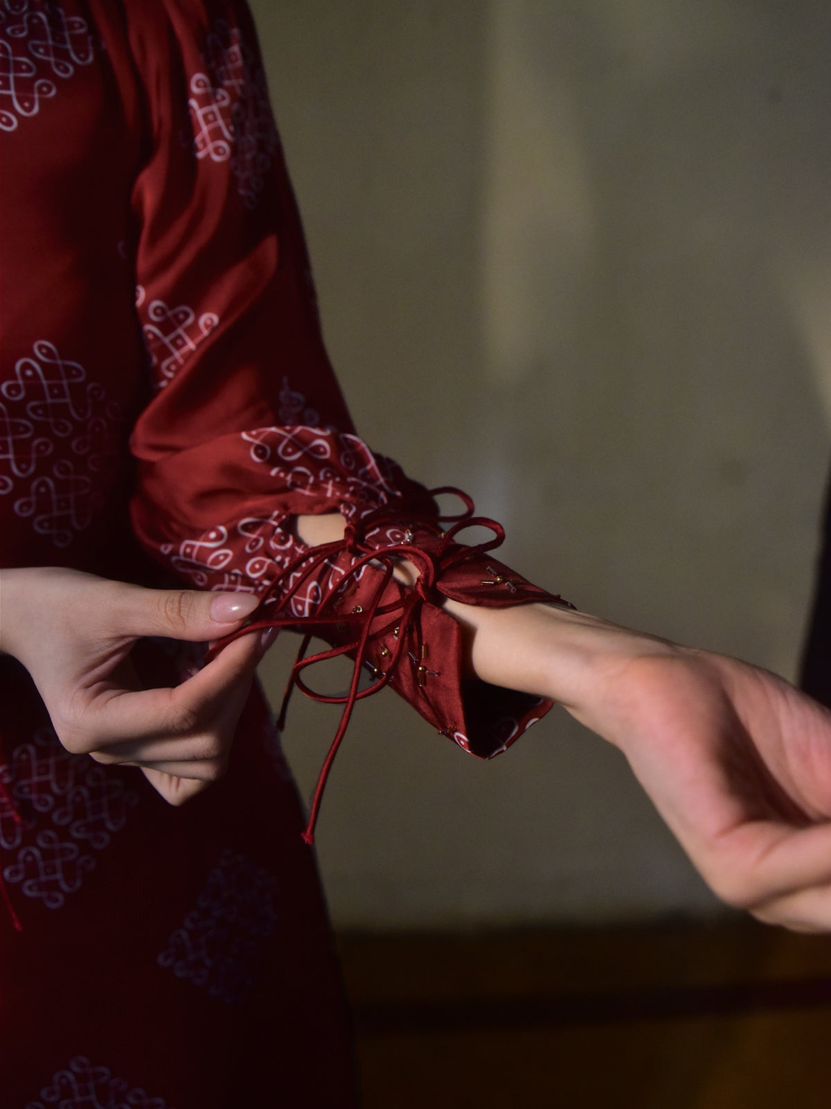 | This long A line dress in maroon kolam printed modal satin offers timeless elegance with a cultural edge. Featuring a flattering V neckline, full length balloon sleeves with hand embroidered exaggerated cuffs, side pockets, and a beautifully detailed embroidered belt to accentuate the waist. Ideal for formal meetings, workplace events, or day-to-evening transitions. Style it with classic pumps and a structured handbag to complete the professional yet graceful ensemble. |