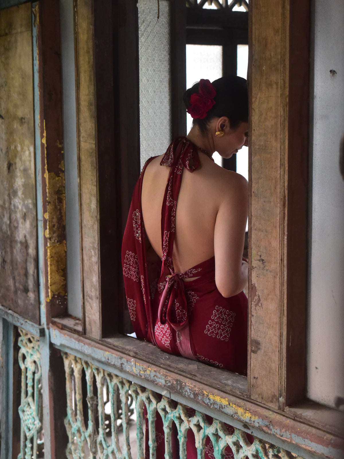 | Make a timeless statement in this luxurious 6-yard saree crafted in our exclusive maroon kolam printed modal satin. Light and breezy, the saree features intricate embroidery and tassel embellishments, paired with a halter neck blouse that’s padded for comfort and adorned with delicate hand embroidery. The tie-up back adds a festive flair to this coordinated look. Perfect for weddings and evening festivities, style it with traditional jhumkas and embellished potli. |