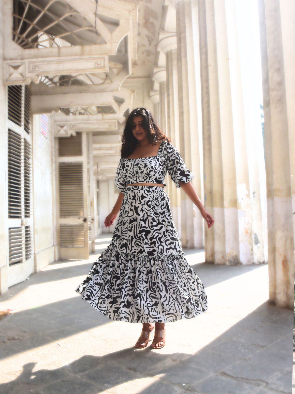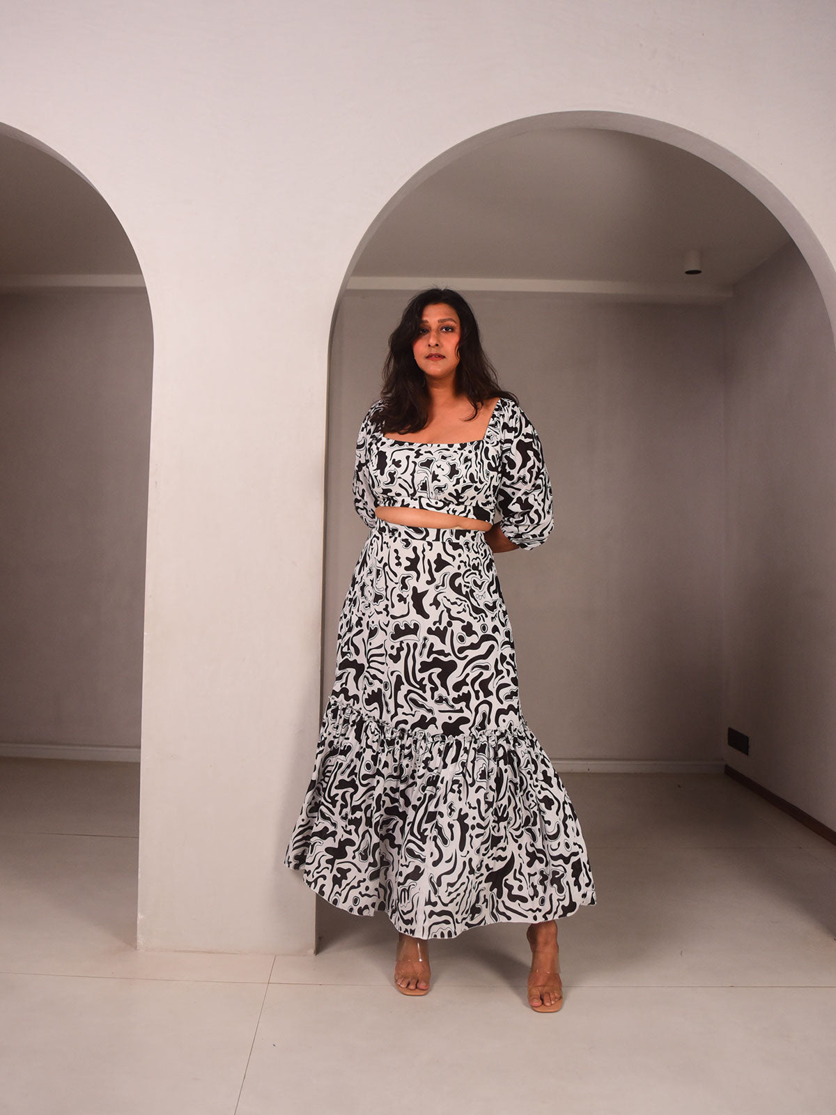Soft, smooth, and full of personality. Cut from our exclusive black and white hand-screen printed cotton. This set has a long, swishy skirt with ruffles and an off-shoulder crop top. Easily adjustable elasticated shoulders, you can wear the top as you like. Date night or hosting friends, this look makes every occasion better.