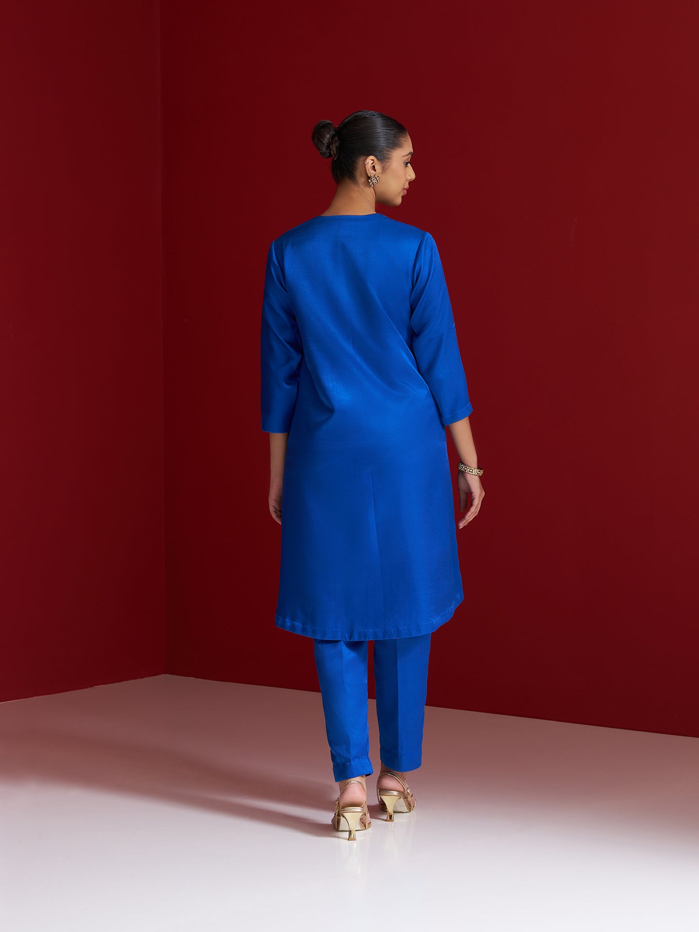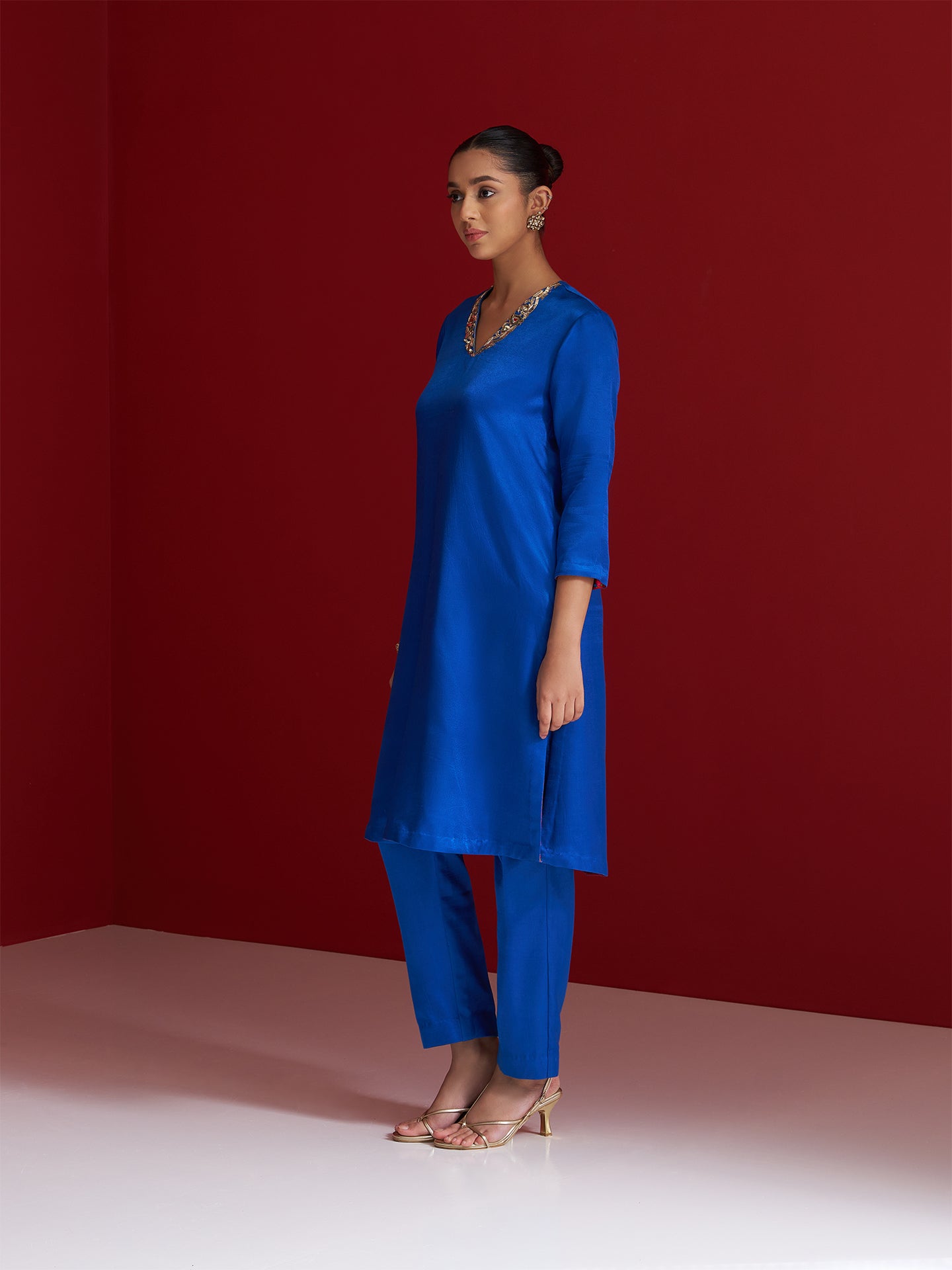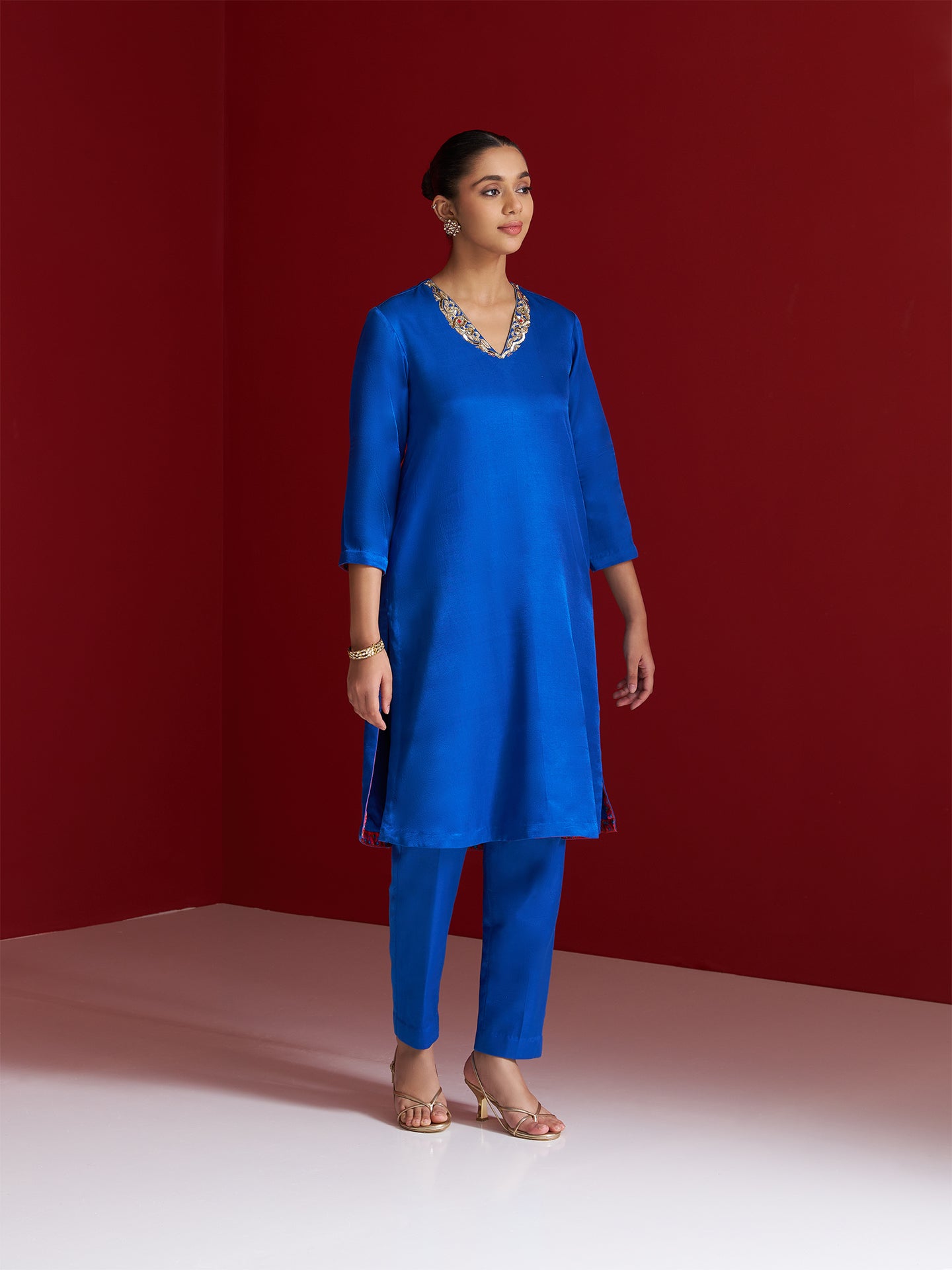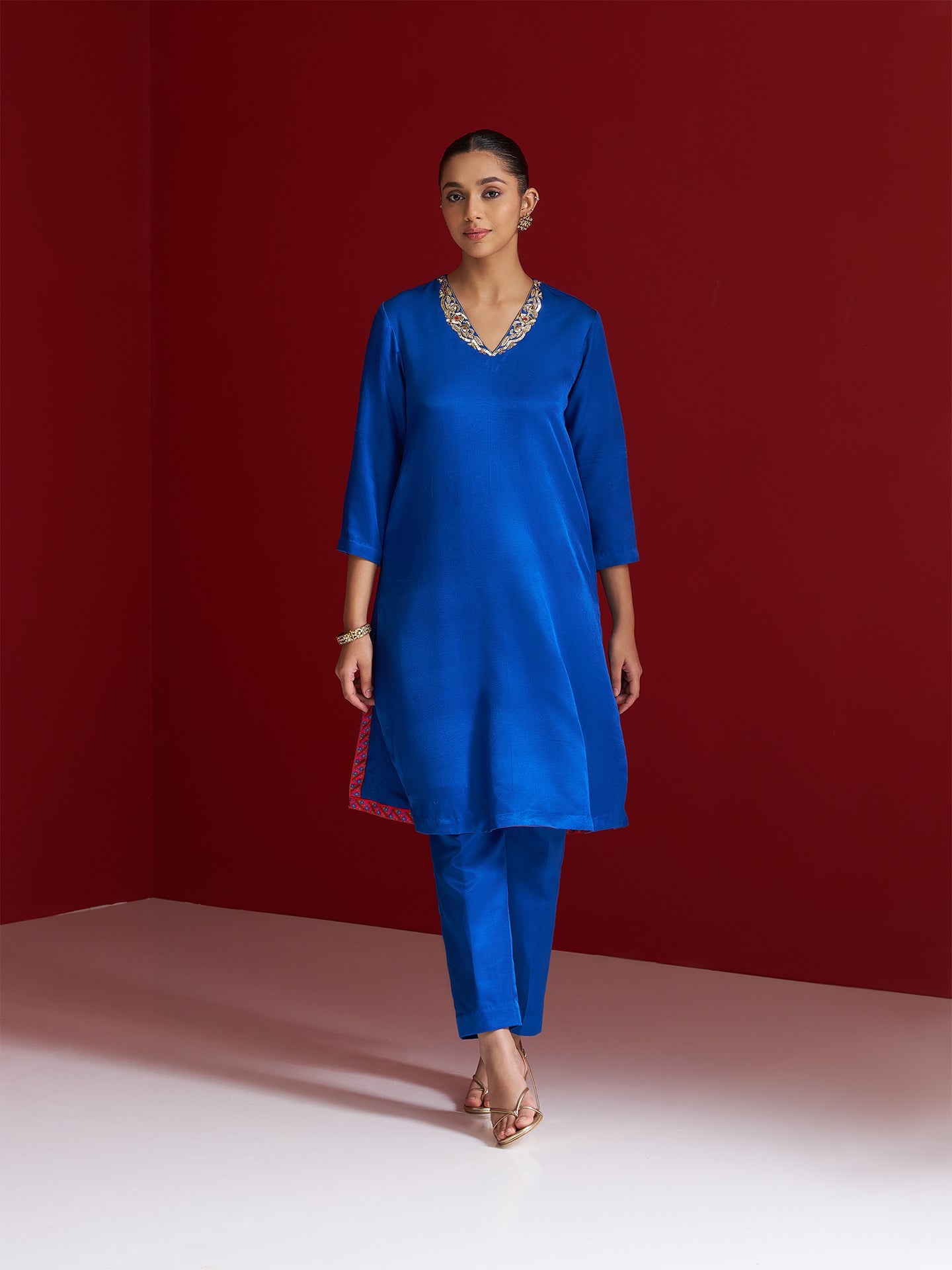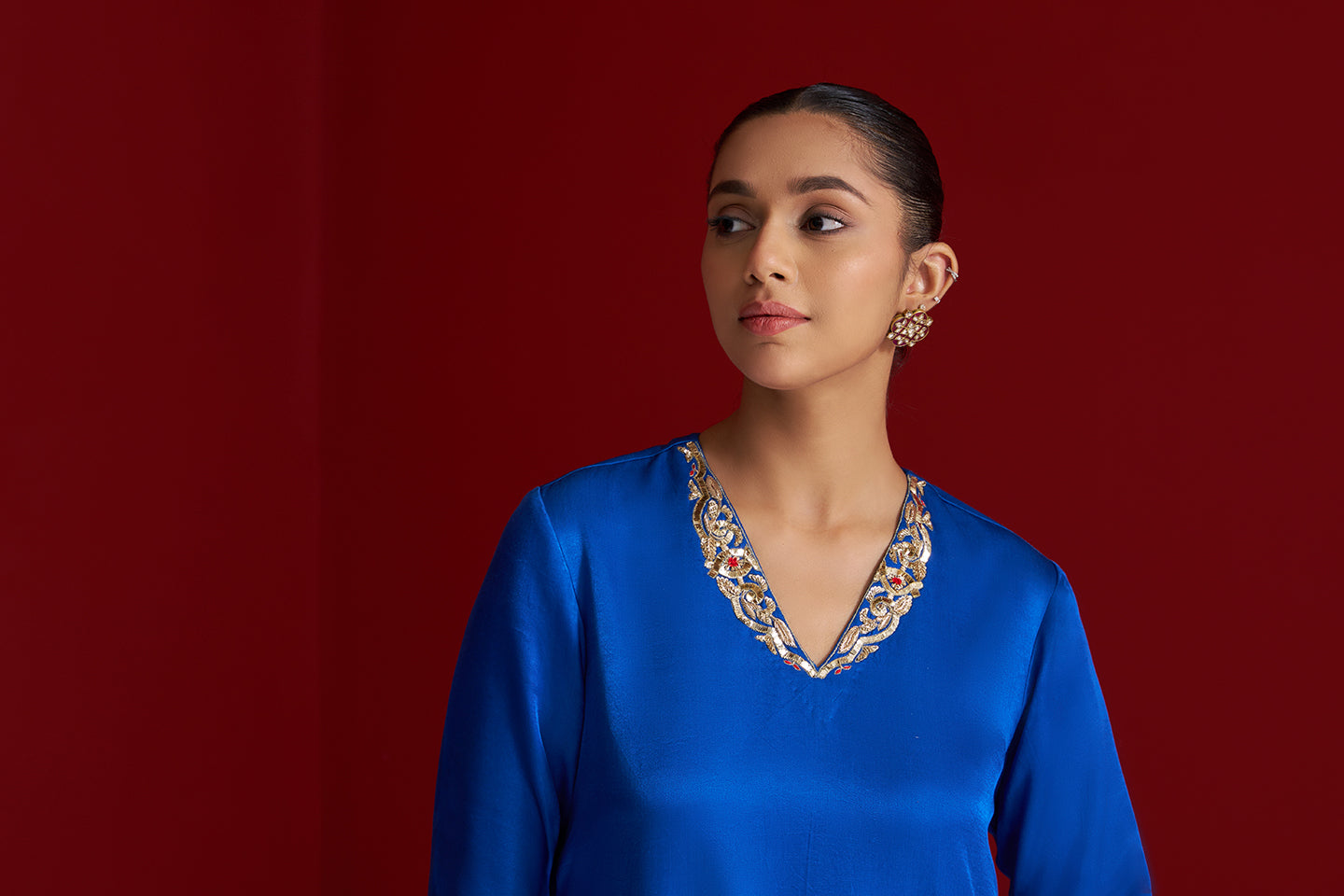 This Blue kurta set is crafted in luxurious Gajji silk. Featuring intricate zardozi and sequin embroidery along with contrasting resham work on the neckline. It is paired with matching straight pants blending traditional craftsmanship with modern elegance.