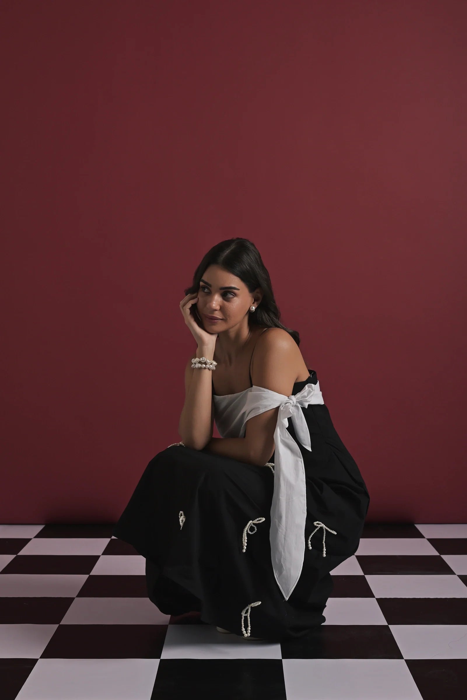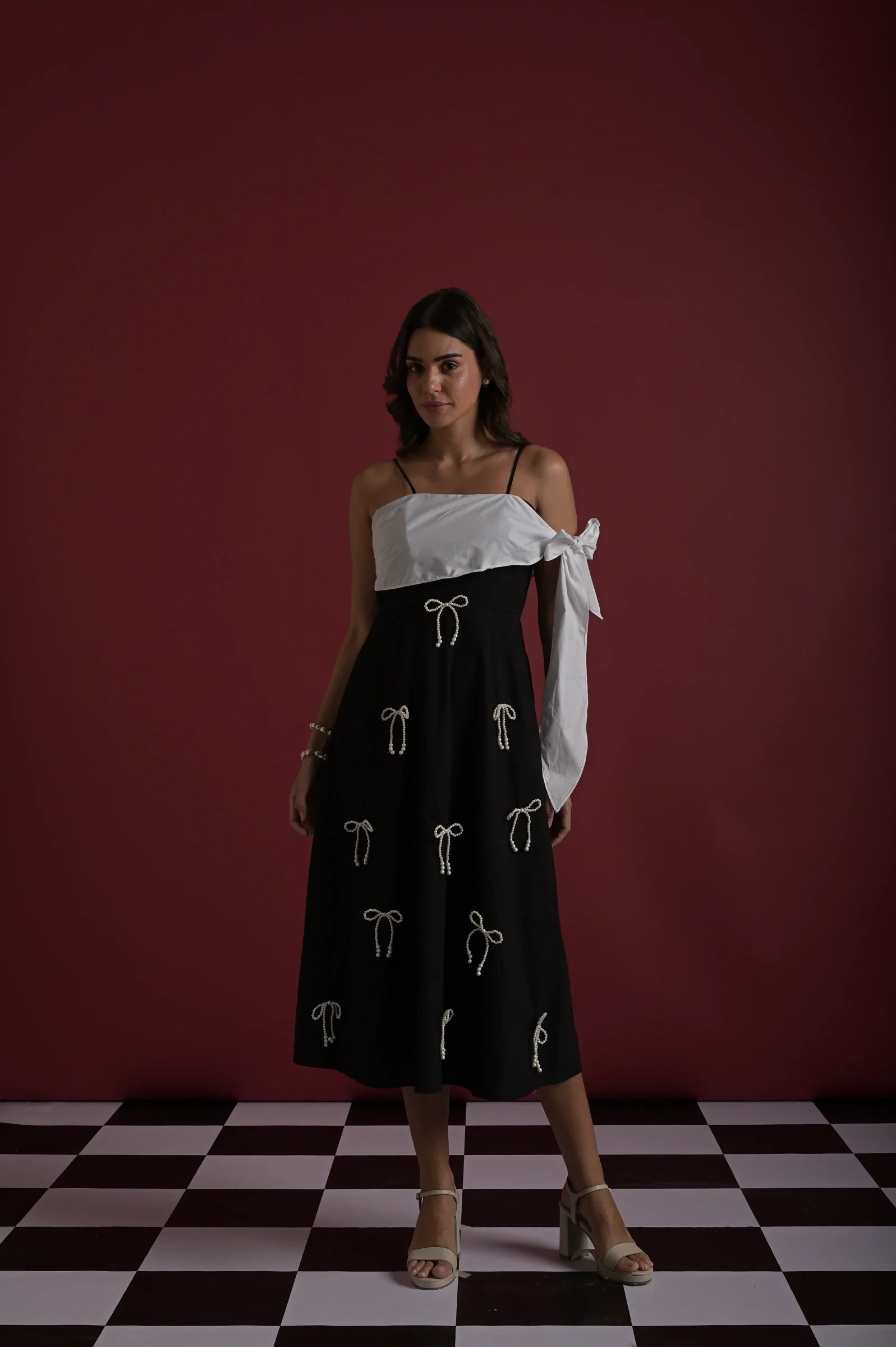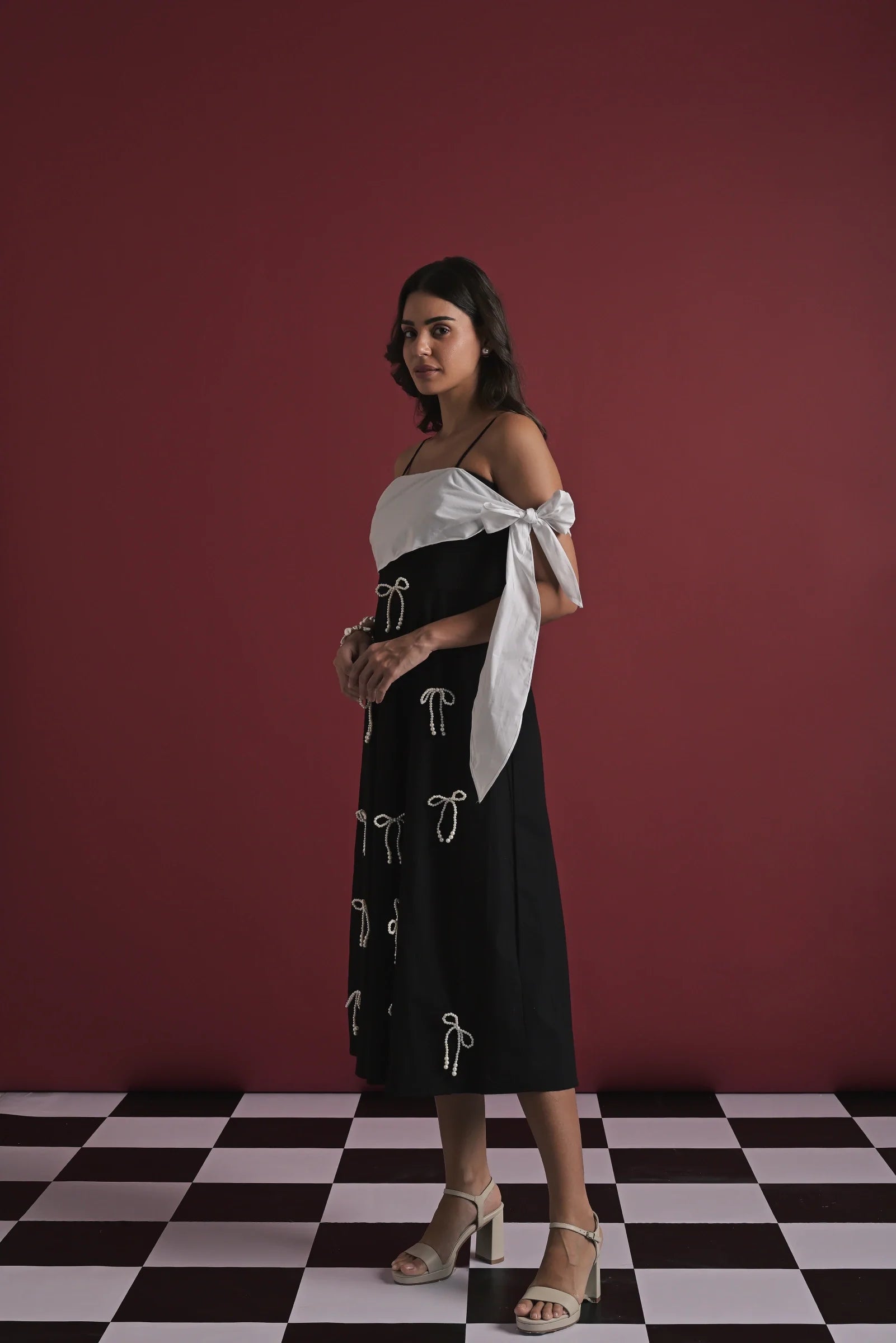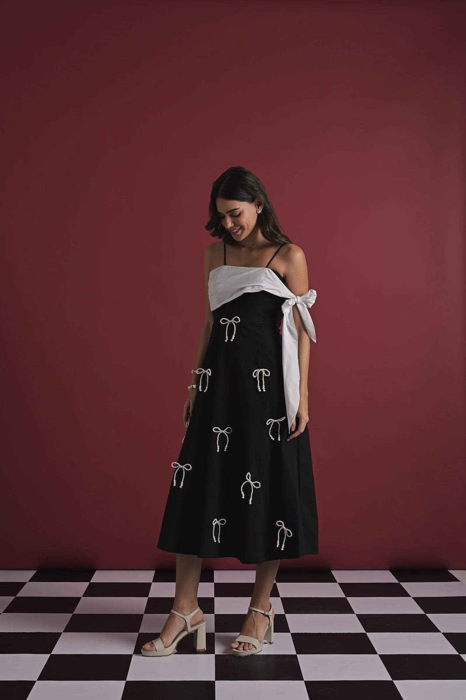 A statement black midi dress designed with playful handcrafted charm. The dress features delicate spaghetti straps, a contrast white draped bust detail that ties into a bold side bow, and scattered white rope-tie embellishments throughout the skirt for a unique, signature touch. Effortlessly feminine yet contemporary, this piece is perfect for brunches, get-togethers, or standout evening styling.