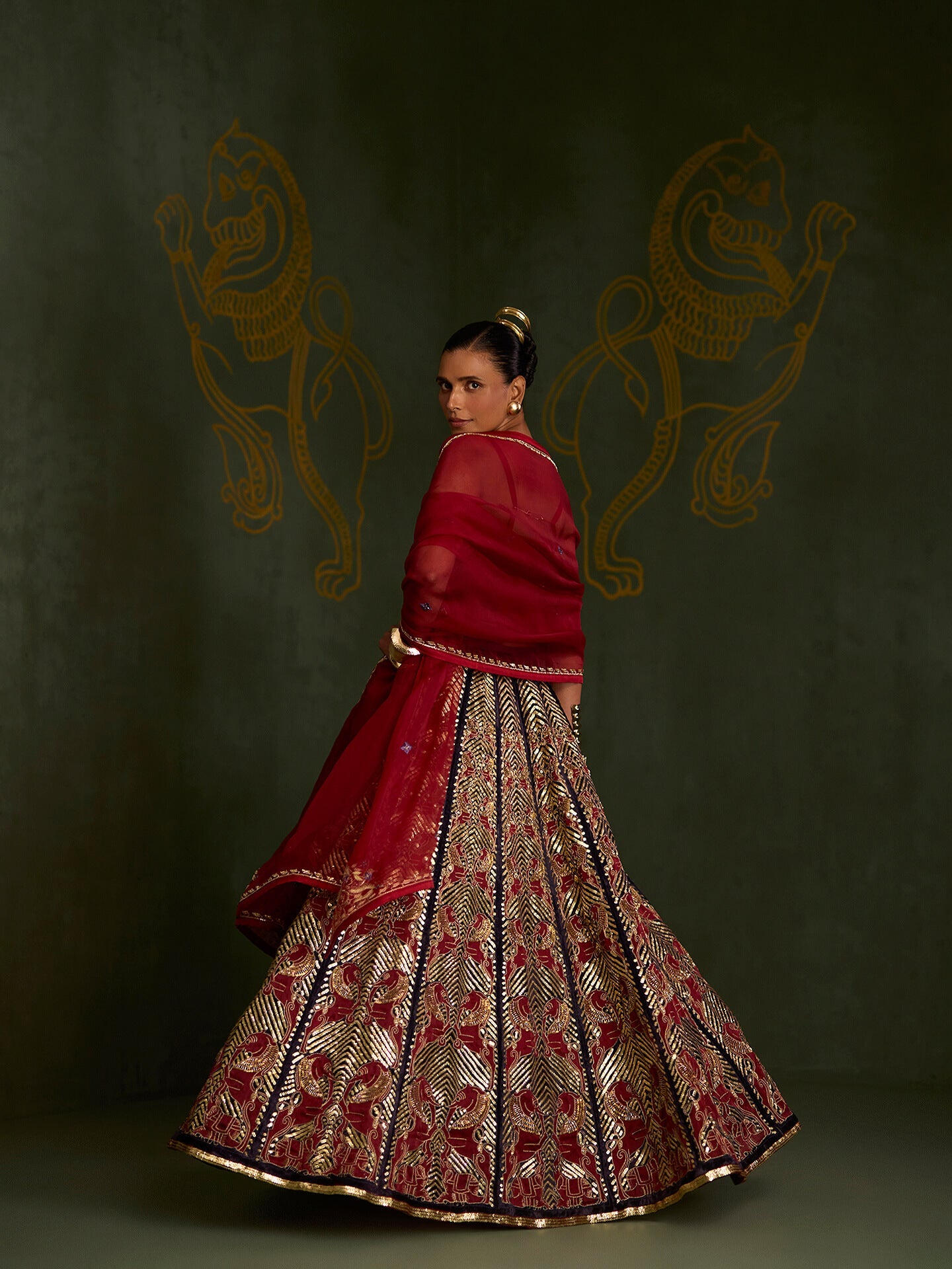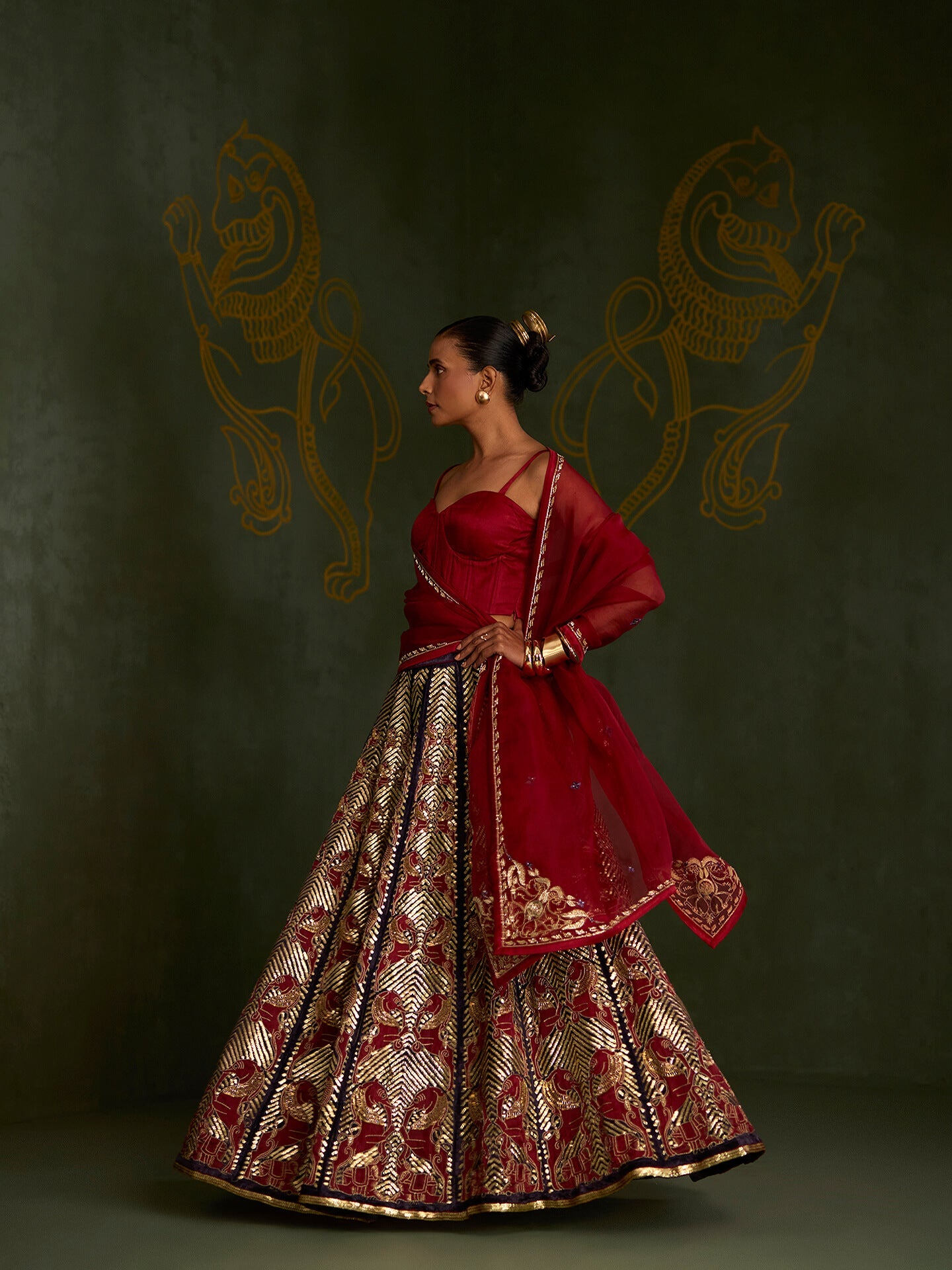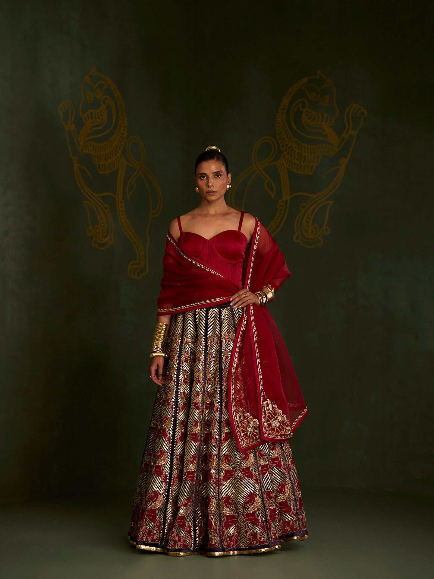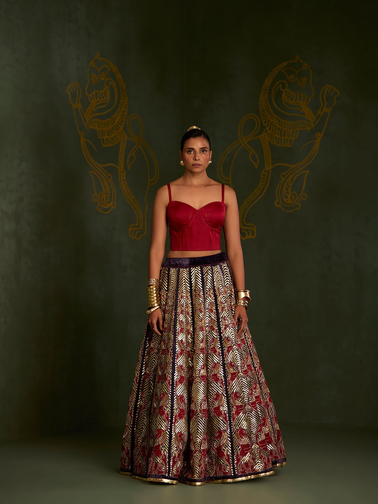 A statement maroon lehenga set featuring a Gajji silk corset blouse, organza lehenga with velvet patches, and an organza dupatta. The lehenga showcases exquisite Yali motifs-ancient mythological creatures symbolizing strength and power, brought to life through intricate naqshi, dabka, and sequin hand embroidery. A perfect blend of heritage and modern design for weddings and festive occasions.