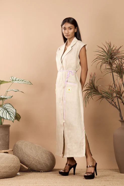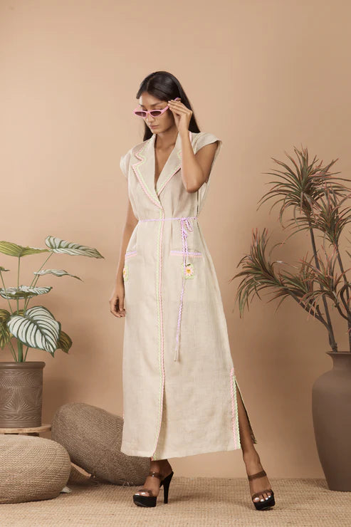 Blazer style long dress with lace detailing all over & laced belt with cute Daisy patches on the pockets.