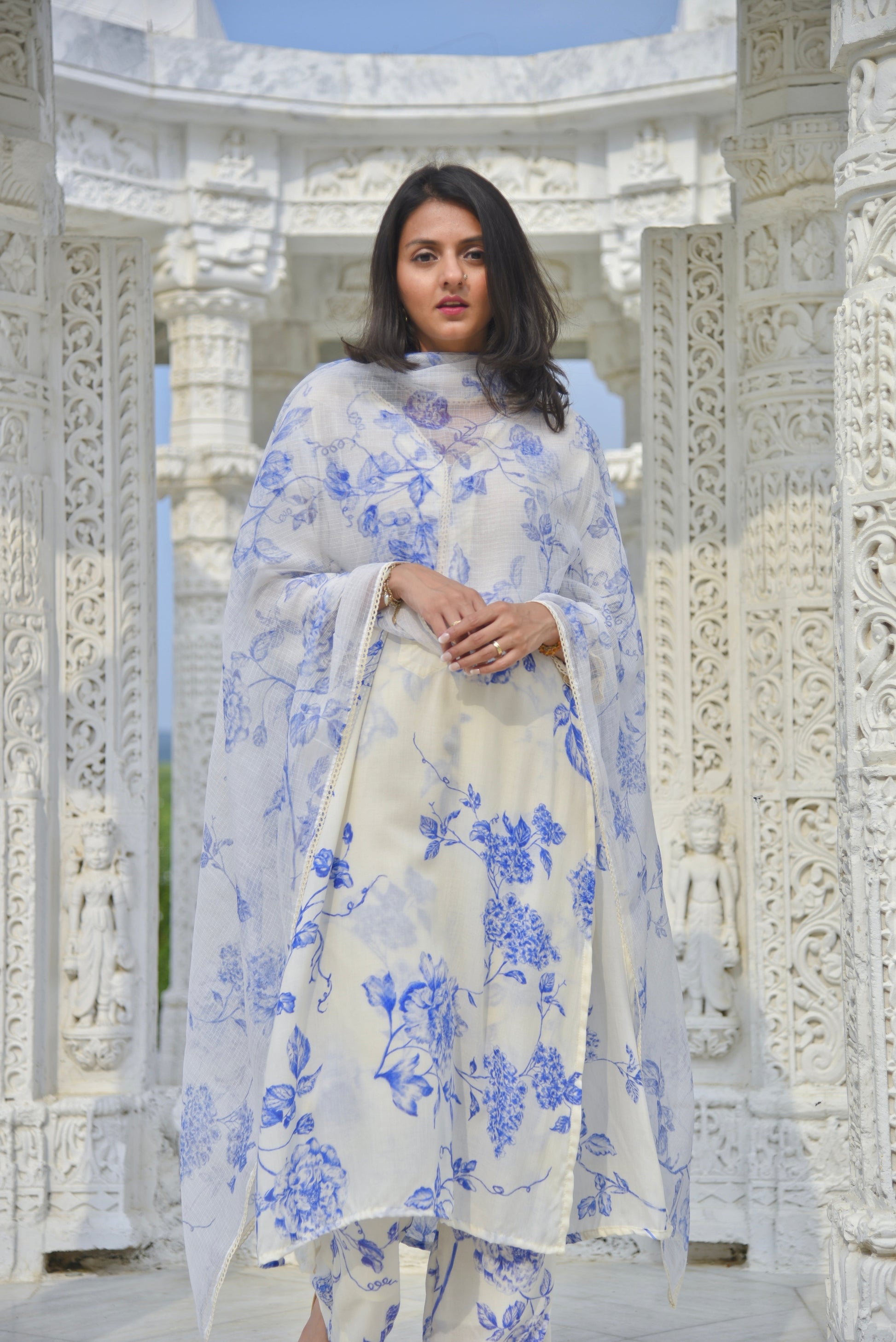 Fresh, elegant, and effortlessly timeless — this Ivory & Blue Floral Kurta and Dupatta Set is crafted for easy everyday grace. The V-neck kurta features delicate lace detailing on the neckline and sleeve hems, adding a refined feminine touch. Paired with a coordinated dupatta finished with lace trim all around, this set blends classic prints with modern finesse.