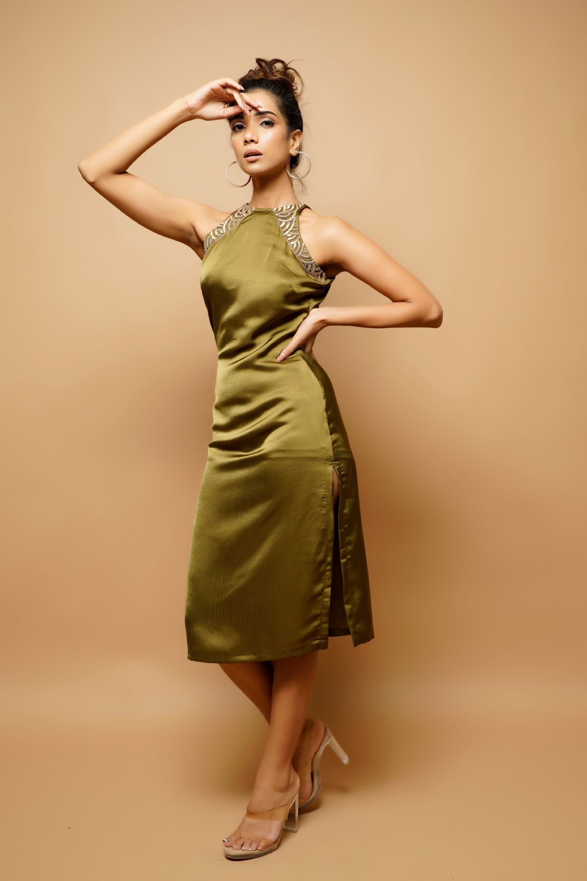 Olive Green Halter Neck Sheath Dress