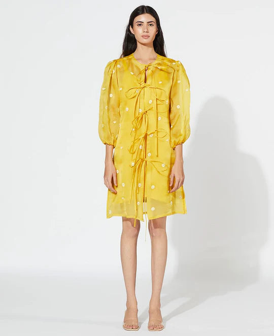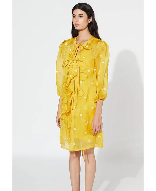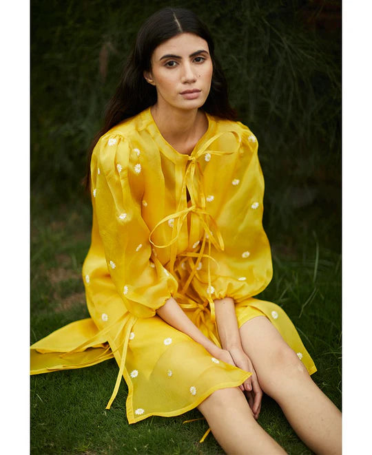 A sunny yellow tie up dress with hand embroidered flowers on luxe silk organza. Features puffed sleeves and comes with a cotton voile slip. Length 37".