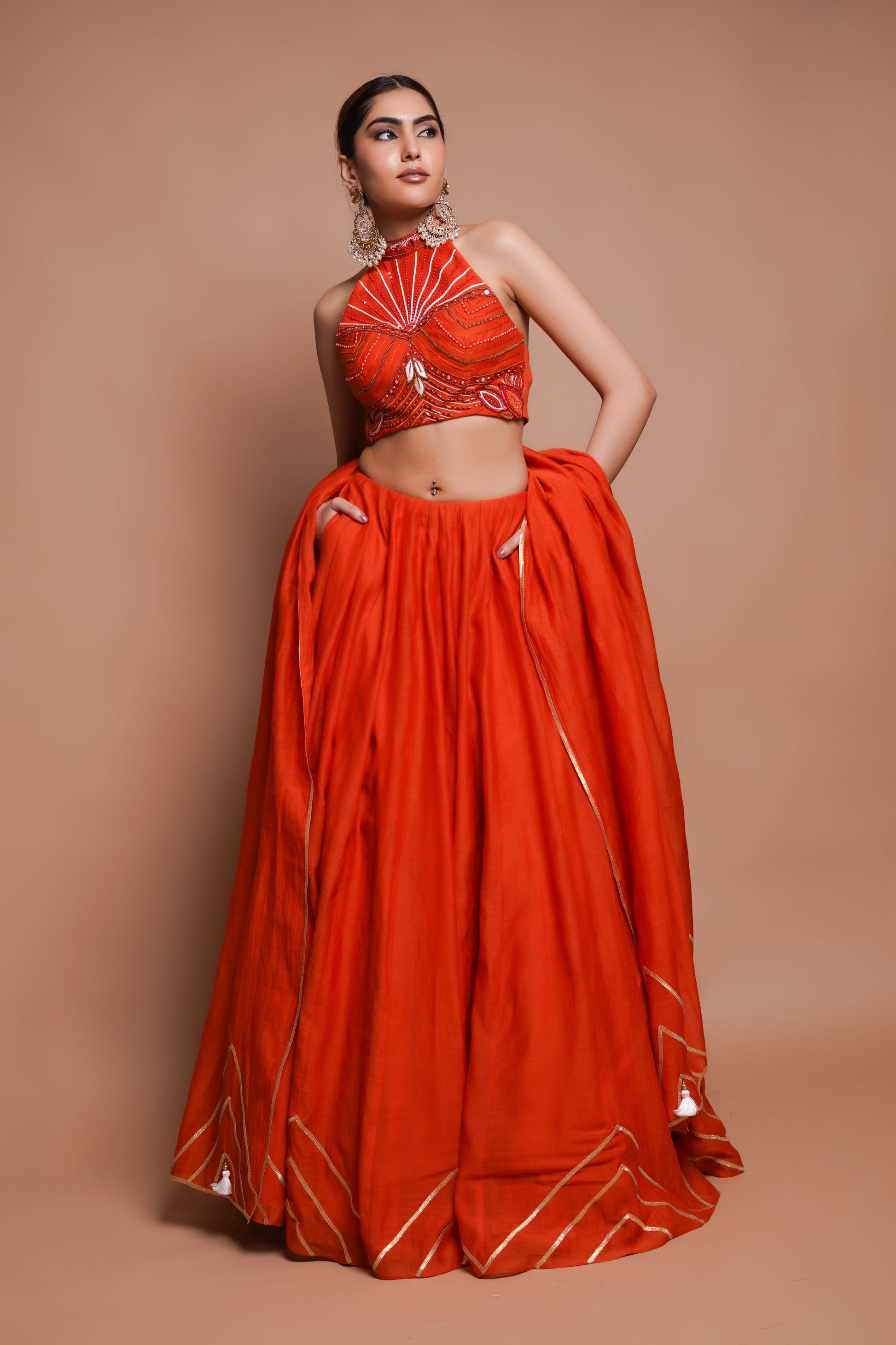 - A vibrant orange chanderi silk halter neck bustier , elegantly backless, adorned with intricate handwork, epitomizing grace and allure for any special occasion.
