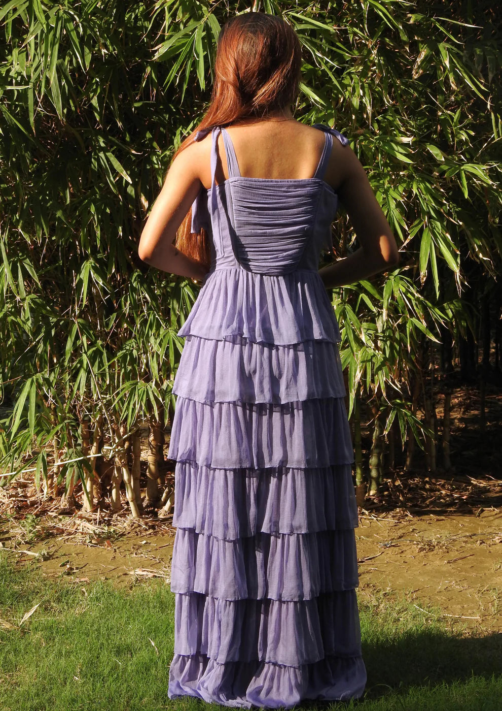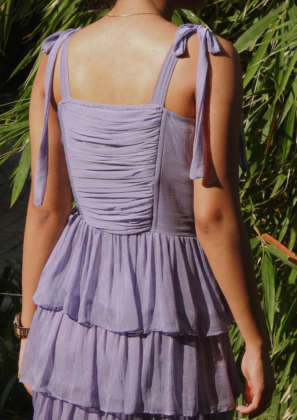 Frilled with wind, adorned with sky — the Orlaine dress flows with cascading tiers, soft gathers, a corset fit, and tie-up sleeves in romantic purple.