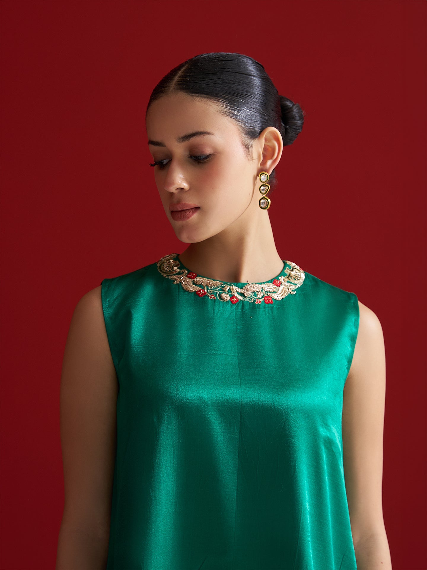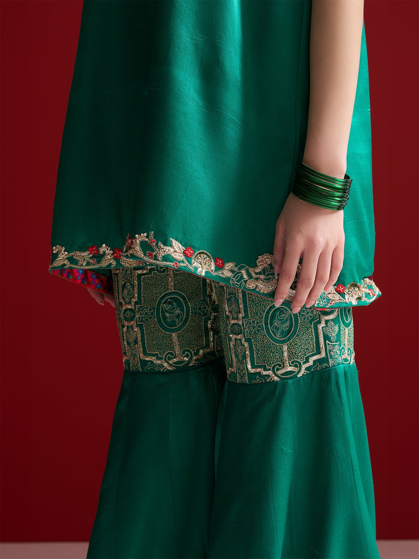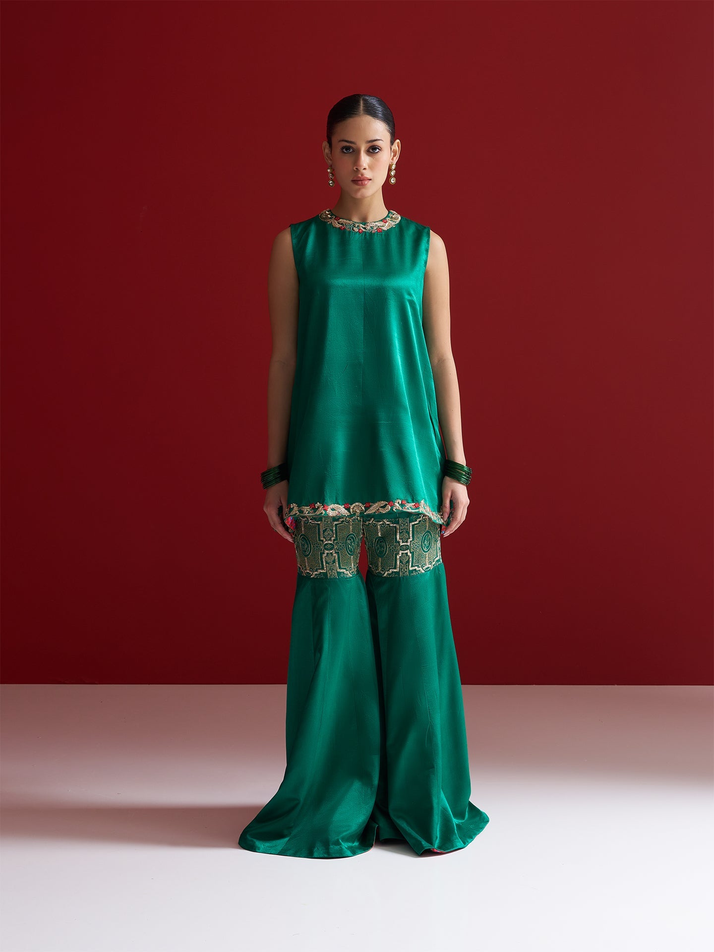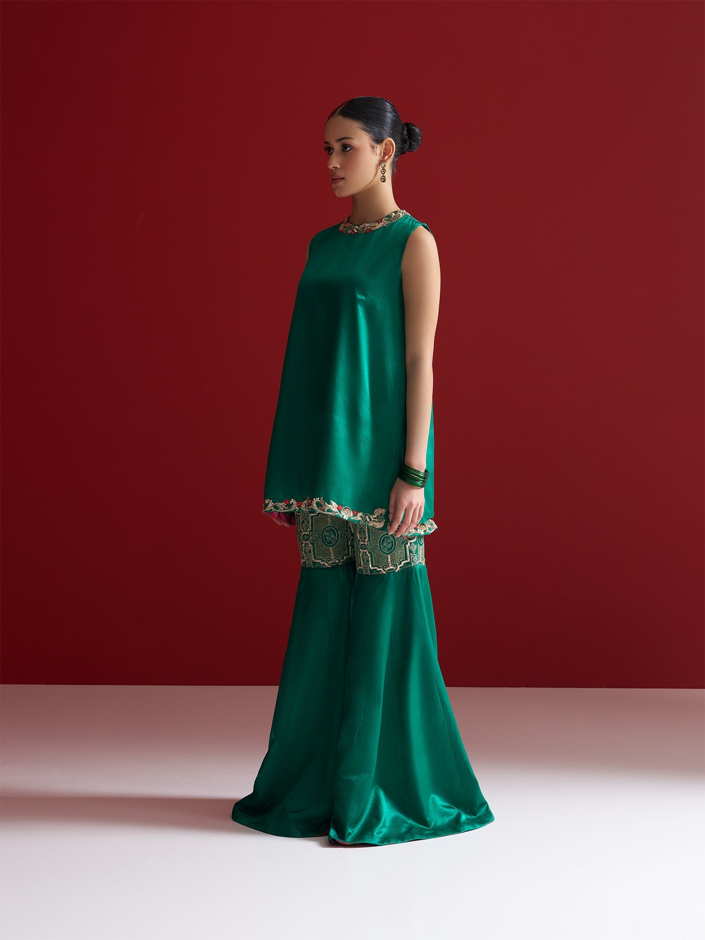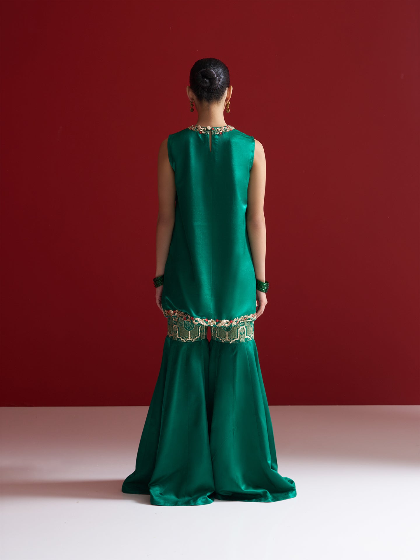 Crafted in rich emerald green color, this sleeveless kurta features intricate hand embroidery along the neckline and hem, adorned with dabka, naqshi, zari, and sequins for a luminous finish. It is paired with a beautifully flared gharara, highlighted by detailed embroidery and striking Yali motifs-mythical guardian creatures symbolizing strength and protection. A perfect blend of elegance and heritage for festive occasions.