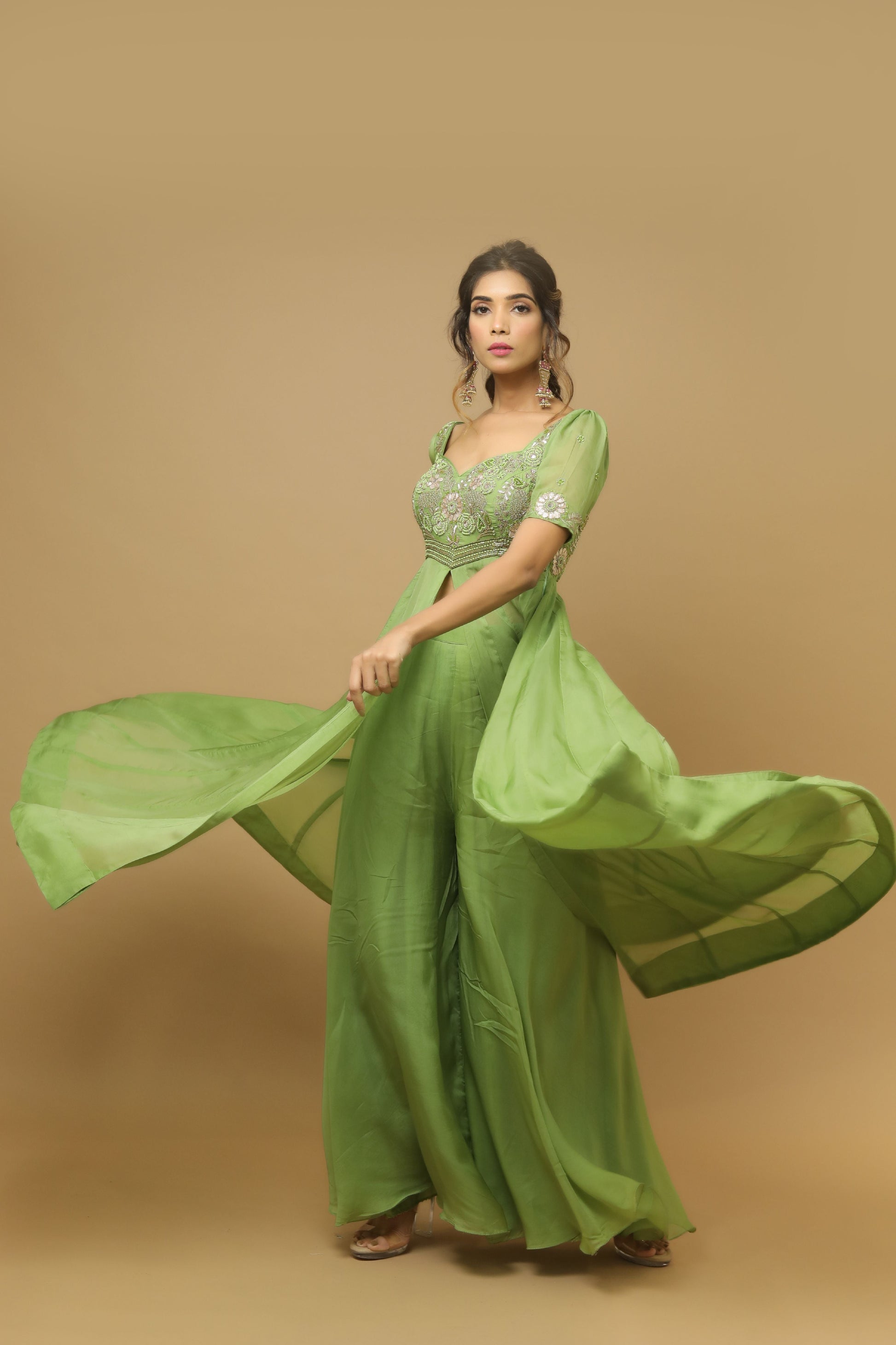 - Long padded front slit kali kurta is curated in parrot green colour.