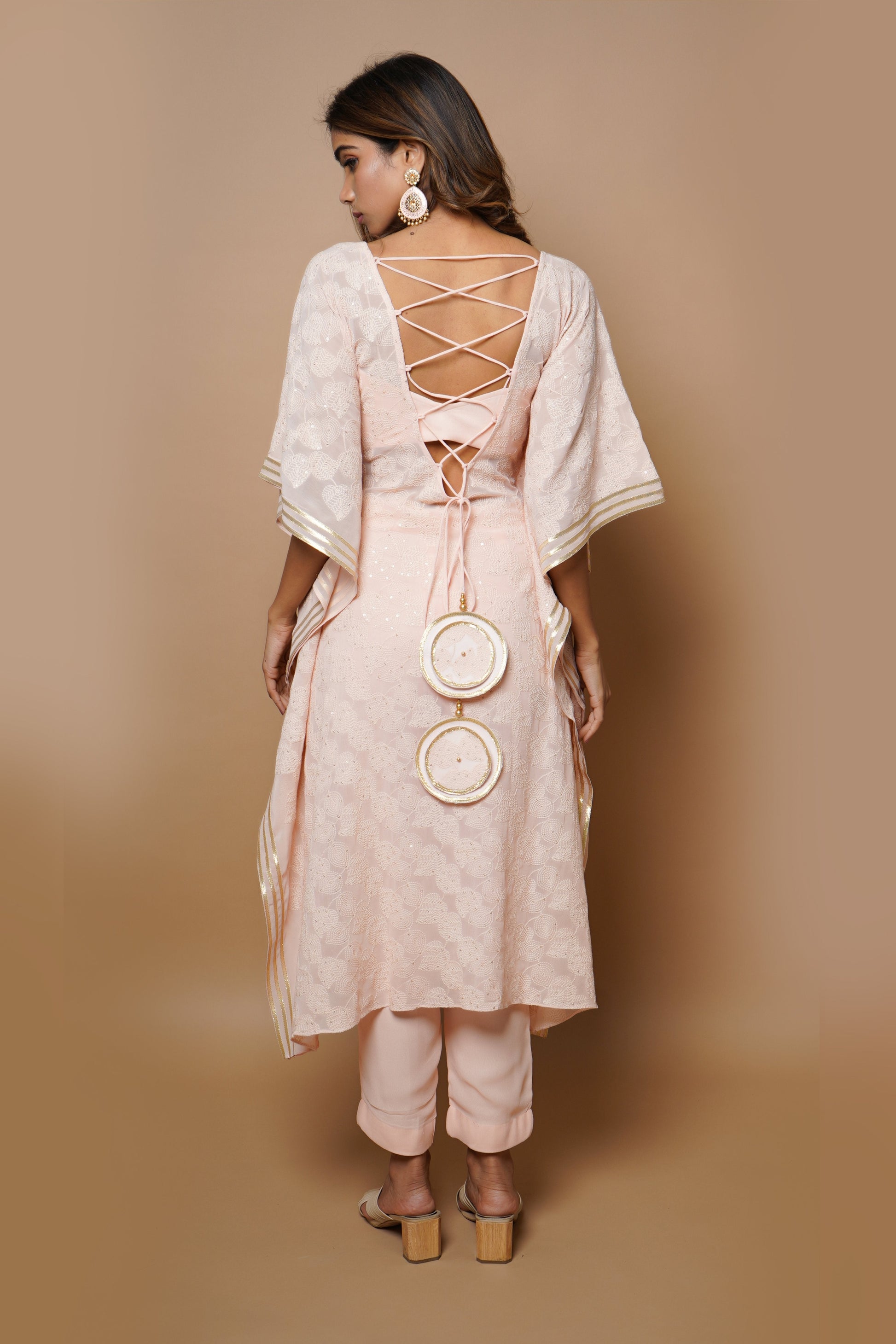 - Deep front neck Kaftan with detailing of laces all over it , back neck deep with dori and handmade hangings details