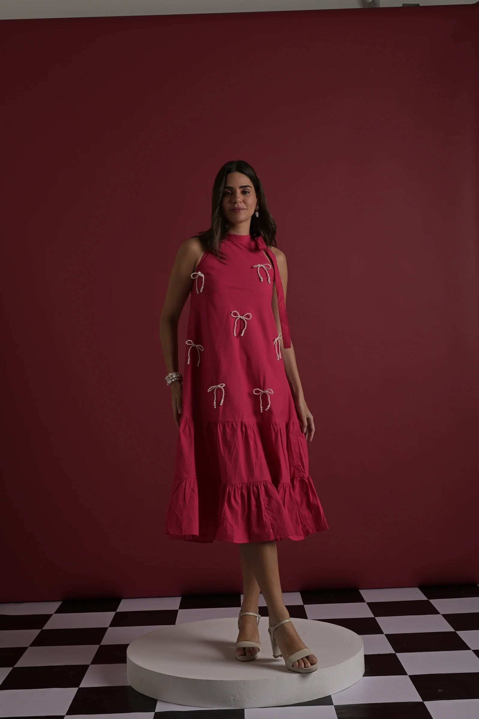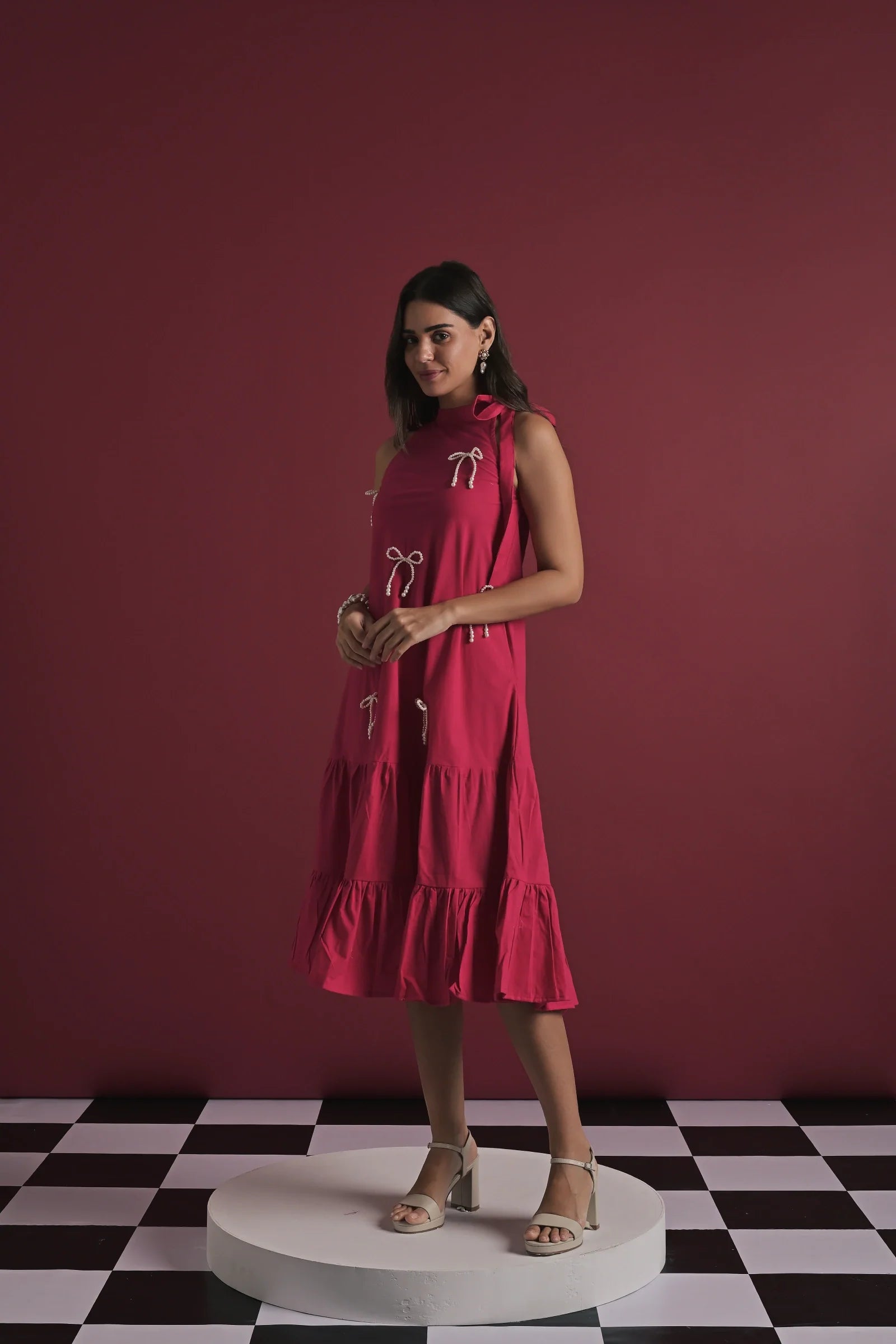 A chic fuschia pink midi dress featuring a relaxed A-line silhouette, elevated with delicate bow embellishments that add a playful yet refined touch. Designed with a sleeveless high neckline and a softly flared hem, it strikes the perfect balance between elegance and ease—ideal for day-to-evening styling. The look is presented on a model wearing size XS, with a height of 5'7”.
