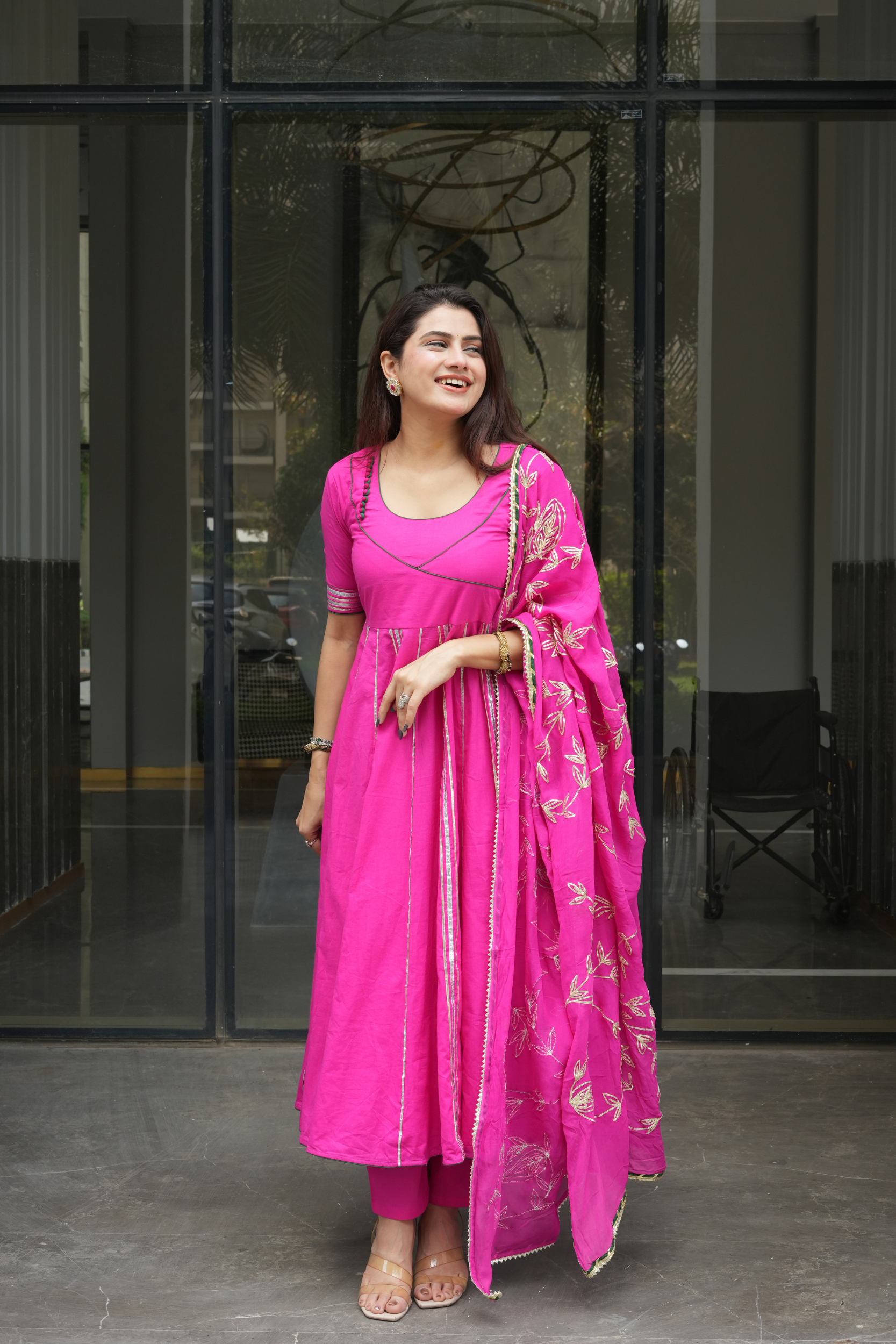 THIS PINK ROBIN GOTA WORK KALIDAR COTTON SUIT SET IS A MIX OF GLITZ AND ELEGANCE. THIS PIECE HAS VIBRANT RANI COLOR WITH BEAUTIFUL HAND EMBROIDERY ON DUPATTA, THIS ONE IS A RECOMMENDED PIECE FROM ARTISTS, GET YOUR FAVORITE ROBIN PINK SUIT Now.