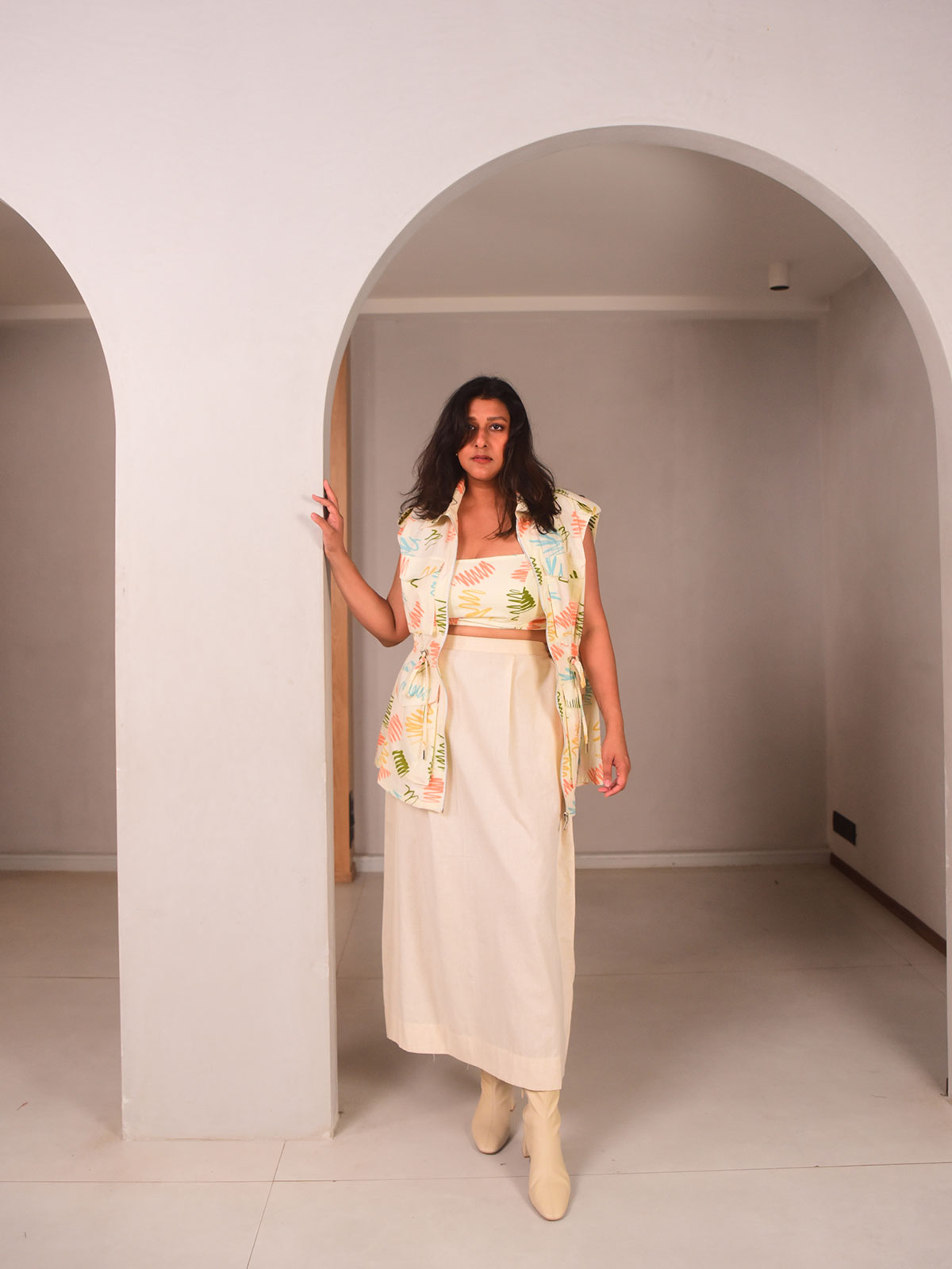 This playful bralette is cut in our exlusive cream and colourful scribble hand-screen printed cotton. The fitted padded design adds a fun, feminine element to your wardrobe. Wear it with our Poppy Sleveless Jacket and Amara Linen Skirt for a stylish, modern look.