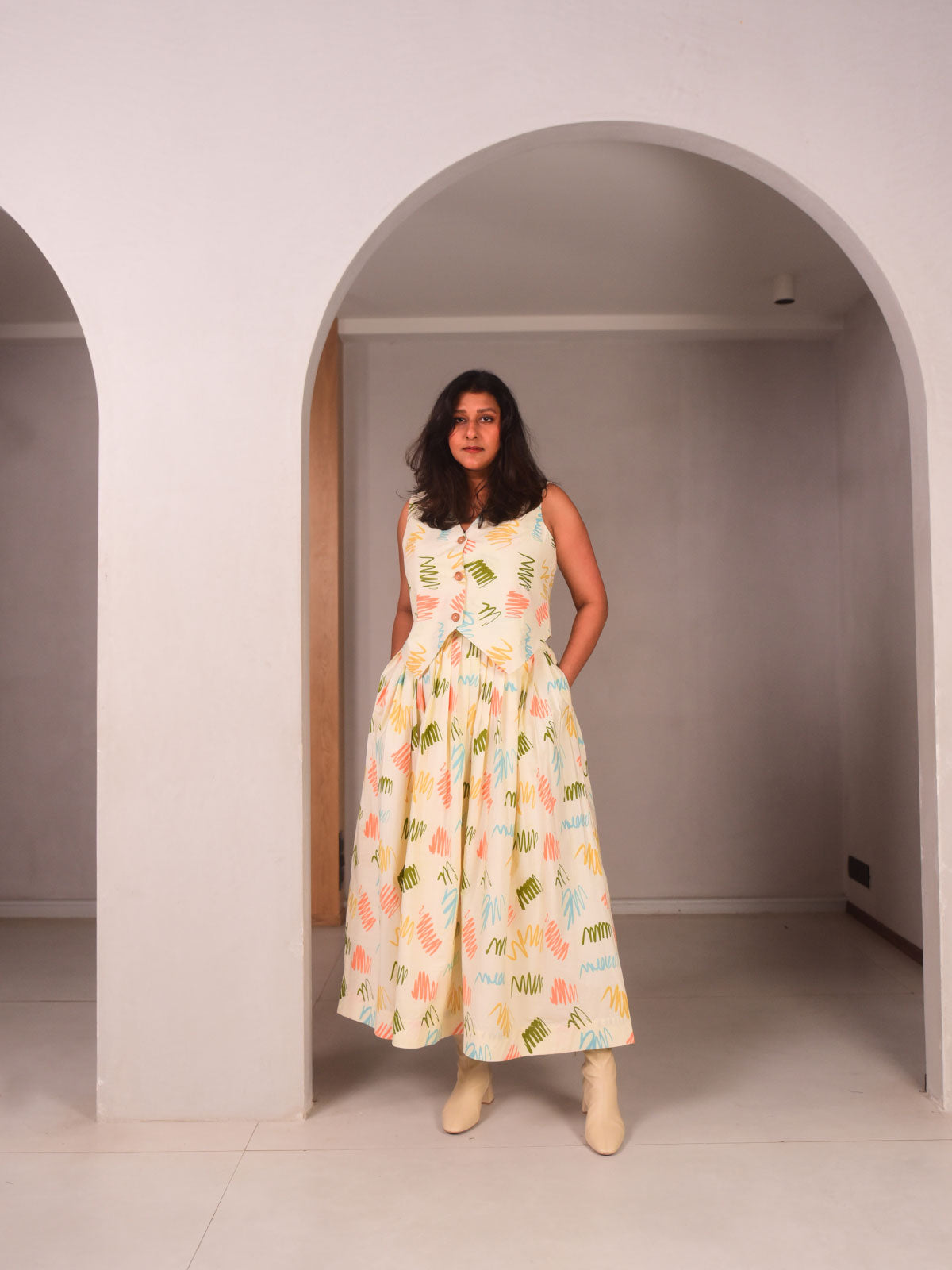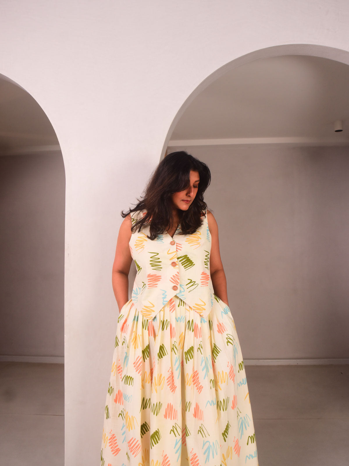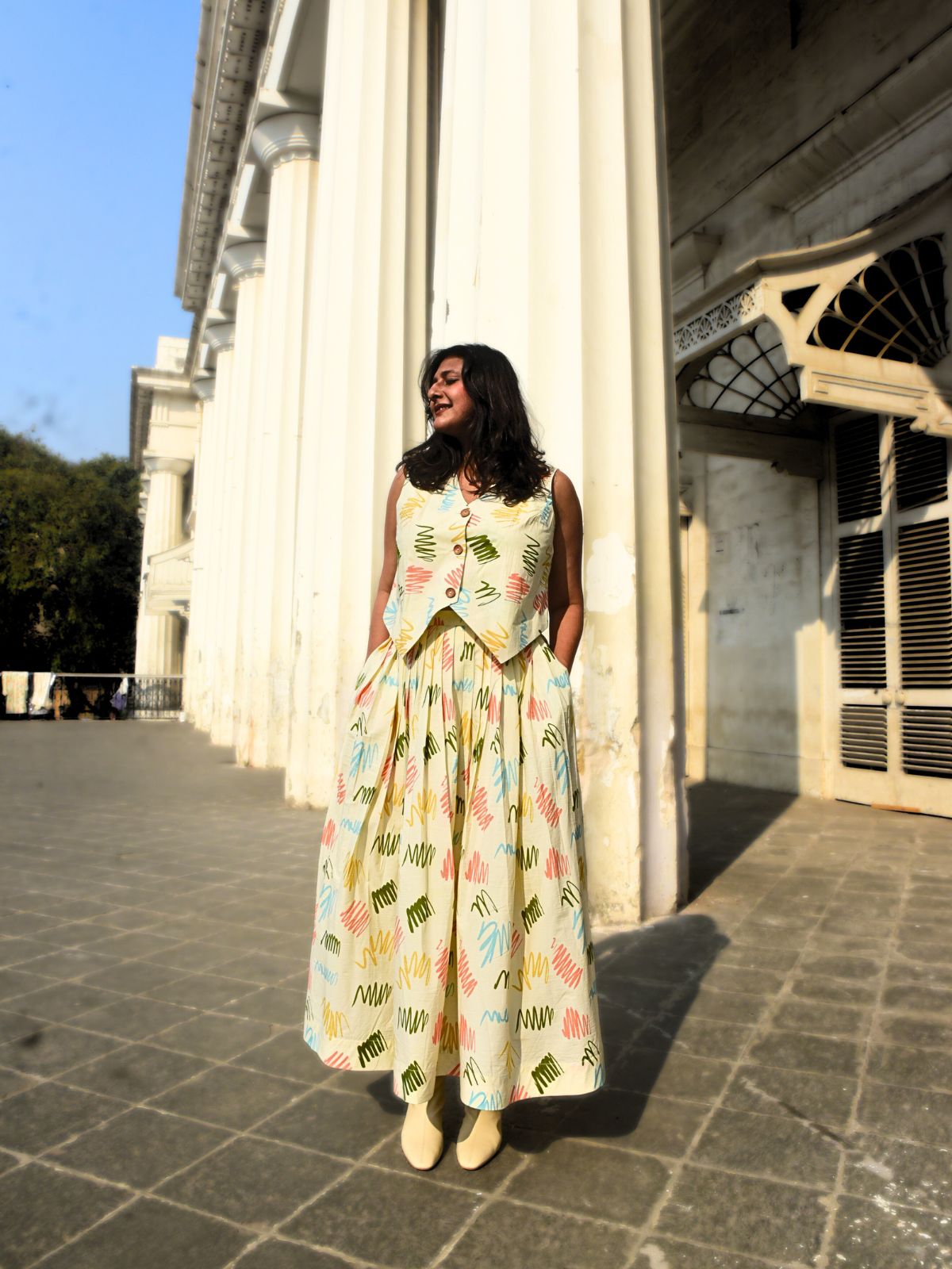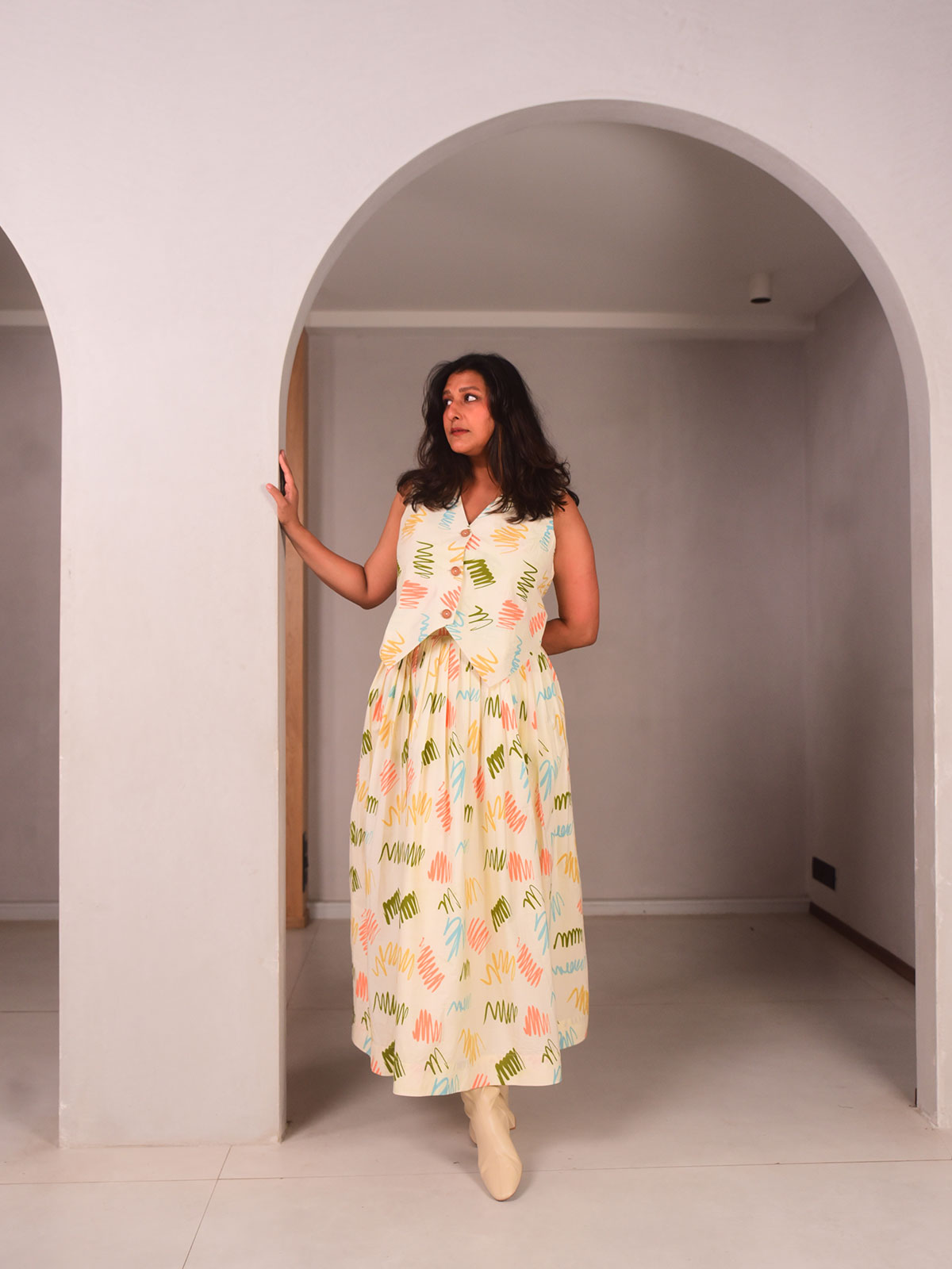 Feminine yet fuss-free, with just the right amount of charm. Cut in our exclusive cream and colourful scribble hand-screen printed cotton. The vest features buttons at the front and a clean silhouette. This playful pleated skirt is complete with pockets and adds levity to any occasion. Pair with chic boots or fun sneakers, you can't go wrong with this look.