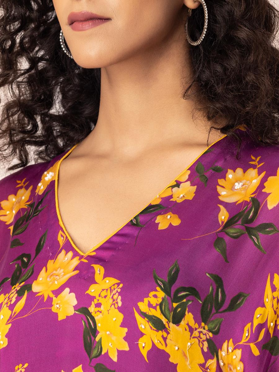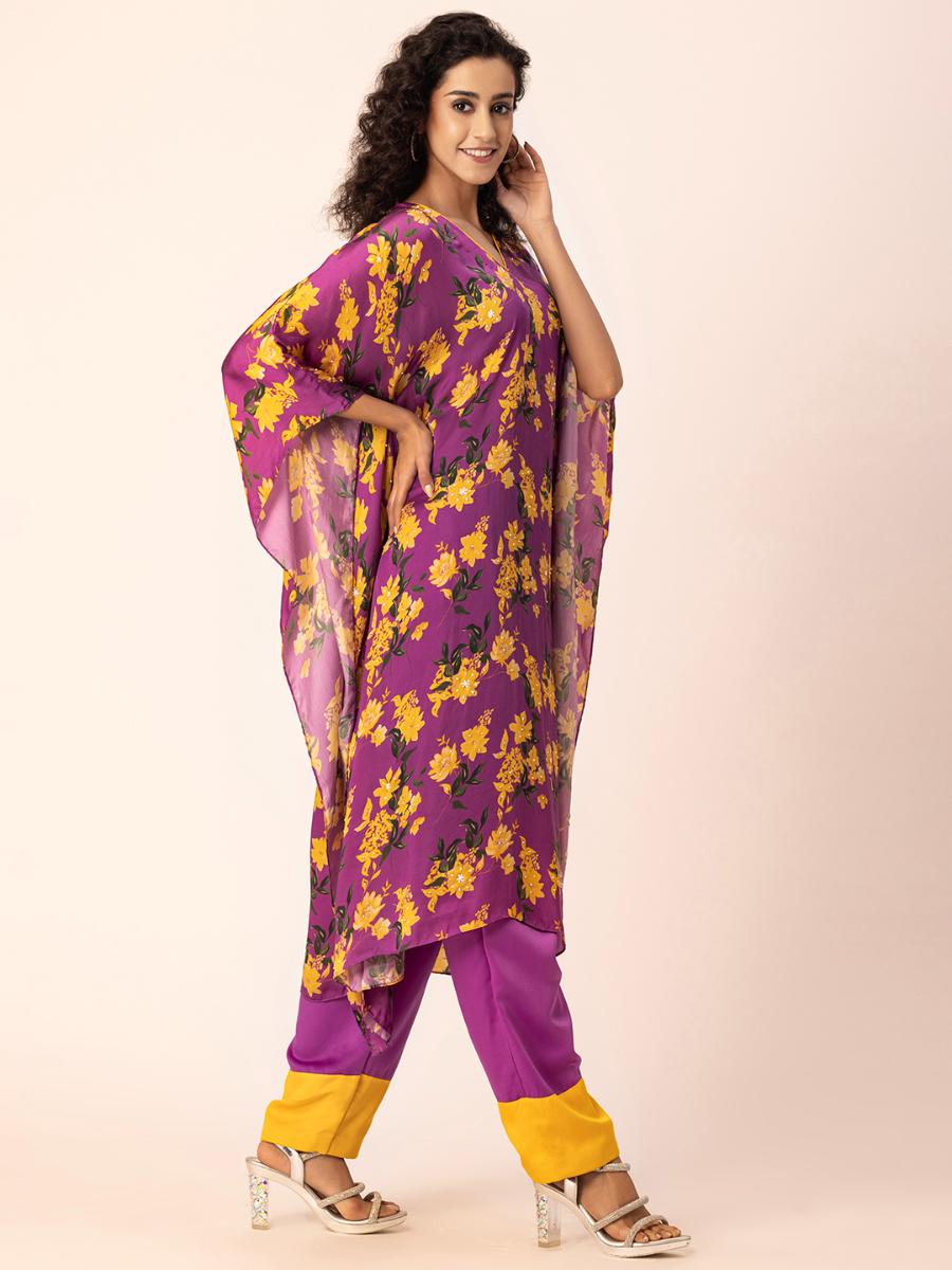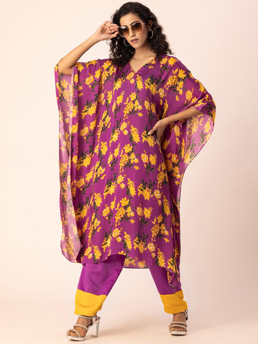 Our Purple Bloom Coord set is a charming blend of purple hues and playful patterns highlighted with line and beads embroidery on kurta. The kaftan features V neck. It consists of straight pants in solid color with color blocking panel at the hemline.