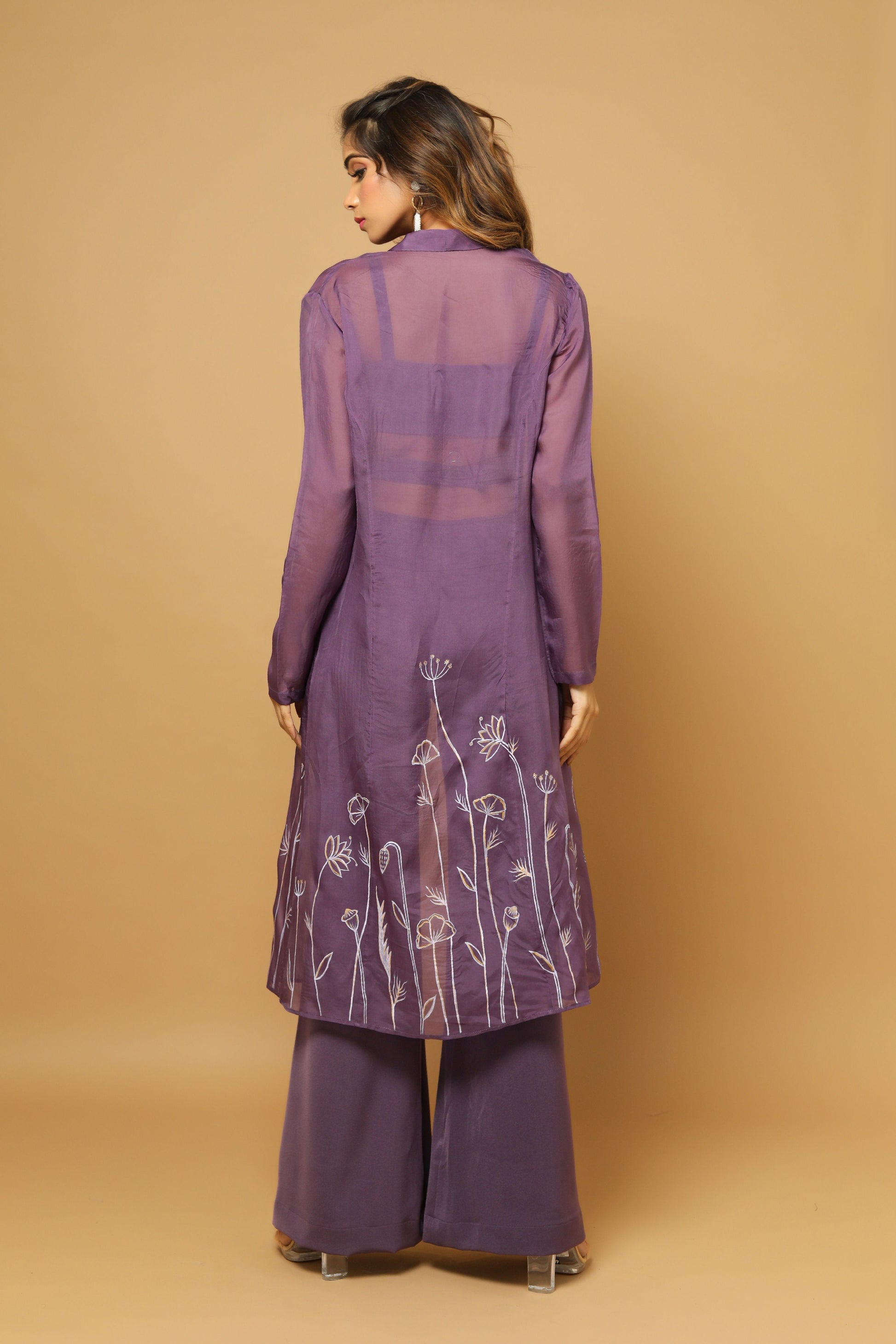 Purple Indo Western Set With Handpainted Jacket (Set Of 3)