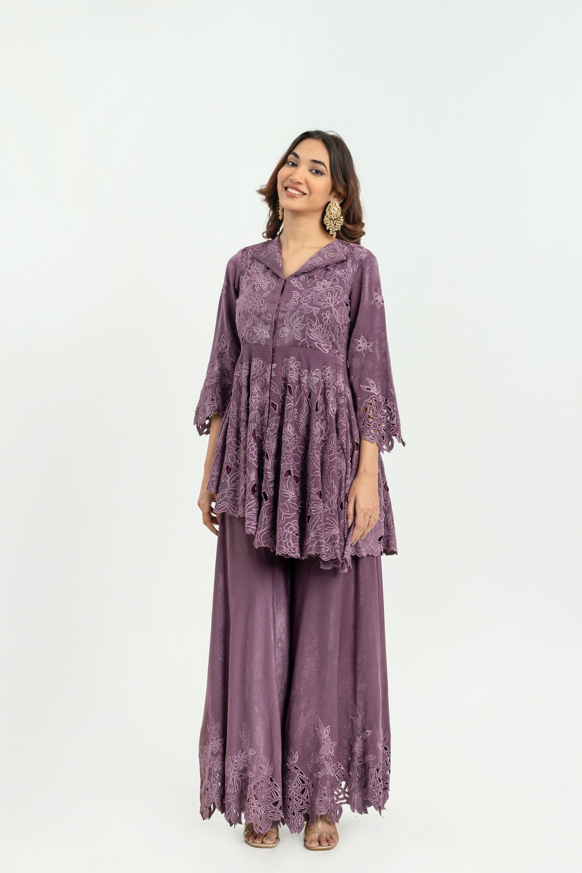 This exquisite peplum set is crafted from luxurious Imported Velvet Satin, adorned with delicate floral hand-cut embroidery and intricate scalloped detailing on the sleeves and hem. The wide-leg palazzo pants feature elegant laser-cut floral motifs along the hem, adding a striking statement to the ensemble.