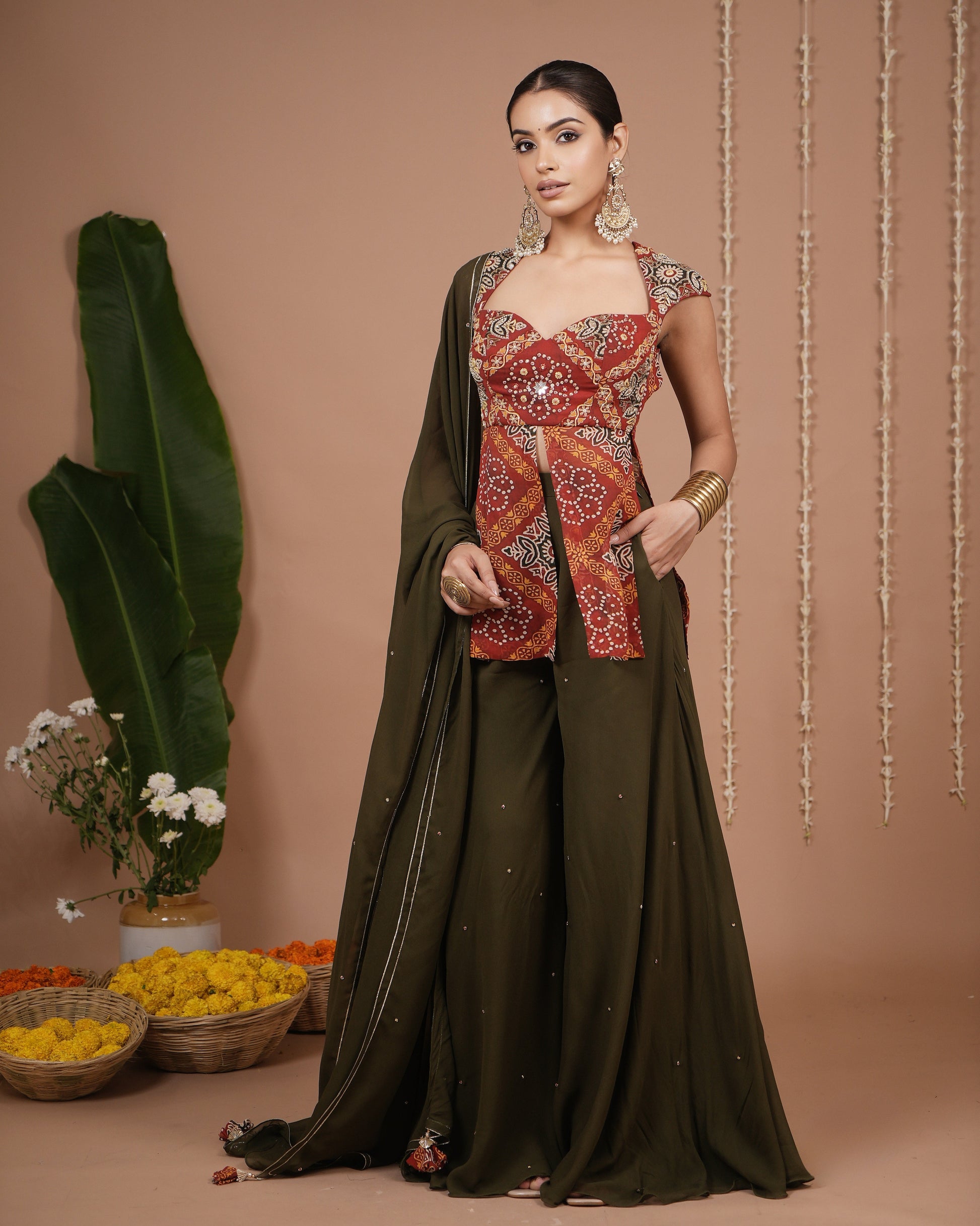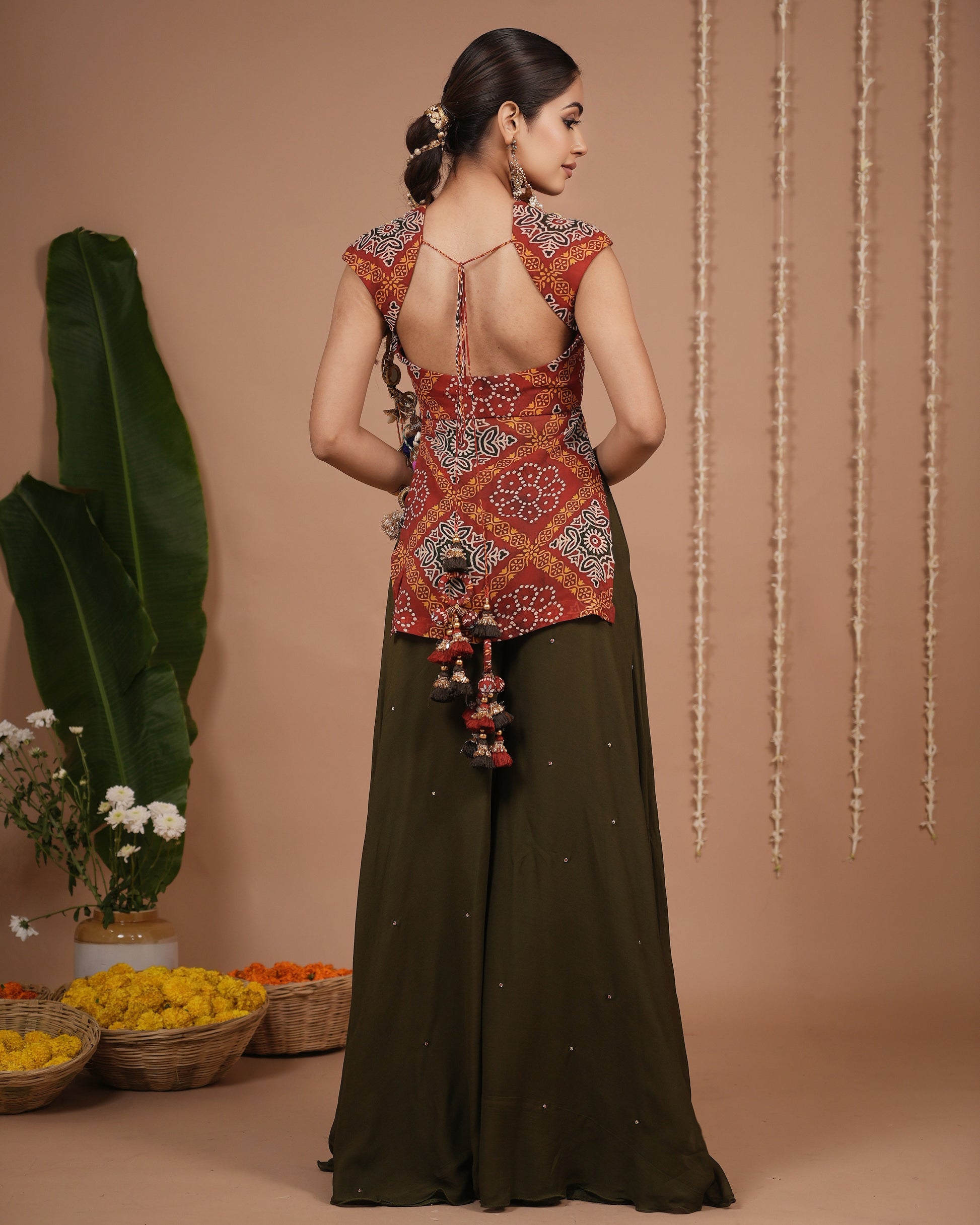 Red Bandhani Printed Kurti Palazzo Set (Set of 3)