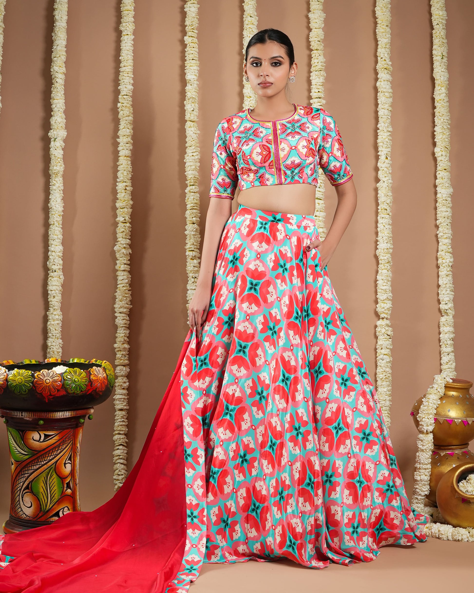 Red Tile Printed Heavy Lehenga Set (Set Of 3)