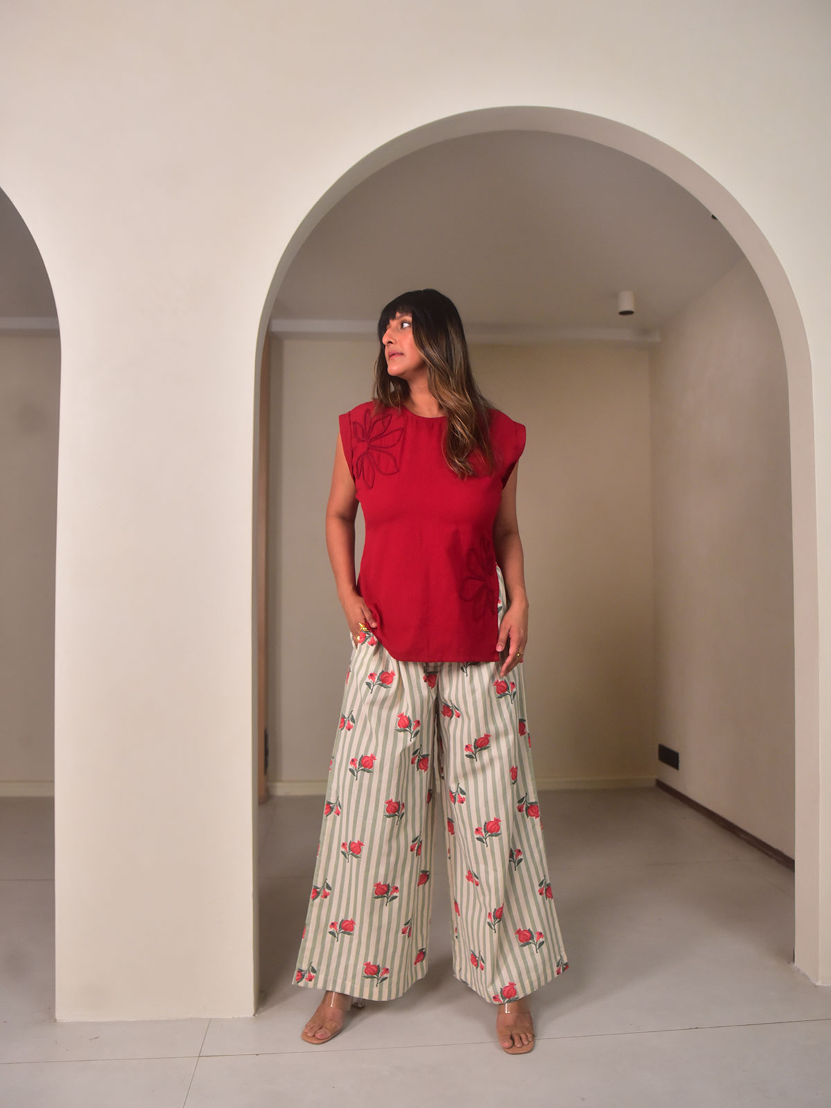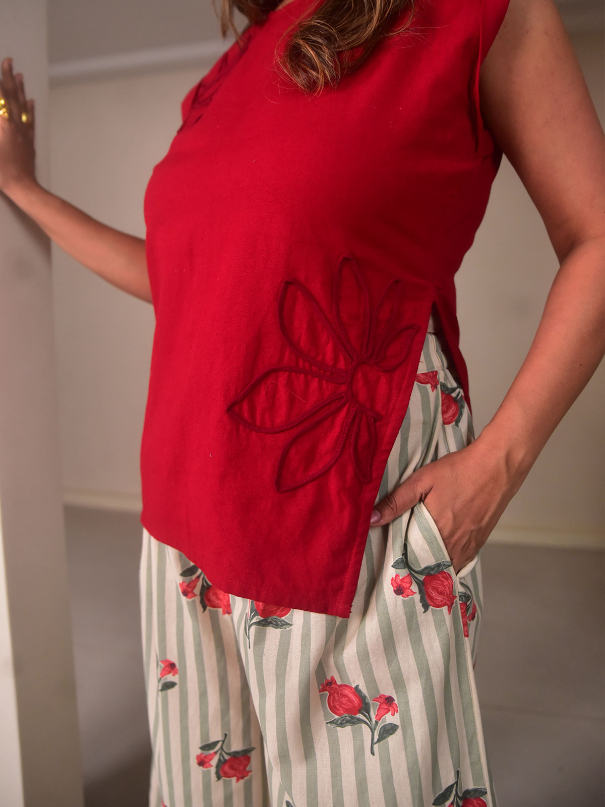 | Cut in red dyed cotton linen, this elevated sleeveless top is designed to make a subtle statement. Featuring a closed neckline, cinched waist, high side slit, and hand-stitched maroon floral cording near the neckline and slit, it balances structure with detail. Ideal for festive evenings, intimate celebrations, or elevated casual wear. Style it with green striped flared pants and minimal accessories for a striking contrast. |