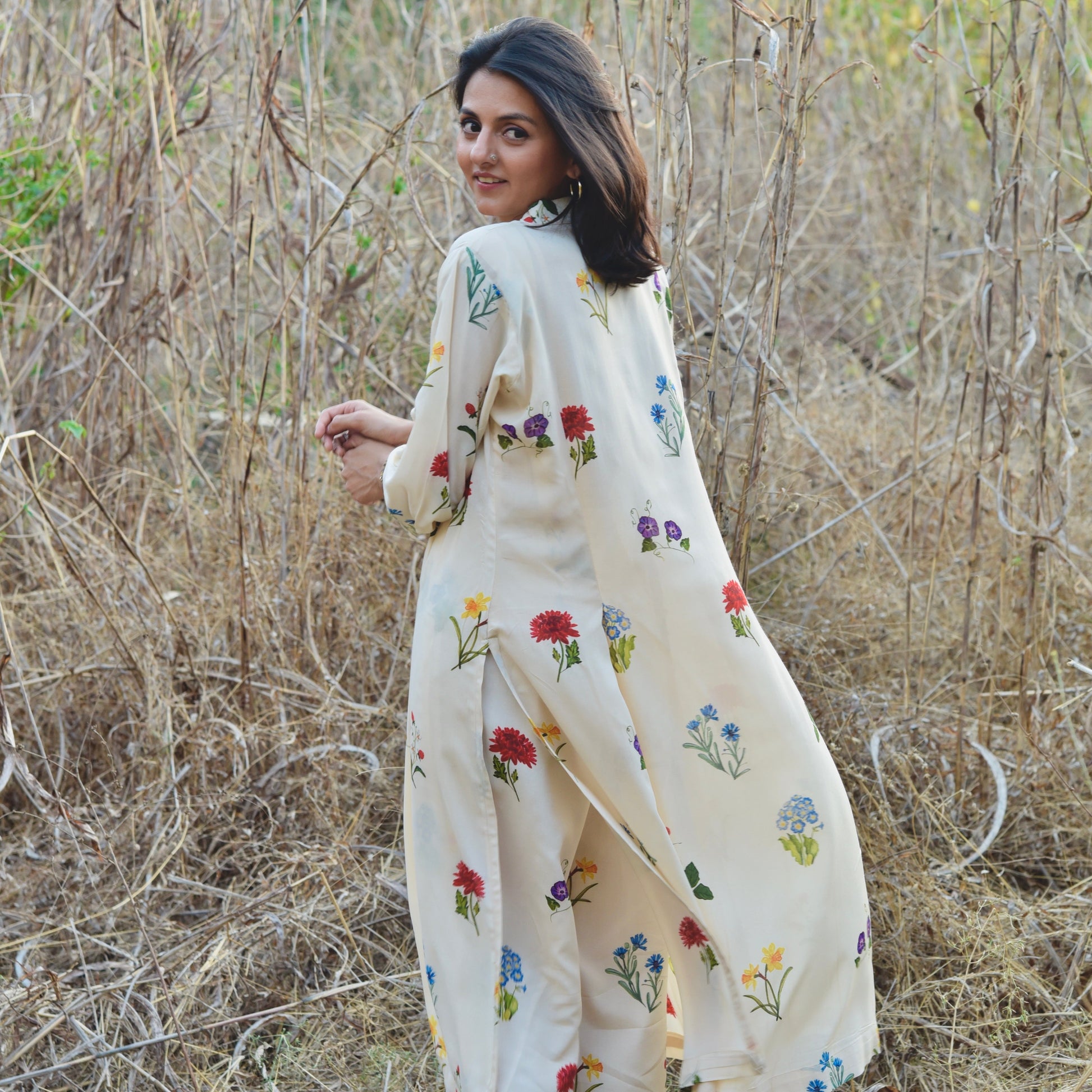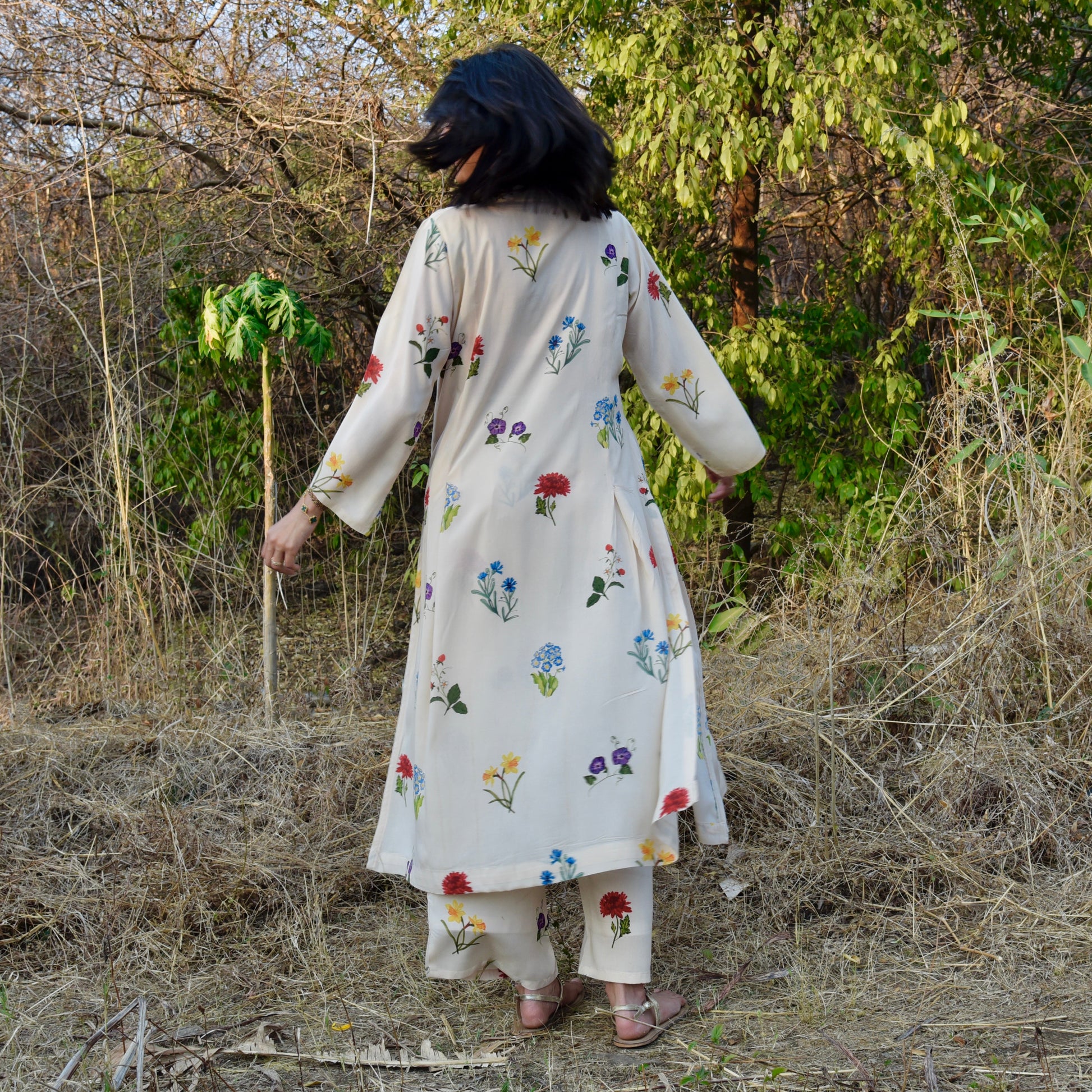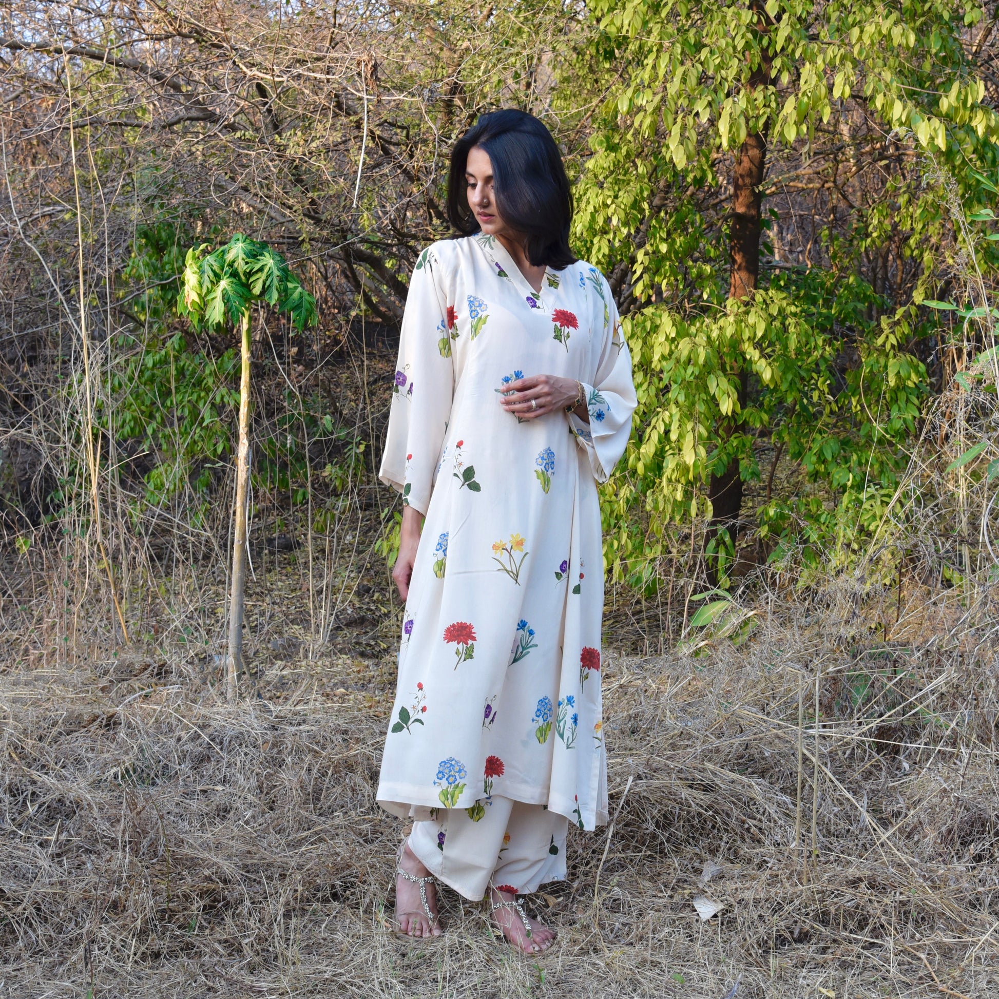 Introducing our cream floral printed kurta set. This relaxed-fit piece showcases v neck collar detail. The kurta have box big pin tucks on both sides to give a little fit and flare effect to the outfit. The tucks run from shoulder till the waist giving a good flare waist below. The flared full sleeves, add sophistication to the ensemble. The pants are straight fitted with elastic at the waist. Crafted from luxurious modal fabric, the set boasts a lovely shine, elevating your look with a touch of glamour.
