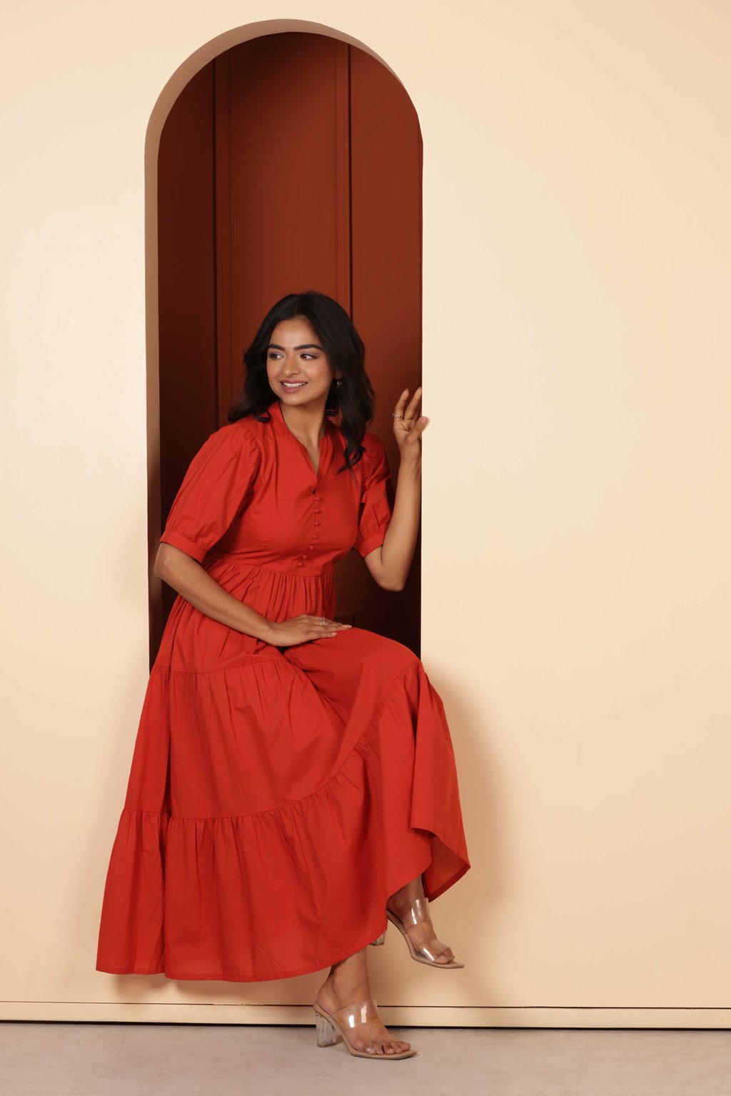 OUR RUSTY TIERED DRESS IS DESIGNED TO MAKE YOU FEEL ELEGANT AND CAREFREE. THE RUSTY COLORS BRING WARMTH AND A VINTAGE VIBE, MAKING THIS DRESS SUITABLE FOR VARIOUS OCCASIONS FROM CASUAL OUTINGS TO SPECIAL EVENTS. -