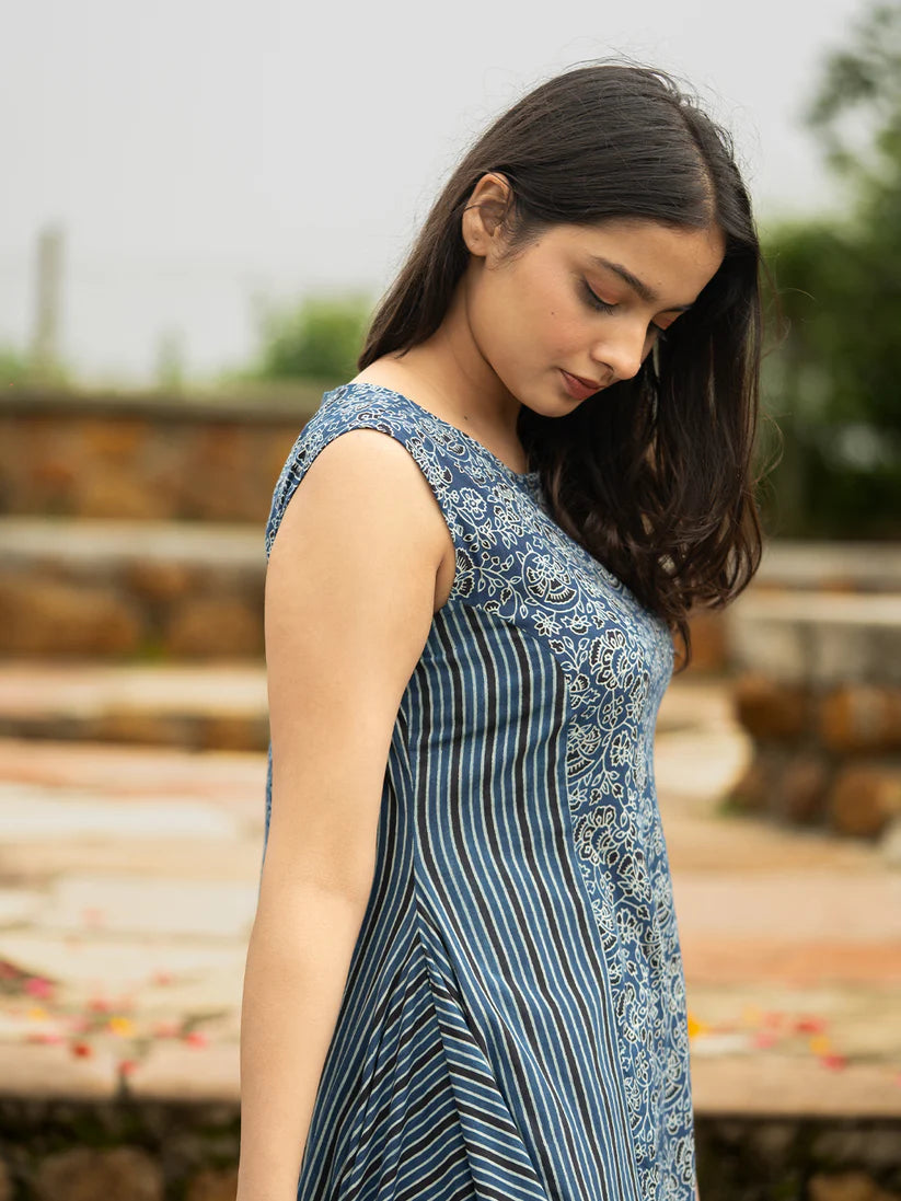 Asymmetrical Kurta in hand printed Indigo. Kurta has inseam pockets. Paired with hand printed Striped Pants. Separate 3/4th sleeves are available with the Kurta.