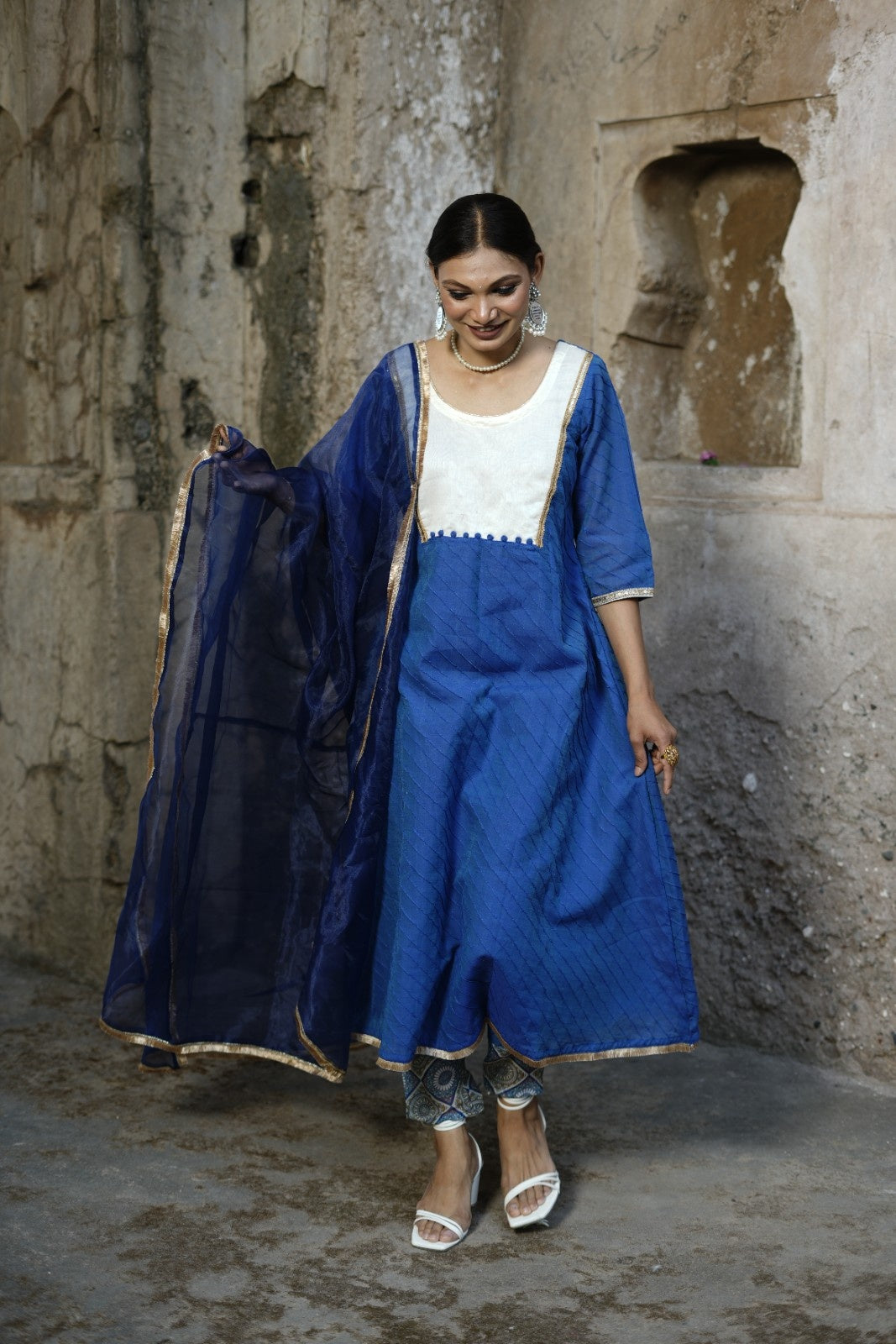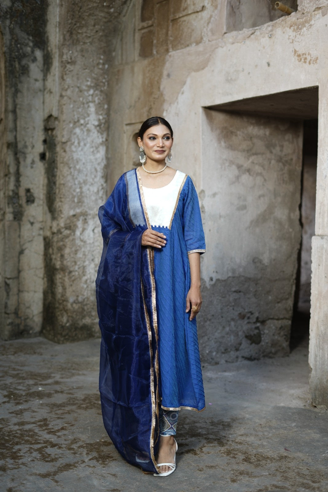 Make a statement in this navy blue semi Chanderi kurta pant set, ideal for weddings, festive occasions, and special events. The kurta is designed with all-over pintuck detailing and a Chanderi yoke accentuated with potli buttons and delicate zari lace, offering a perfect blend of tradition and elegance. It comes with narrow-fit pants featuring a half-elastic, half-belt waistband for a comfortable yet structured look. The ensemble is completed with a lightweight organza dupatta, while the pure mul cotton lining ensures breathable, all-day comfort.