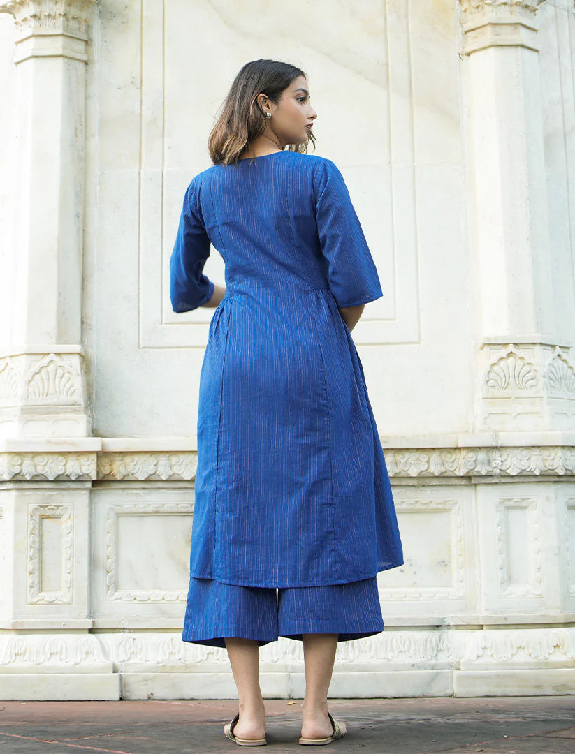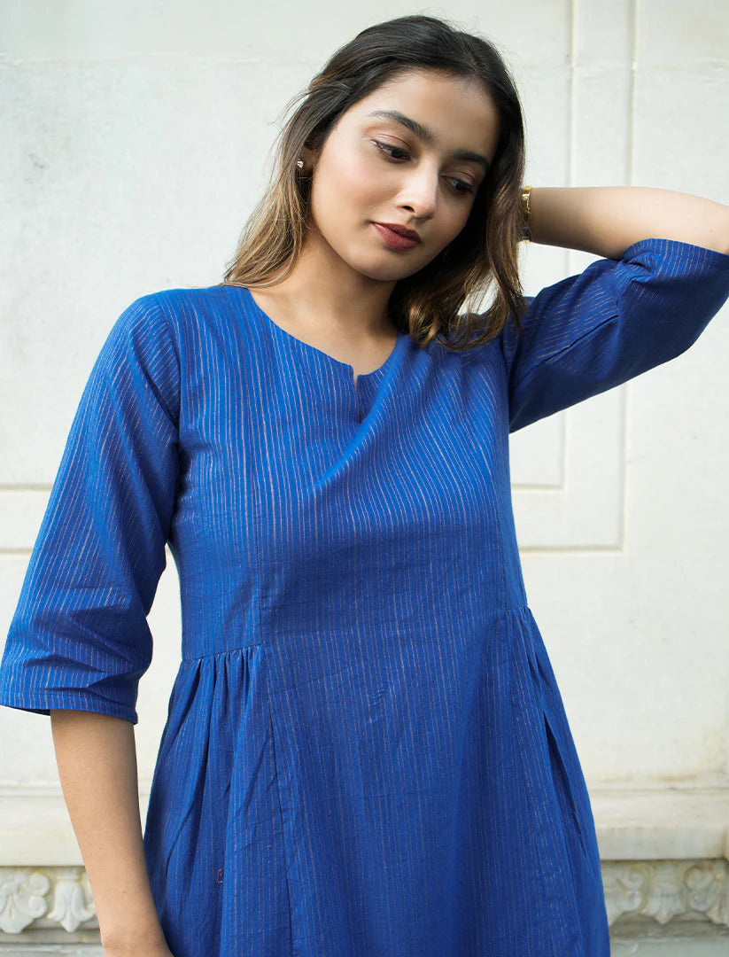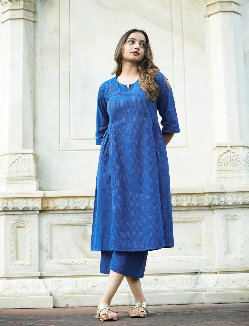 Our Sara Kurta in electric blue colored cotton with subtle lurex lines is a perfect one for any light occasion! The cotton fabric makes it breathable and comfortable, while the lurex lines add a touch of delicate shimmer without being too bold. The gathers on the side panels not only add volume and flow to the kurta but also give it a modern, flattering silhouette. Paired with matching palazzos, it creates a balanced and chic look that feels effortless yet put-together.