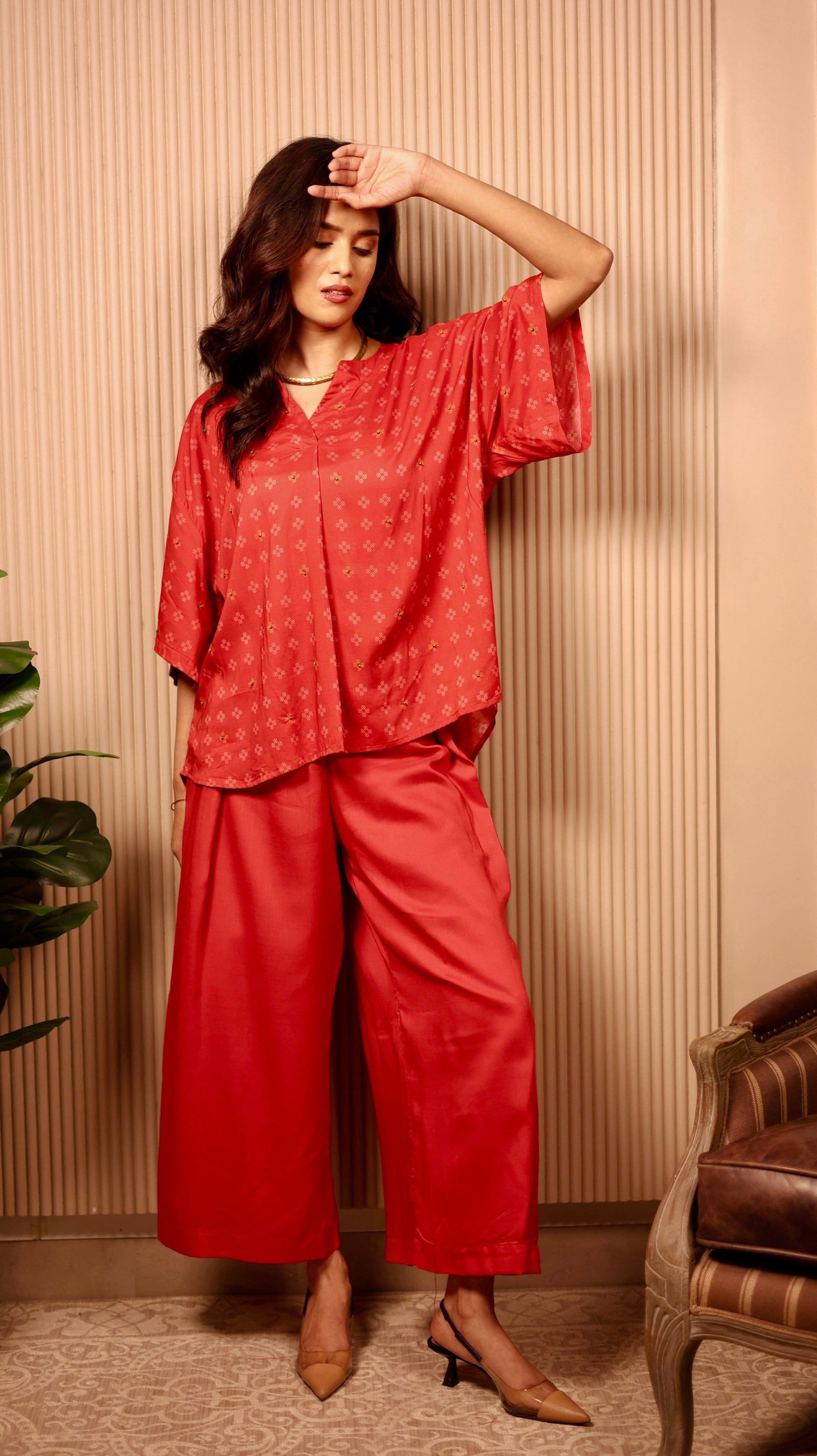 The stunning deep red Scarlet Coord Set includes a free-size printed top adorned with charming green beads and matching red pleated flared pants. Perfect for dressing up or keeping it relaxed, this pair effortlessly suits a snug dinner or a fun birthday party. Wear them together or mix and match separately for versatile style options.