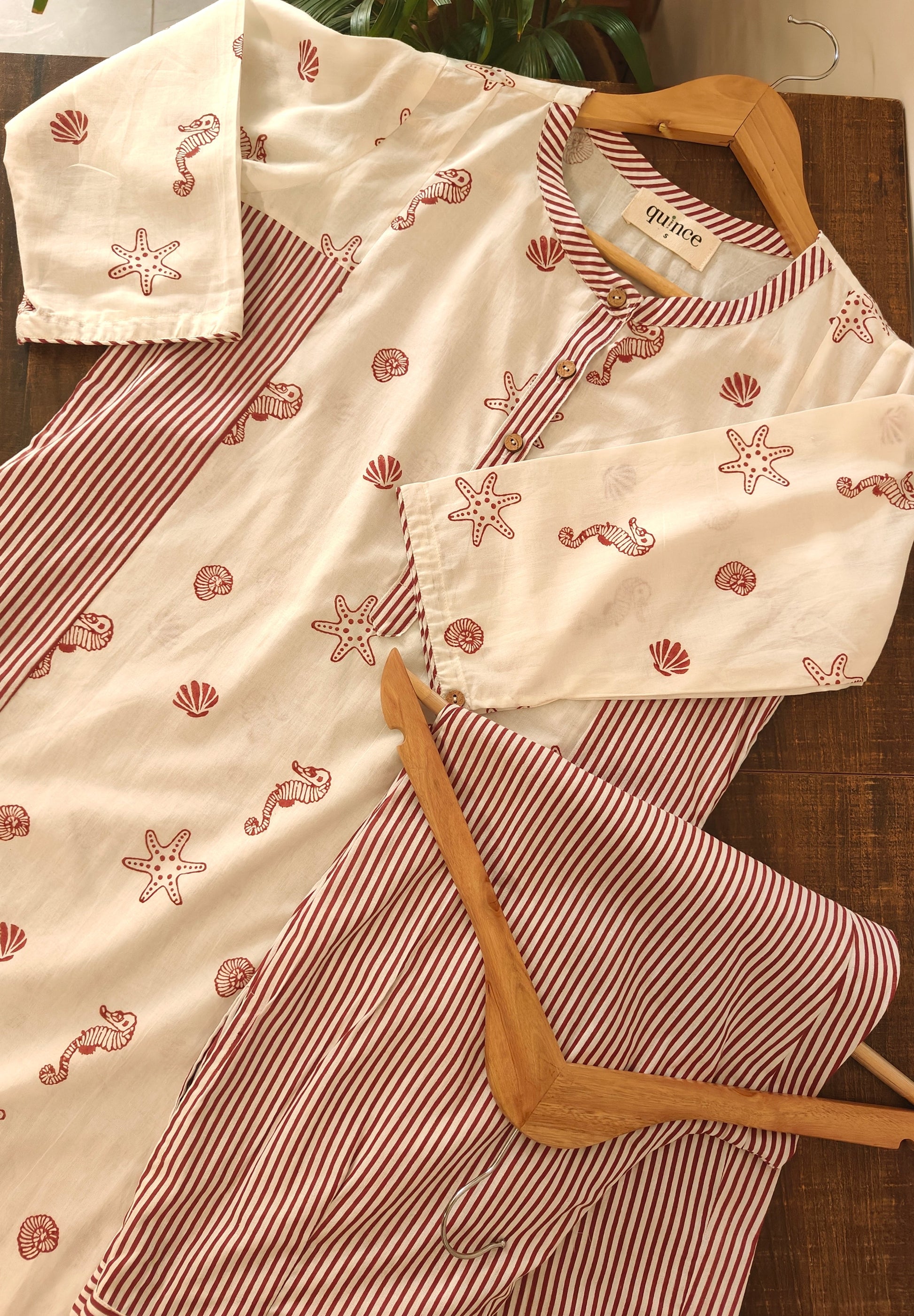 Step into summer vibes with our newest kurta set! Crafted from soft, premium cotton, this duo features charming Sea treasure paired with trendy stripes. Perfectly versatile, it’s your go-to for everything from office hours and school days to relaxed weekends and everyday adventures.