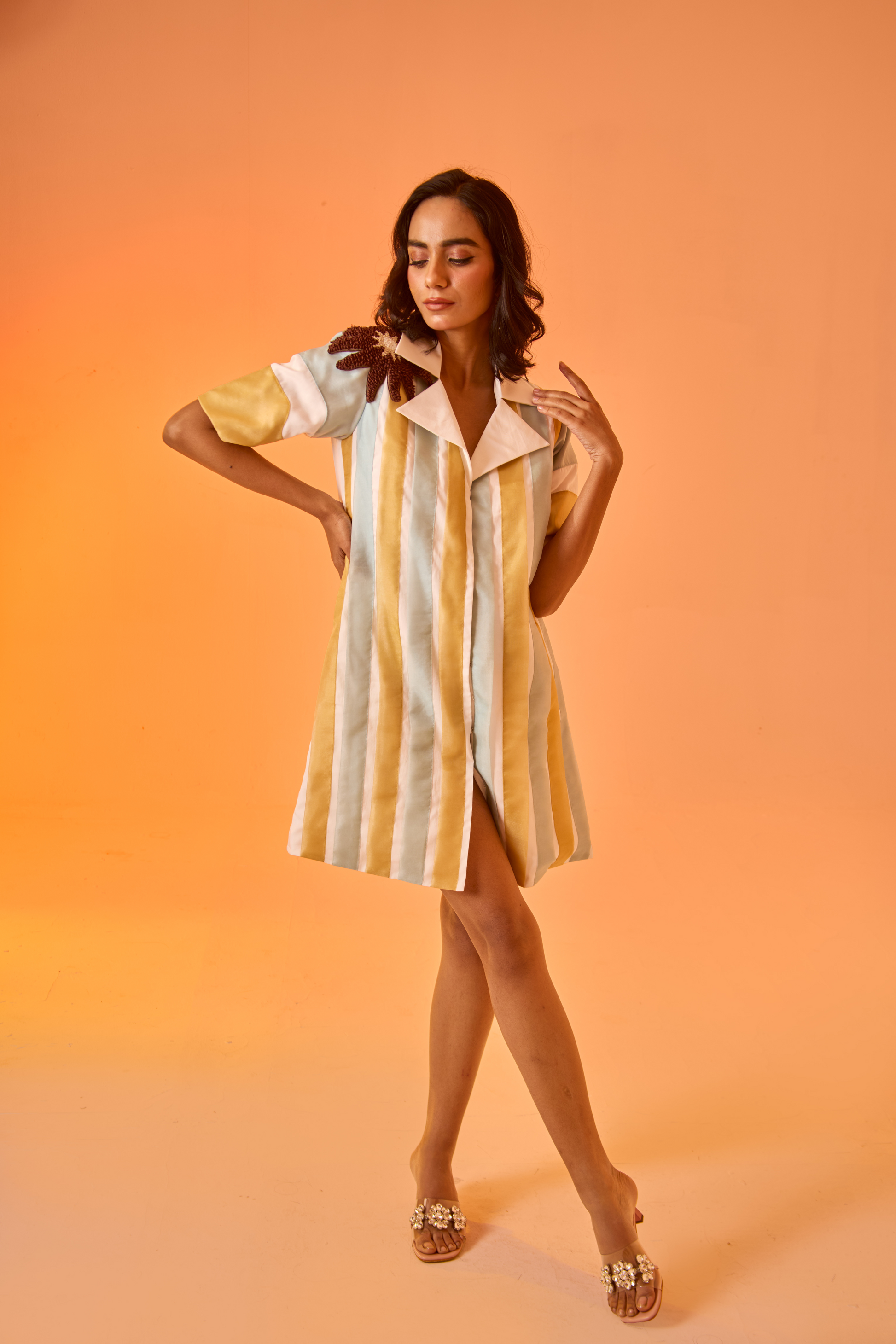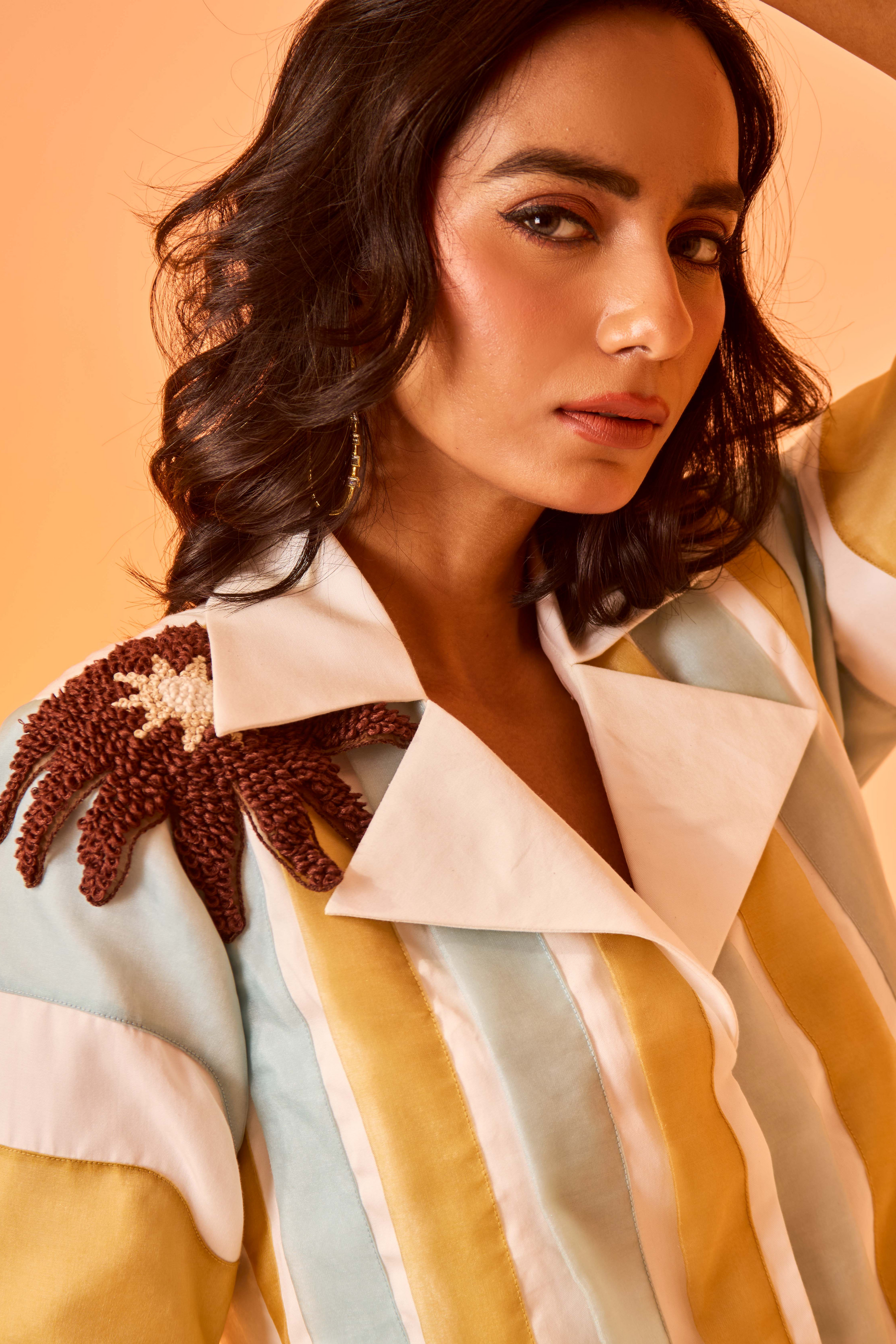 Designed for the bold and the elegant—this jacket dress showcases sheer organza overlay stripes that create a play of texture, complemented by striking statement shoulder patchwork for a commanding look.