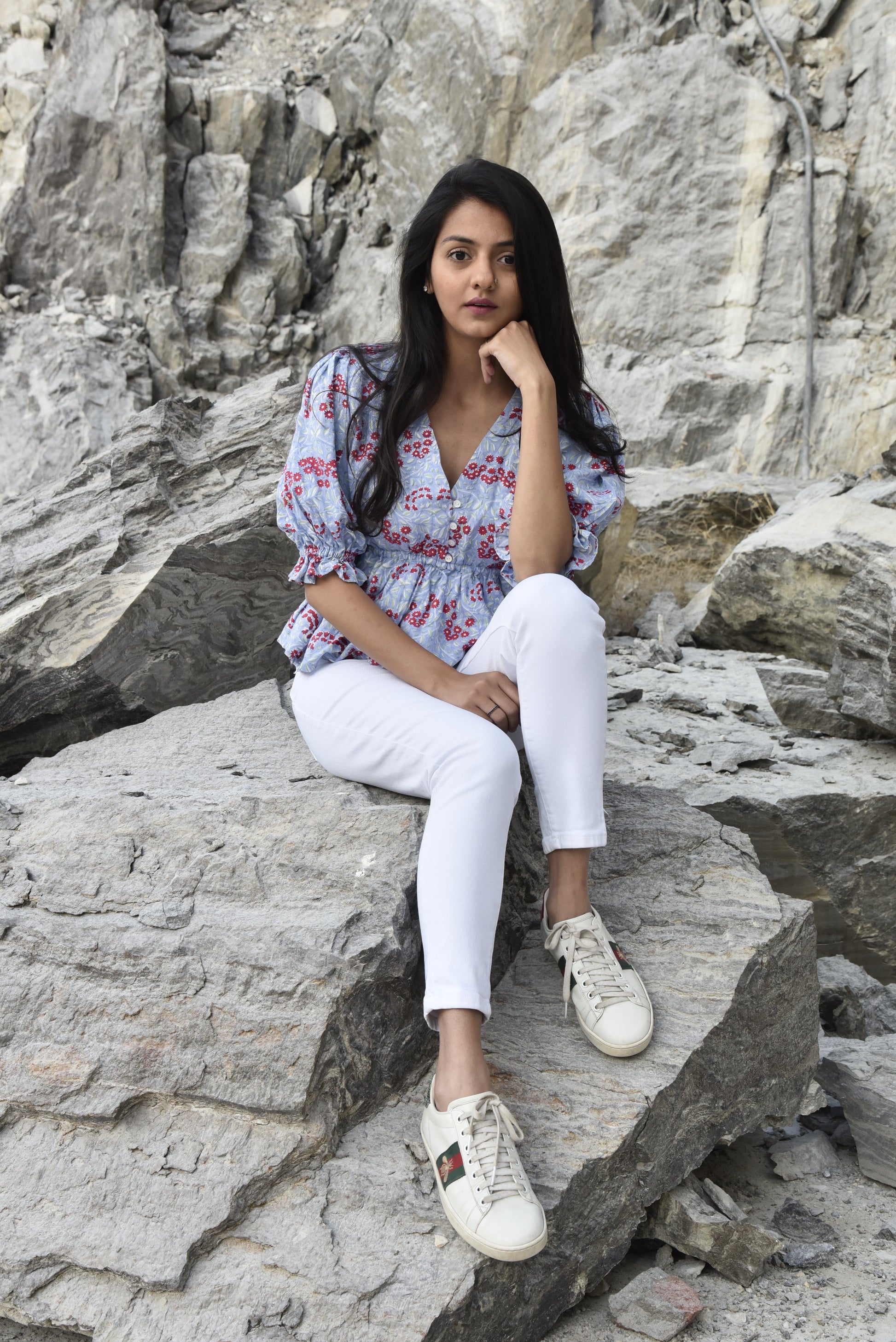 Seifuku Top - Stylish Blue Floral Motif Top with Puffed Sleeves