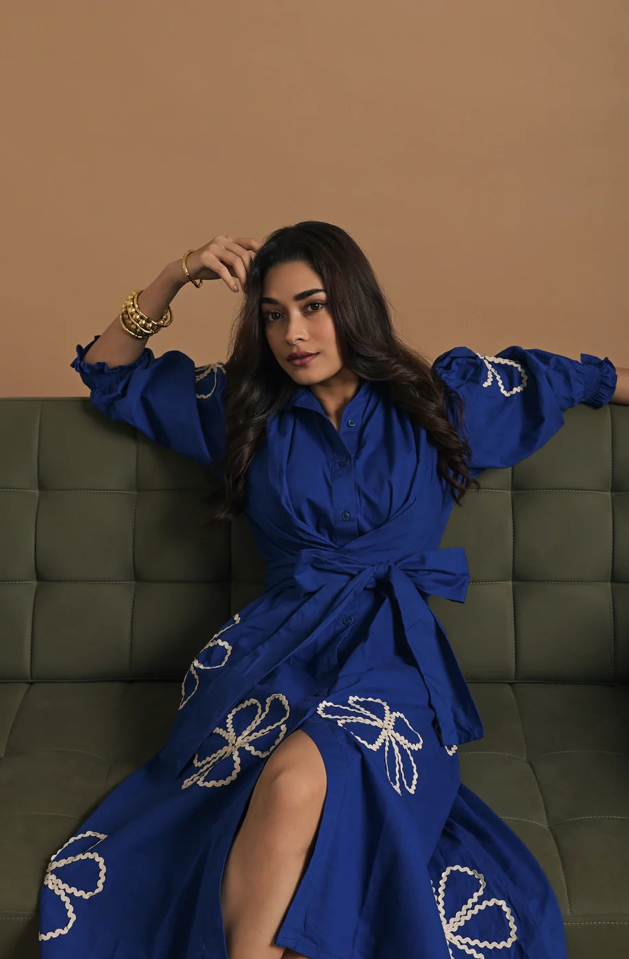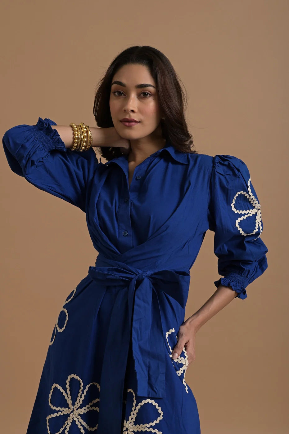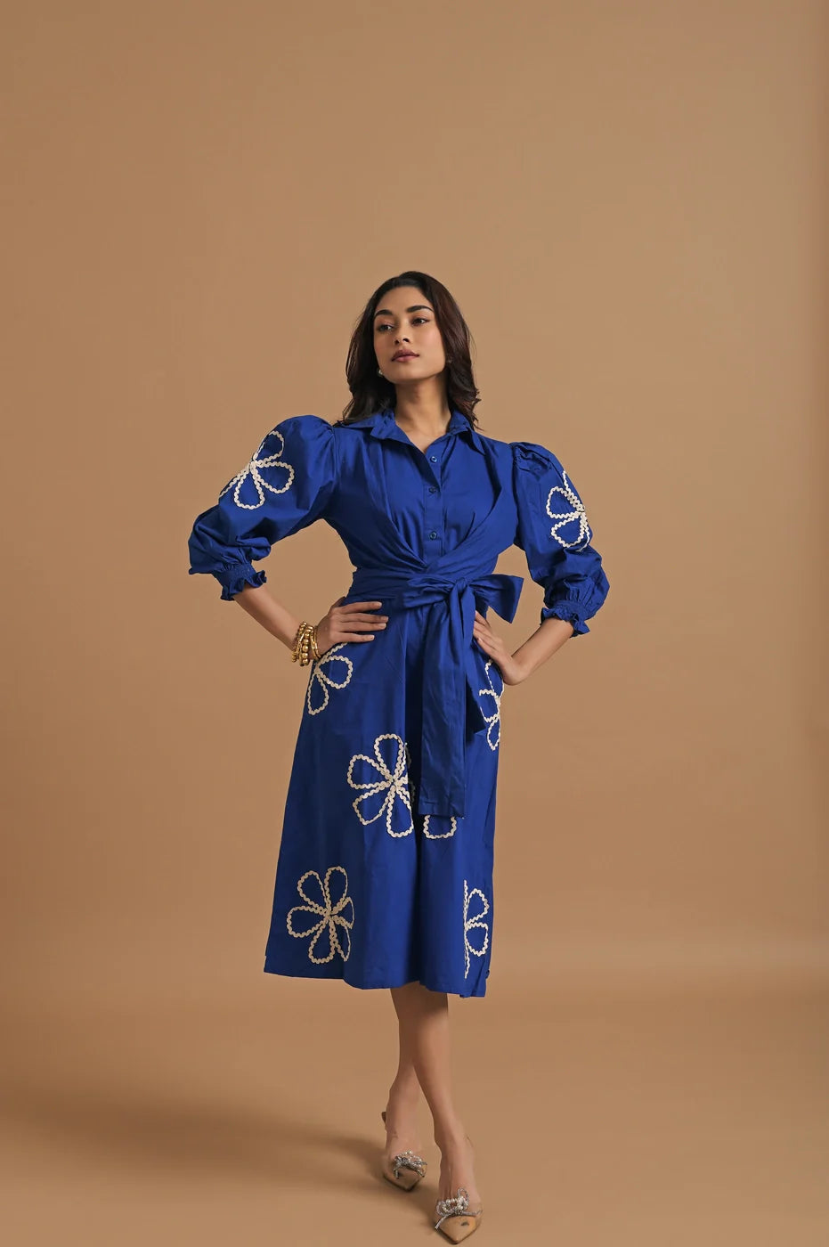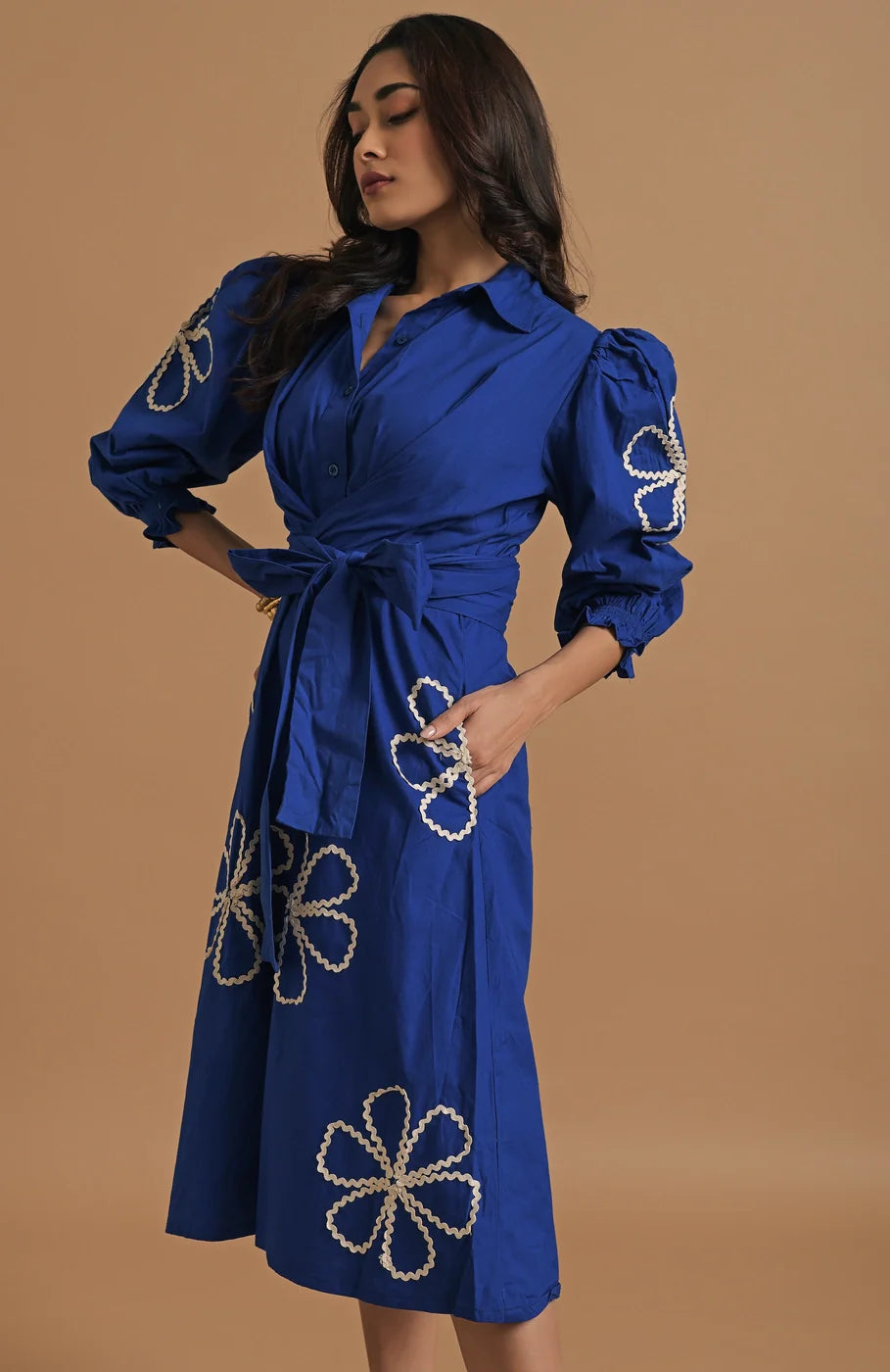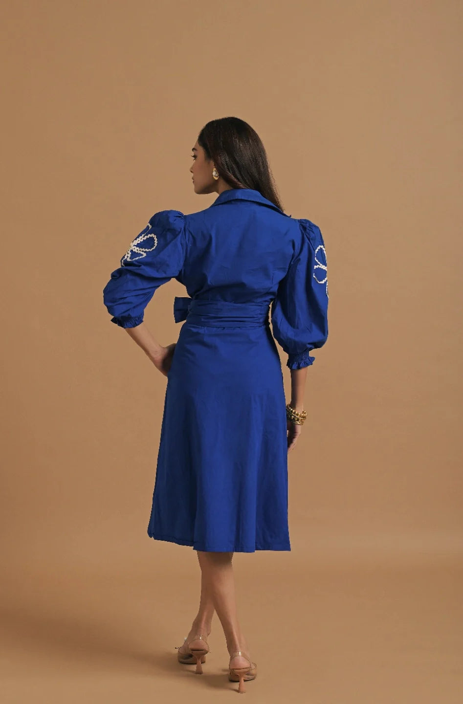 Command attention in this striking royal blue midi dress, crafted from crisp, breathable cotton for day-to-evening elegance. The dress features a structured shirt collar, a button-down front, and full-length puffed sleeves with gathered cuffs, creating a perfect balance between sharp tailoring and feminine flair.