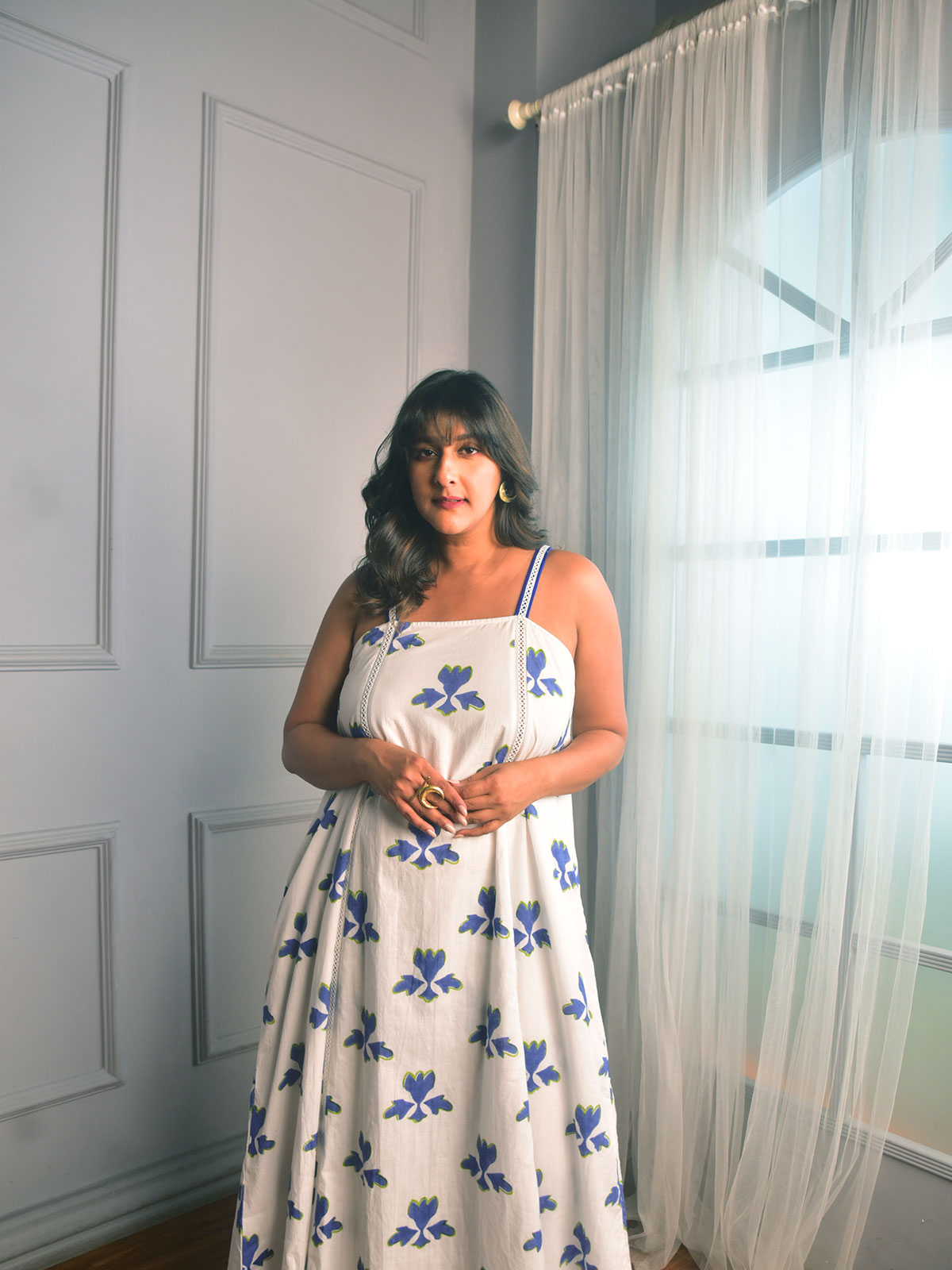 This strappy kurta set is crafted for picture-perfect festive moments. Cut in our exclusive blue and white floral block-printed cotton, lace detailed Kurta with a matching Flared pants for a complete festive look.