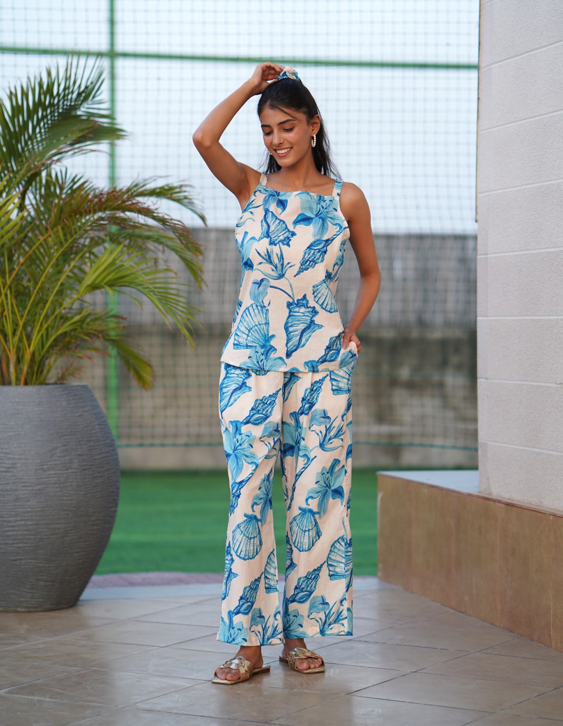 Searching for show-stopping resort wear? Your hunt ends here! Our vibrant blue shell print top is the perfect fresh pick for your vacation wardrobe. Available as a pants or a shorts—choose your fave and slay that holiday style!