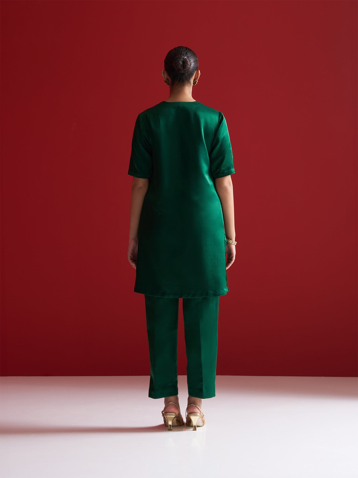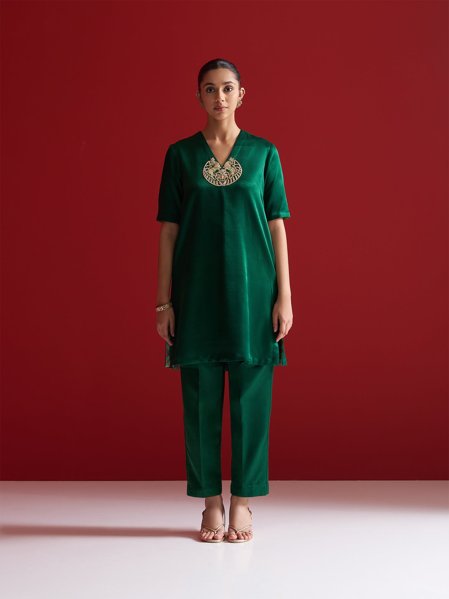 This kurta set is a celebration of heritage artistry and timeless elegance. The neckline is adorned with intricate hand embroidery featuring dabka, cutdana, resham, and naqshi work, forming a striking yali motif that depicts duality of power and grace. It is paired with straight-fit pants crafted in gajji silk.