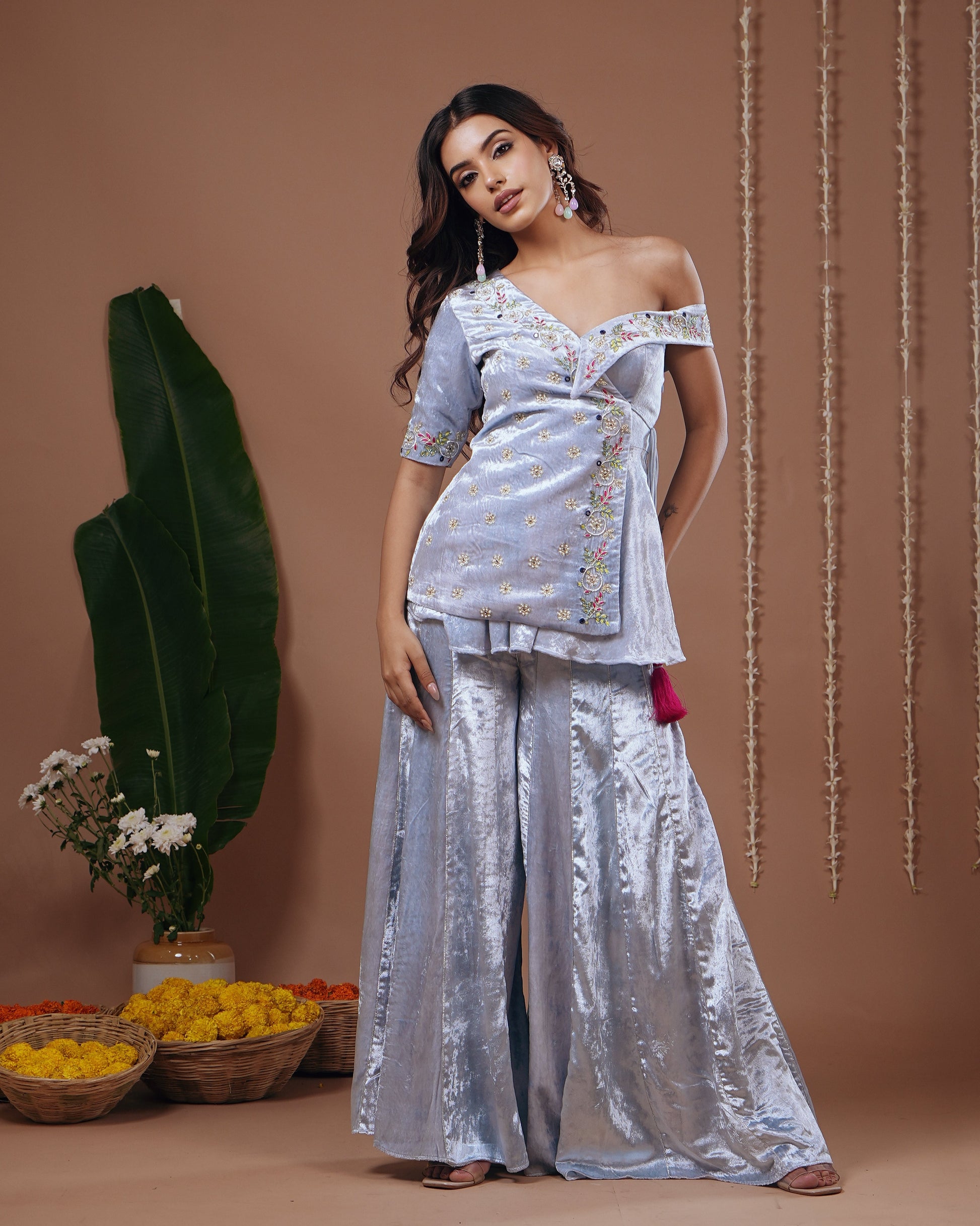 Asymmetrical off-shoulder tunic with a peplum-style flare.