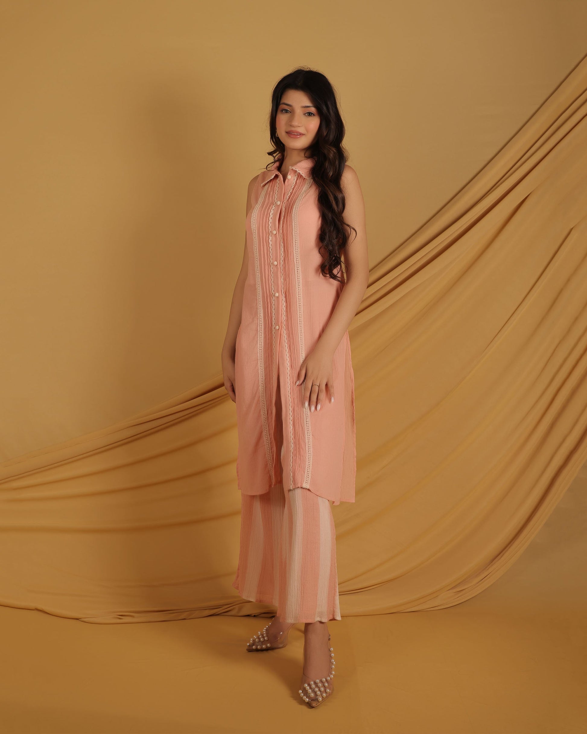Sleeveless collared kurta in a soft peach hue featuring a front placket adorned with intricate white lace, crochet buttons and subtle pleats. Paired with cotton crepe vertical stripe yarn dyed fabric perfect for warm weather and casual chic occasions. Comes in a set of 2.