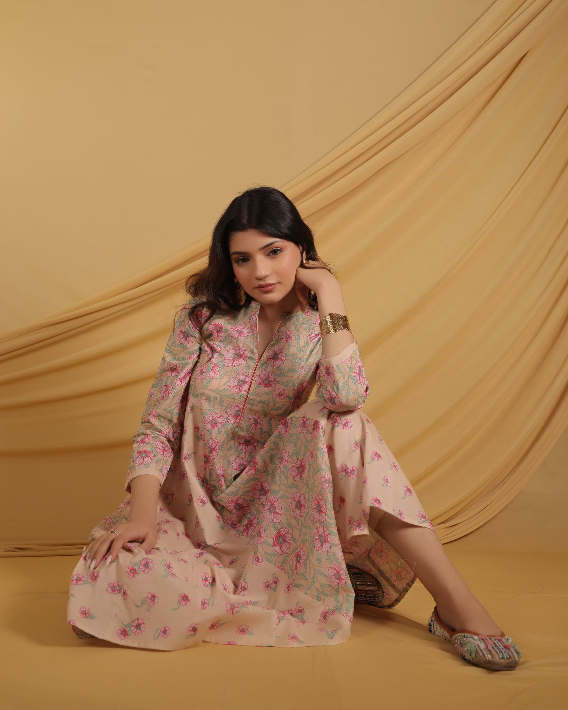This two-piece set features a light beige kurta and matching pants, both adorned with a delicate floral print in shades of pink and green. The kurta has a mandarin collar with the neck featuring a subtle thread work detailing.The pants have a straight-leg cut. Crafted from a lightweight fabric, this ensemble is perfect for everyday wear, adding a touch of effortless elegance to your look.