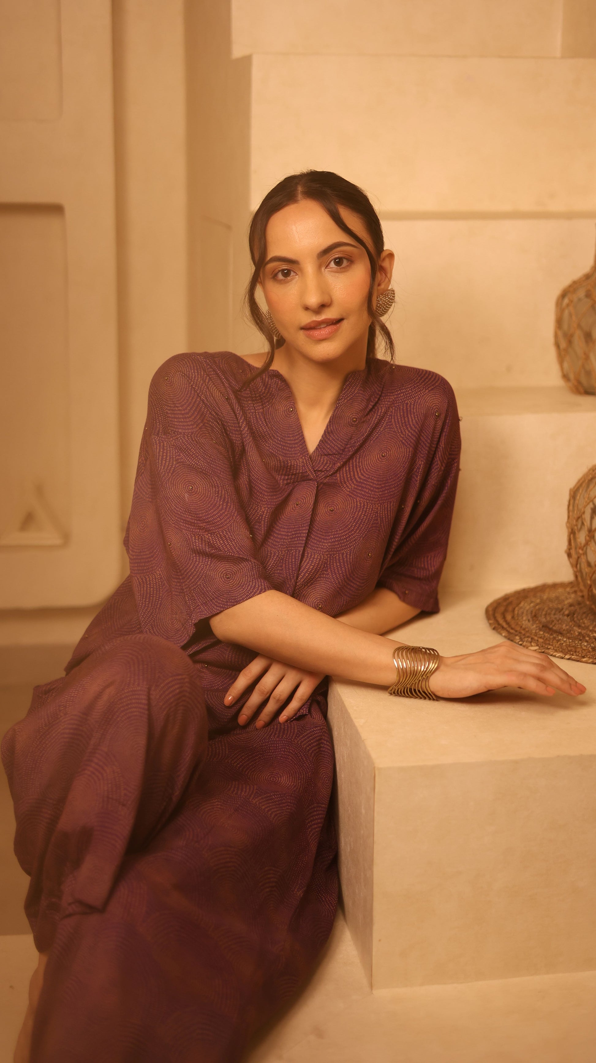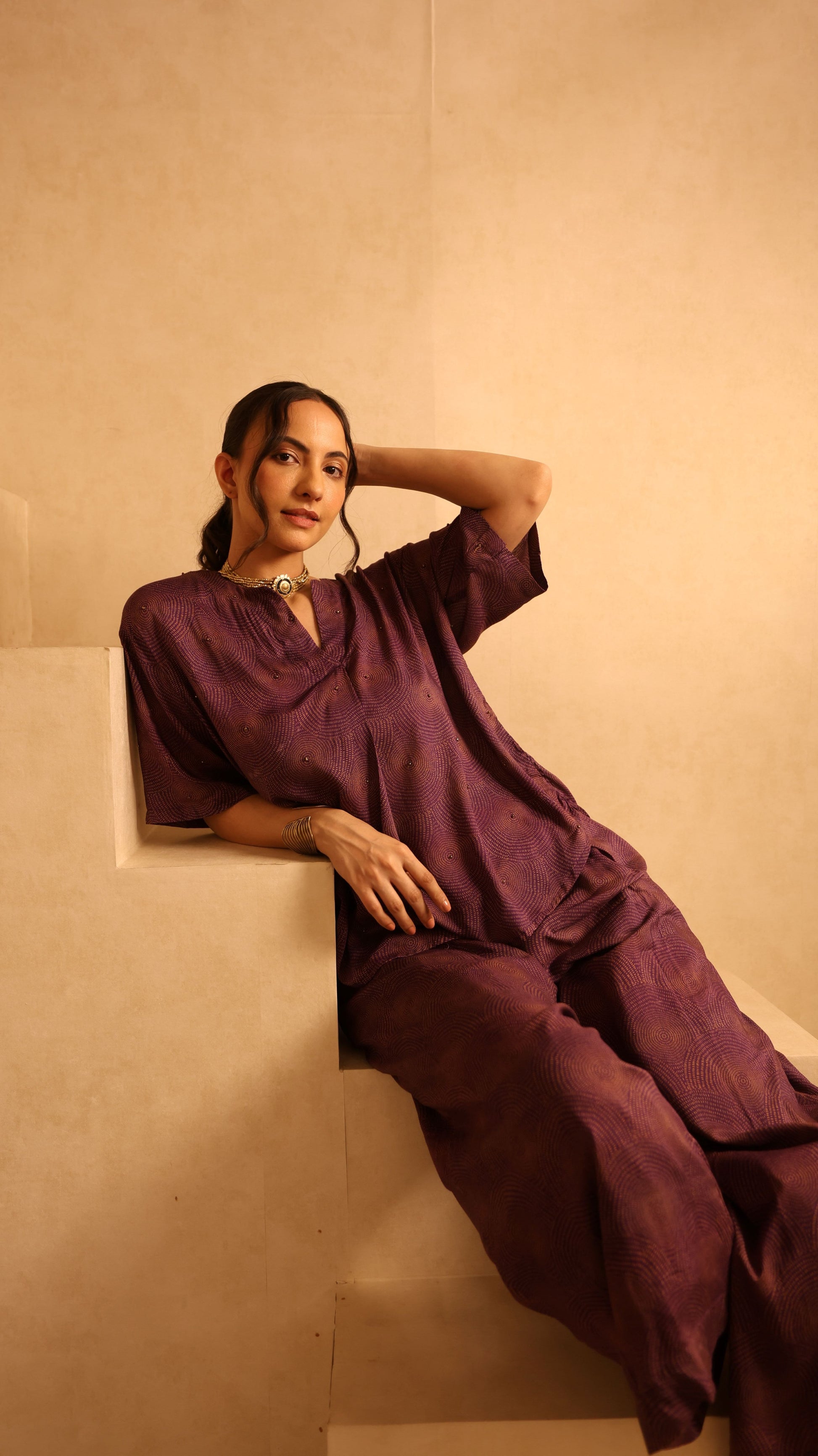 This gorgeous deep purple Stardust Coord Set features a free-size printed top and pleated flared pants. It’s the ideal duo to style up or keep casual—whether for a cozy dinner or a lively birthday bash.