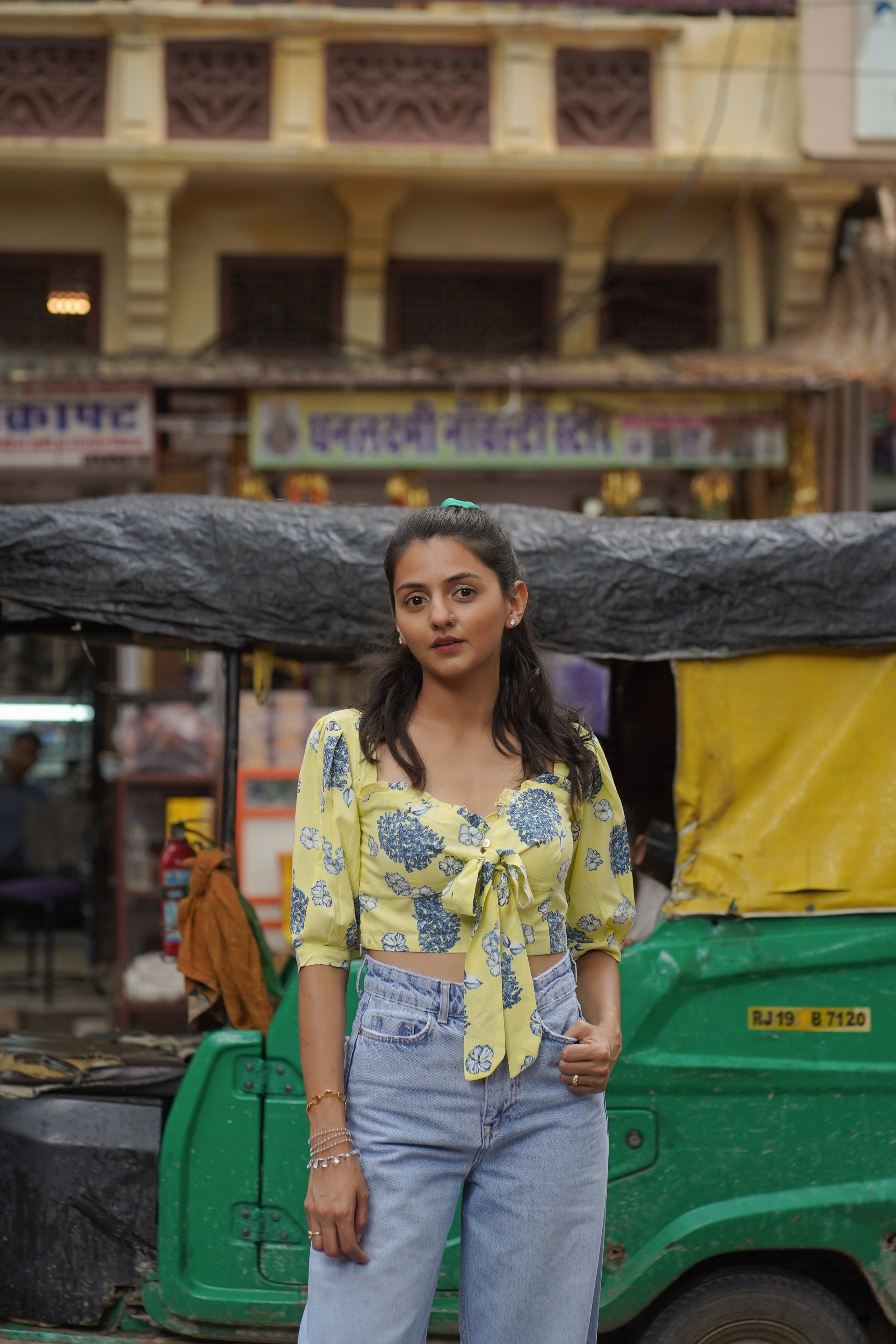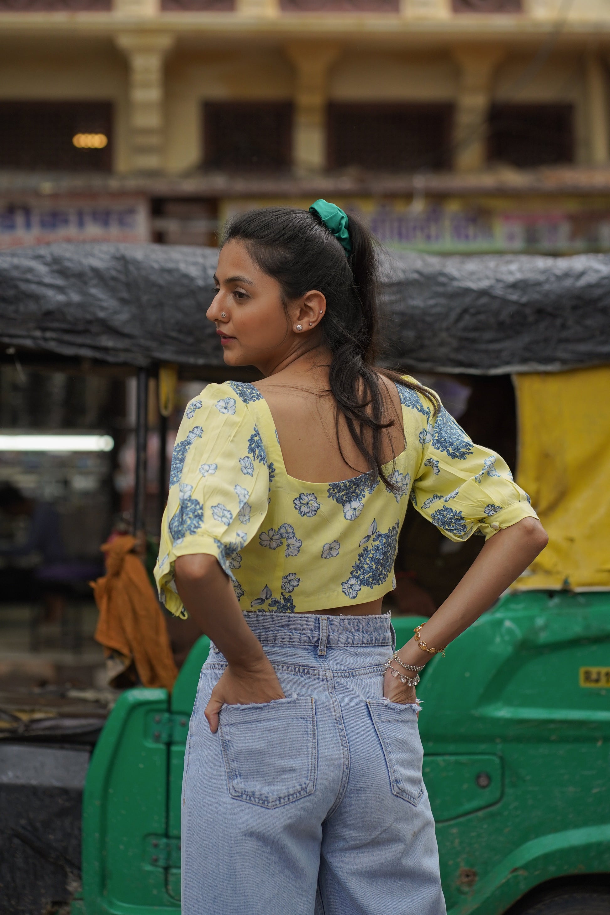 Starfield- Yellow Hydrangea Print with Ruffles and Puffed Sleeves