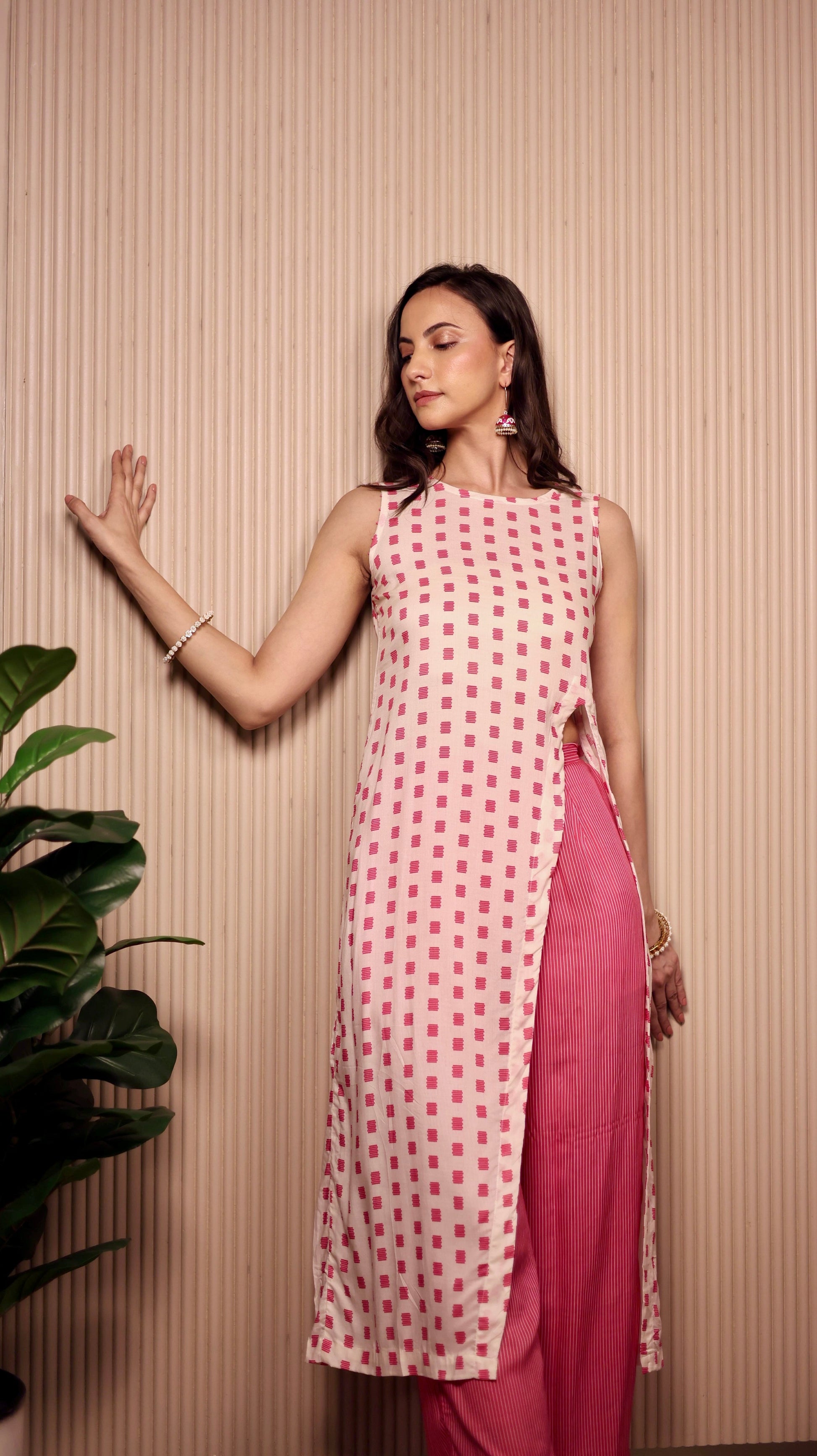 Introducing our starry nights coord set, crafted from airy modal fabric that feels smooth and flows gracefully. Light yet structured, it moves with you while maintaining a sleek silhouette. The soft cream base is dotted with delicate rose squares, creating a subtle and charming design. With a relaxed, straight fit, the vertical prints elongate your figure. A long side slit on one side of the kurta adds a stylish twist. Wear the set together for a coordinated look or mix and match to express your own playful style!